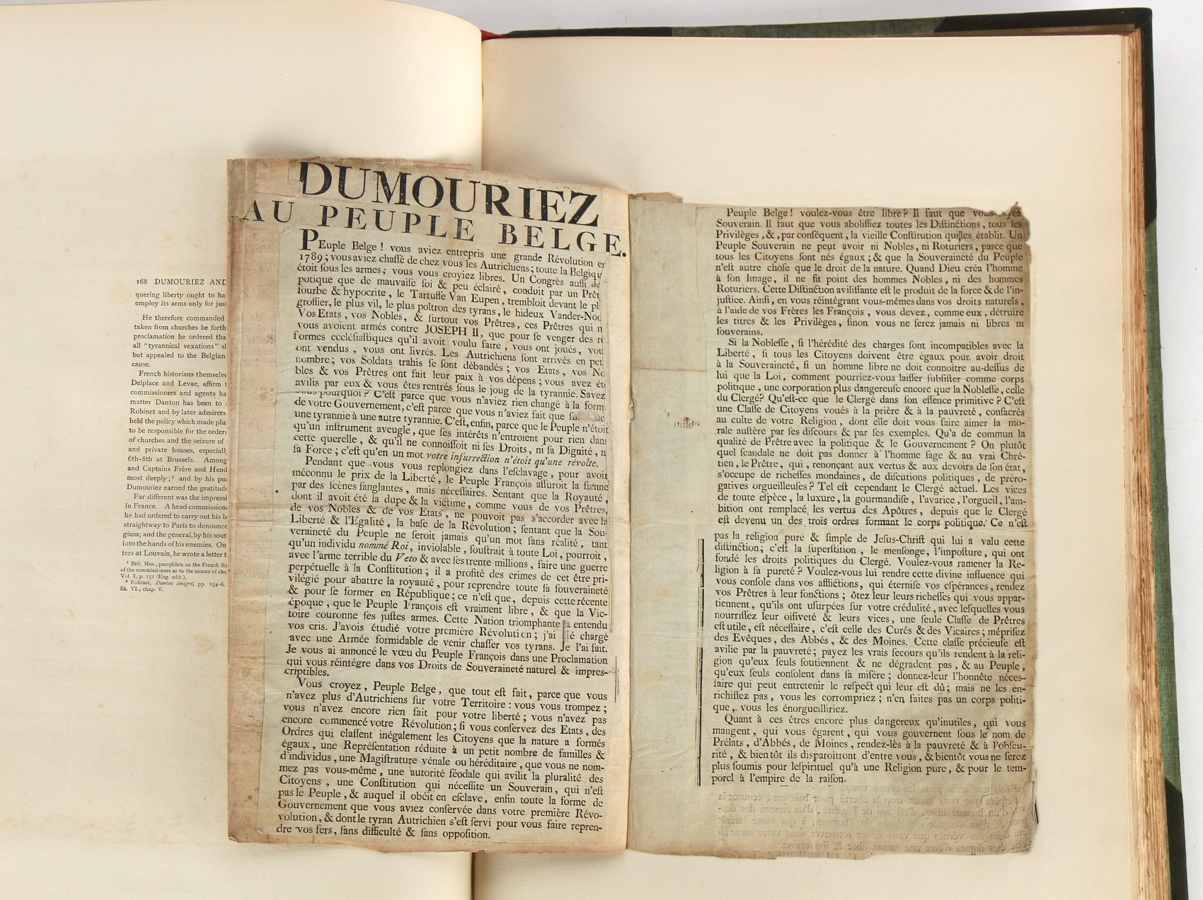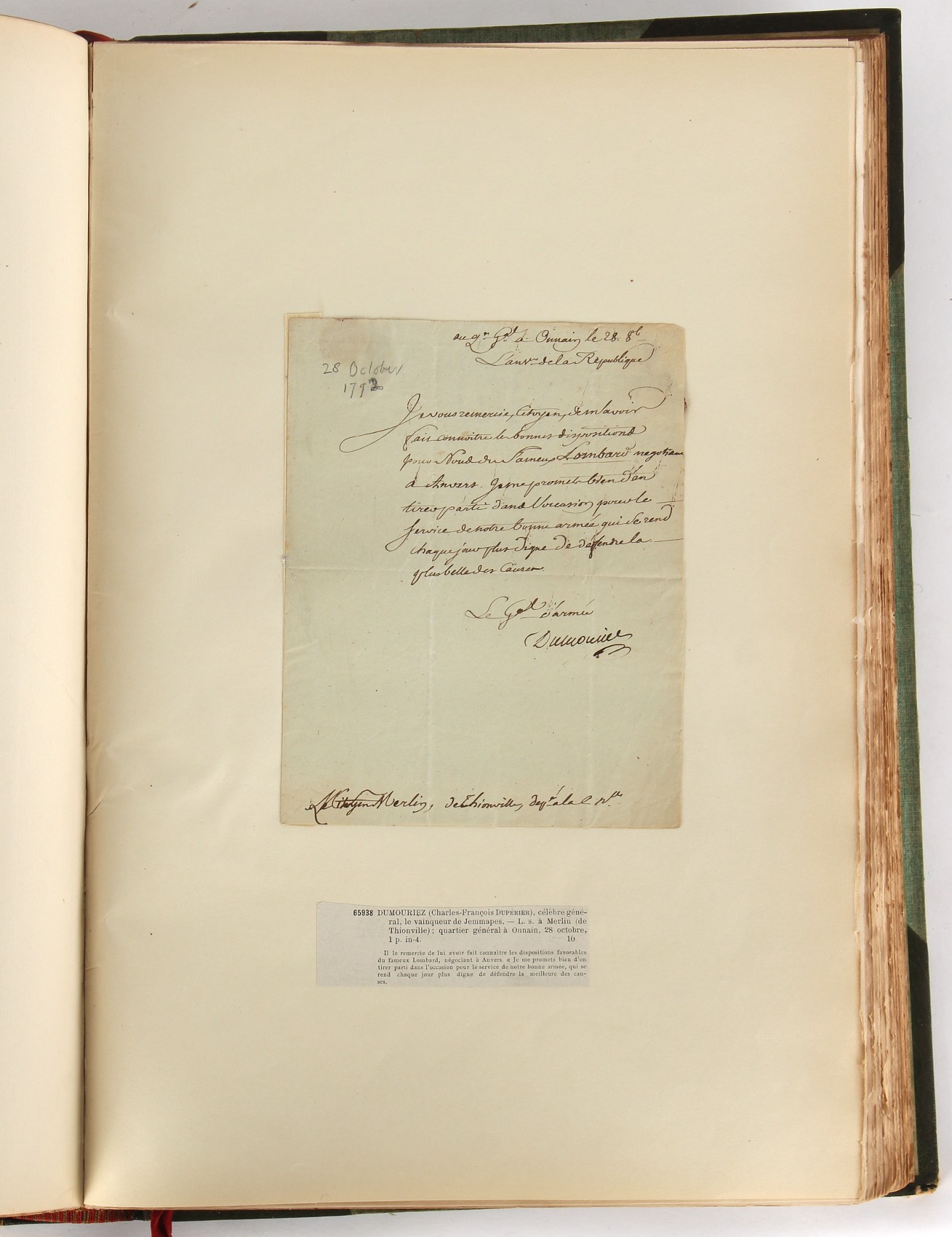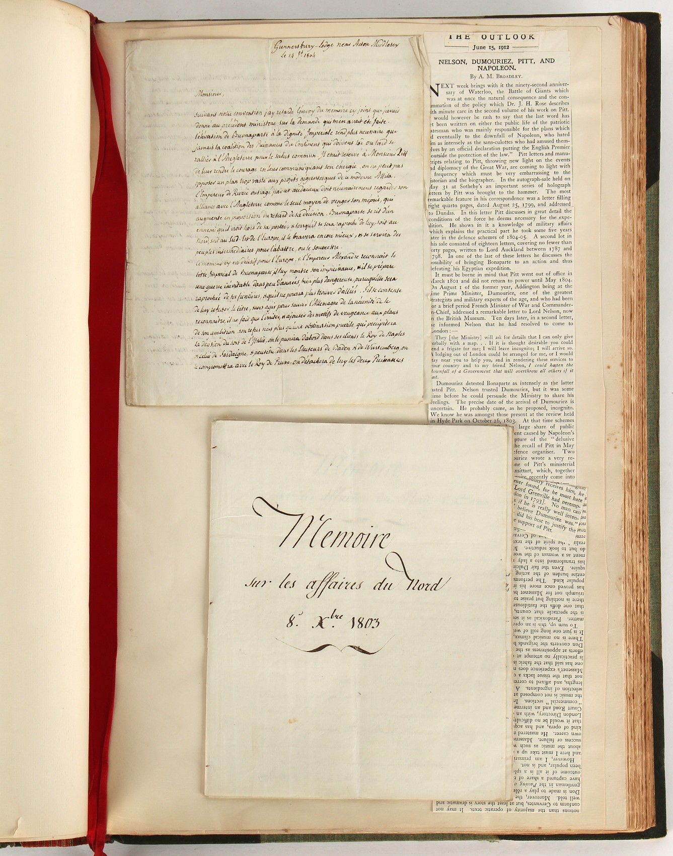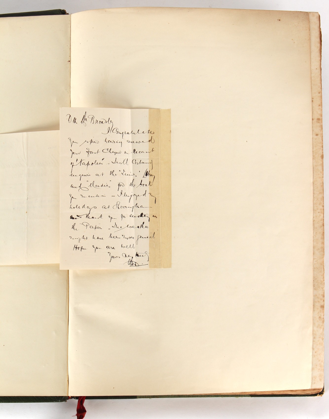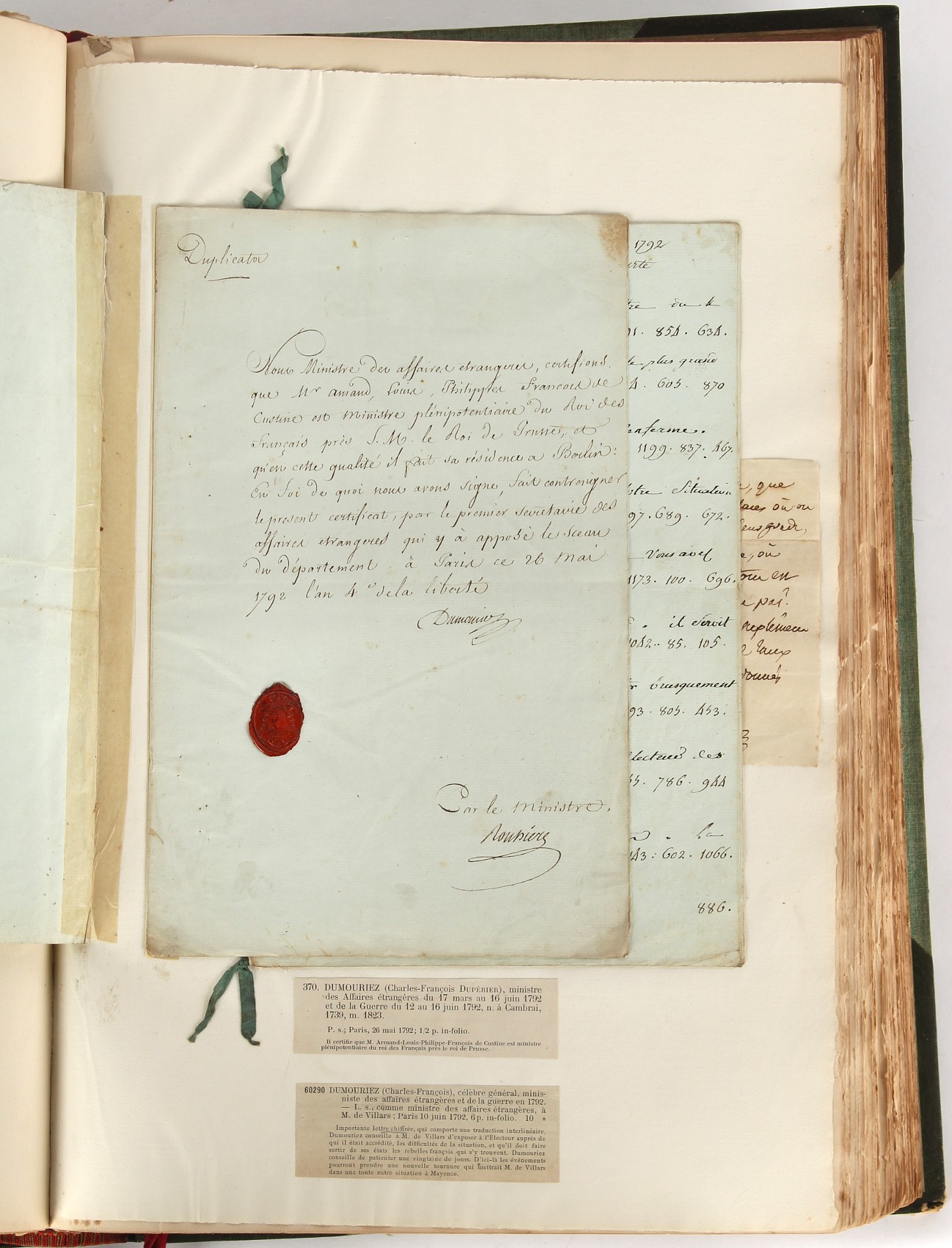 Property of a lady - Napoleonic historical interest - BROADLEY, Alexander Meyrick, and ROSE, John Holland - 'Dumouriez and the Defence of England against Napoleon' - two volume set, the personal 'Extra-Illustrated' or 'Grangerized' (or 'Grangerised') copies of Alexander Meyrick Broadley (1847-1916), London, John Lane, The Bodley Head, 1909, with tipped-in invoice from William Brendon & Son Limited Printers, Plymouth, dated 7th Sept. 1908 for £2 - - 'To one special copy pulled upon large paper, also 200 folio plain sheets', extra-illustrated or augmented with a large quantity of contemporarily hand-coloured and monochrome cartoon or caricature satirical prints, original drawings & watercolours, printed broadsides, etc., each affixed at the edges only into a window cut in to each plain folio sheet (so that backs are open & visible), Volume One including six tipped-in manuscript letters from Herbert H. Raphael (Major Sir Herbert Henry Raphael, 1st Baronet, 1859–1924) and twenty-six tipped-in manuscript letters from John Holland Rose (1855-1942) and two manuscript letters (one being four-sided) from Field Marshal Lord Roberts (1832-1914), and many other ms letters including some from Cambrai (Cambray), France (where Dumouriez was born), and the publishers (including the original contract between the authors and the publishers), all regarding the book and its compilation, also including twelve original ink manuscript letters by the subject of the book Charles Francois du Perier Dumouriez (1739-1823) (a further 16 letters by him are in Volume Two), the first dated 1765, the second (four sided) from Versailles dated 1772, the third (four sided) dated 1782, the fourth, fifth, sixth, seventh, eighth, ninth and tenth all dated 1792 when Dumouriez was Ministre des Affairs Etrangeres, Ministre de la Guerre, and Chef de L'Armee du Nord, an important ink manuscript letter from Dumouriez dated 1793 (two sided) consulting Charles James Fox on finding refuge in London (with letter from the dealer P.F. Madigan in Fifth Avenue, New York, regarding Boardley's purchase of this letter for $40), another ms letter from Dumouriez (two sided) dated 1796, and another from Antoine-Marie Chamans de Lavallette (Directeur General des Postes under Napoleon), the prints including Piercy Roberts after George Murgatroyd Woodward - 'John Bull and His Friends Commemorating The Peace' (1802); 'A Cock and Bull Story' (1803), published by Percy Roberts; a small pencil drawing portrait of Dumouriez initialled J.D. and dated 9 Oct. '69; 'La Retour en Angleterre' (we can find no record of this print); 'Carte des Descentes Faites en Angleterre et en Irlande Depuis Guillaume la Conquérant jusqu'à nos jours' (Map of the Invasions of England and Ireland from William the Conqueror to the Present) (1798), hand-coloured, with accompanying text; 'Capture of Bonaparte's Carriage', published by Edwards, 1818; a signed watercolour by G. Heberden entitled 'Genl. Dumouriez marching the Sans Culottes into Holland', 19.5 by 32.5cms.; 'A Dose for Dumourier, Evacuation of Holland and Brabant' (monochrome); and James Gillray - 'Dumourier dining in state at St James's, on the 15th of May, 1793' (monochrome), Volume Two including numerous broadsides or notices, some anti-Napoleon propaganda, one a folding monochrome broadside entitled 'An ABSTRACT of An Act for providing an Augmentation to the MILITIA, to be trained and exercised in the Manner therein directed; and for enabling His Majesty to cause the same to be embodied, in case of Necessity, for the Defence of these Kingdoms', printed by George Eyre and Andrew Strahan, 1796; lists of recruited foreign soldiers, etc.; an 'Army of Reserve Act' broadside for the Parish of St. Clement Danes, dated 1803; a Jan Kip folded engraving of Lulworth Castle entitled 'Lullworth Castle in Dorsetshire, The Seat of Humphry Weld'; other folding maps; several printed patriotic song scores of the period; a ms autograph ink sheet entitled 'Verses written on the threatened Invasion', by B. Atkinson of Bath'; a contemporary 60-page plus index ink ms booklet entitled 'Internal Defence of Essex', listing the names & number of carts & horses for each village or town to be called upon in the event of invasion; a printed list of 'Loyal Colchester Volunteers', dated July 1803; this second volume also includes a further 16 ink ms letters by Dumouriez dating from 1804 to 1822; and much more (helpfully, Broadley added a ms index of the extra illustrations); each volume approximately 20.5 by 14ins. (52 by 35.5cms.) (overall) (2). Footnote - Alexander Meyrick Broadley (1847-1916) was a British author, barrister, collector and social figure, known for defending Ahmed 'Urabi after the Urabi Revolt. Broadley penned numerous historical works later in life, particularly regarding Napoleon and his era. Among the works he authored or co-authored are 'Napoleon and the Invasion of England: The Story of the Great Terror' (London, 1908); 'Nelson’s Hardy: His Life, Letters and Friends' (London, 1909); 'Napoleon in Caricature 1795-1821' (London, 1911); and 'Napoleon in Exile' (London, 1914). Broadley was known as a celebrated grangeriser (or extra-illustrator) of books, and one of his greatest achievements was the creation, with the assistance of Daniell, of an extra-illustrated set of Rose’s 'Life of Napoleon I' and Rosebery’s 'Napoleon. The Last Phase', by inlaying and extending the works from three octavo to twenty-eight folio volumes with engravings, portraits, manuscripts, autograph letters, etc. over a period of four years. This monumental work was bought by George Nathaniel Curzon, Marquess Curzon of Kedleston at the auction of Broadley’s library held in four sales between 1916 and 1918, and Curzon later bequeathed the set to the Bodleian Library, Oxford.