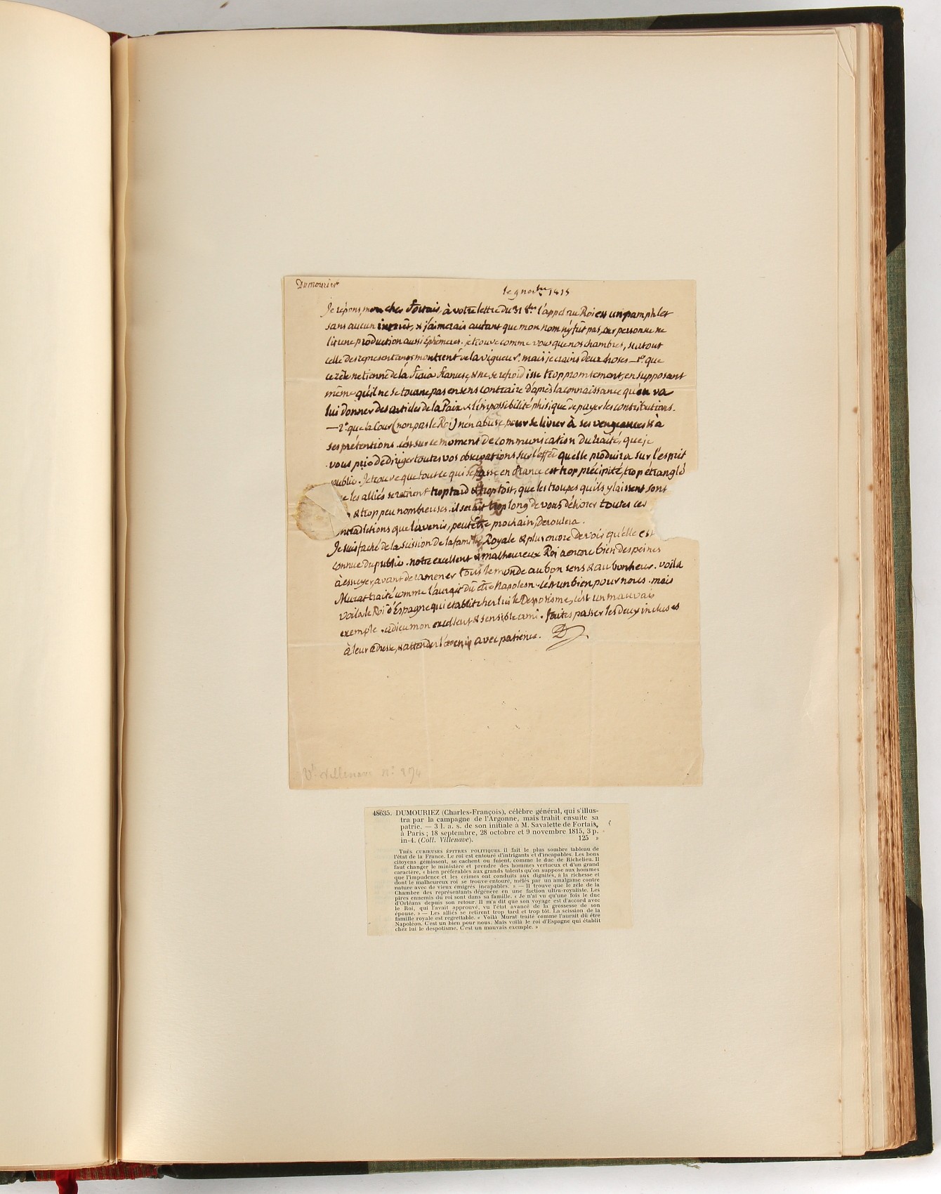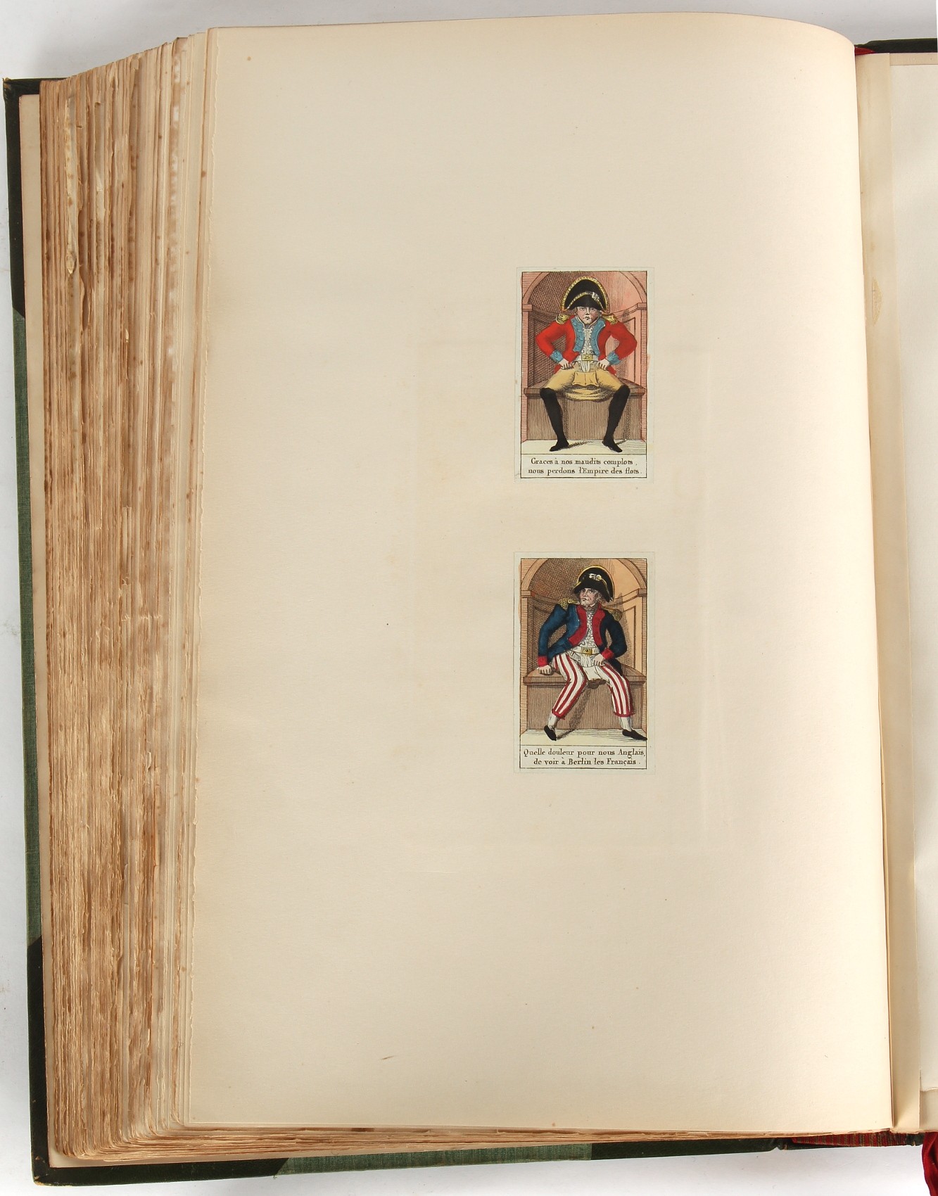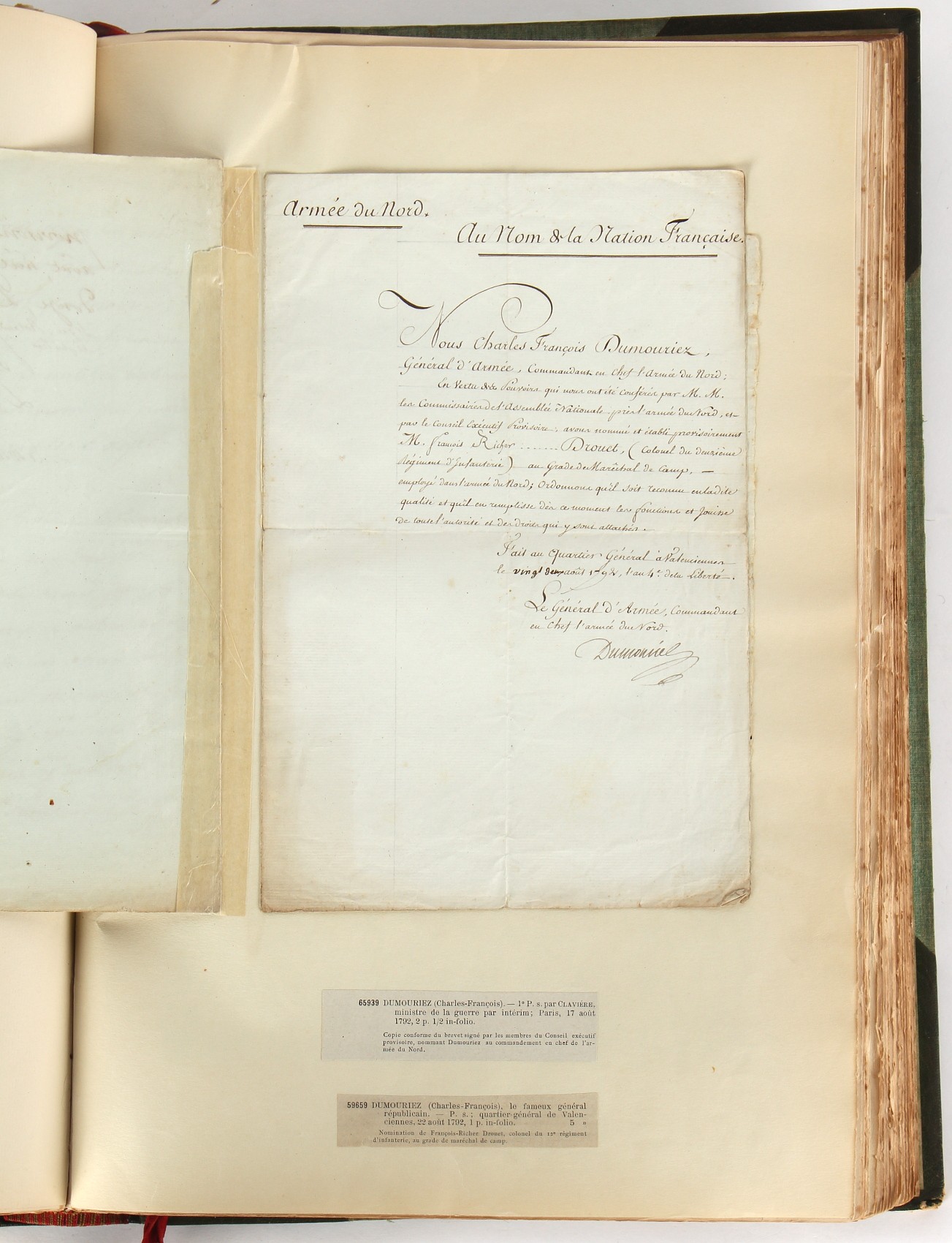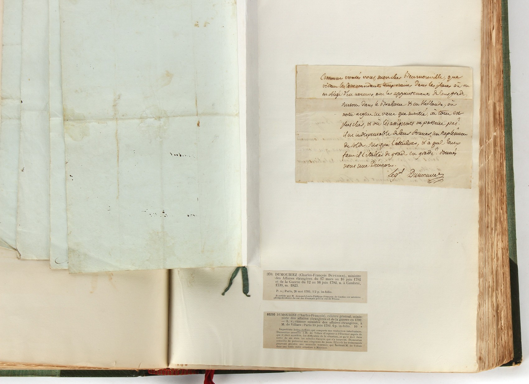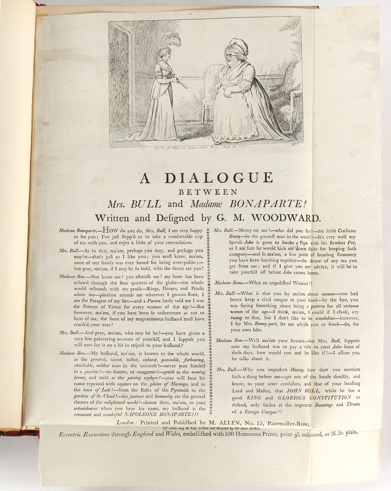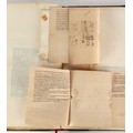 Property of a lady - Napoleonic historical interest - BROADLEY, Alexander Meyrick, and ROSE, John Holland - 'Dumouriez and the Defence of England against Napoleon' - two volume set, the personal 'Extra-Illustrated' or 'Grangerized' (or 'Grangerised') copies of Alexander Meyrick Broadley (1847-1916), London, John Lane, The Bodley Head, 1909, with tipped-in invoice from William Brendon & Son Limited Printers, Plymouth, dated 7th Sept. 1908 for £2 - - 'To one special copy pulled upon large paper, also 200 folio plain sheets', extra-illustrated or augmented with a large quantity of contemporarily hand-coloured and monochrome cartoon or caricature satirical prints, original drawings & watercolours, printed broadsides, etc., each affixed at the edges only into a window cut in to each plain folio sheet (so that backs are open & visible), Volume One including six tipped-in manuscript letters from Herbert H. Raphael (Major Sir Herbert Henry Raphael, 1st Baronet, 1859–1924) and twenty-six tipped-in manuscript letters from John Holland Rose (1855-1942) and two manuscript letters (one being four-sided) from Field Marshal Lord Roberts (1832-1914), and many other ms letters including some from Cambrai (Cambray), France (where Dumouriez was born), and the publishers (including the original contract between the authors and the publishers), all regarding the book and its compilation, also including twelve original ink manuscript letters by the subject of the book Charles Francois du Perier Dumouriez (1739-1823) (a further 16 letters by him are in Volume Two), the first dated 1765, the second (four sided) from Versailles dated 1772, the third (four sided) dated 1782, the fourth, fifth, sixth, seventh, eighth, ninth and tenth all dated 1792 when Dumouriez was Ministre des Affairs Etrangeres, Ministre de la Guerre, and Chef de L'Armee du Nord, an important ink manuscript letter from Dumouriez dated 1793 (two sided) consulting Charles James Fox on finding refuge in London (with letter from the dealer P.F. Madigan in Fifth Avenue, New York, regarding Boardley's purchase of this letter for $40), another ms letter from Dumouriez (two sided) dated 1796, and another from Antoine-Marie Chamans de Lavallette (Directeur General des Postes under Napoleon), the prints including Piercy Roberts after George Murgatroyd Woodward - 'John Bull and His Friends Commemorating The Peace' (1802); 'A Cock and Bull Story' (1803), published by Percy Roberts; a small pencil drawing portrait of Dumouriez initialled J.D. and dated 9 Oct. '69; 'La Retour en Angleterre' (we can find no record of this print); 'Carte des Descentes Faites en Angleterre et en Irlande Depuis Guillaume la Conquérant jusqu'à nos jours' (Map of the Invasions of England and Ireland from William the Conqueror to the Present) (1798), hand-coloured, with accompanying text; 'Capture of Bonaparte's Carriage', published by Edwards, 1818; a signed watercolour by G. Heberden entitled 'Genl. Dumouriez marching the Sans Culottes into Holland', 19.5 by 32.5cms.; 'A Dose for Dumourier, Evacuation of Holland and Brabant' (monochrome); and James Gillray - 'Dumourier dining in state at St James's, on the 15th of May, 1793' (monochrome), Volume Two including numerous broadsides or notices, some anti-Napoleon propaganda, one a folding monochrome broadside entitled 'An ABSTRACT of An Act for providing an Augmentation to the MILITIA, to be trained and exercised in the Manner therein directed; and for enabling His Majesty to cause the same to be embodied, in case of Necessity, for the Defence of these Kingdoms', printed by George Eyre and Andrew Strahan, 1796; lists of recruited foreign soldiers, etc.; an 'Army of Reserve Act' broadside for the Parish of St. Clement Danes, dated 1803; a Jan Kip folded engraving of Lulworth Castle entitled 'Lullworth Castle in Dorsetshire, The Seat of Humphry Weld'; other folding maps; several printed patriotic song scores of the period; a ms autograph ink sheet entitled 'Verses written on the threatened Invasion', by B. Atkinson of Bath'; a contemporary 60-page plus index ink ms booklet entitled 'Internal Defence of Essex', listing the names & number of carts & horses for each village or town to be called upon in the event of invasion; a printed list of 'Loyal Colchester Volunteers', dated July 1803; this second volume also includes a further 16 ink ms letters by Dumouriez dating from 1804 to 1822; and much more (helpfully, Broadley added a ms index of the extra illustrations); each volume approximately 20.5 by 14ins. (52 by 35.5cms.) (overall) (2). Footnote - Alexander Meyrick Broadley (1847-1916) was a British author, barrister, collector and social figure, known for defending Ahmed 'Urabi after the Urabi Revolt. Broadley penned numerous historical works later in life, particularly regarding Napoleon and his era. Among the works he authored or co-authored are 'Napoleon and the Invasion of England: The Story of the Great Terror' (London, 1908); 'Nelson’s Hardy: His Life, Letters and Friends' (London, 1909); 'Napoleon in Caricature 1795-1821' (London, 1911); and 'Napoleon in Exile' (London, 1914). Broadley was known as a celebrated grangeriser (or extra-illustrator) of books, and one of his greatest achievements was the creation, with the assistance of Daniell, of an extra-illustrated set of Rose’s 'Life of Napoleon I' and Rosebery’s 'Napoleon. The Last Phase', by inlaying and extending the works from three octavo to twenty-eight folio volumes with engravings, portraits, manuscripts, autograph letters, etc. over a period of four years. This monumental work was bought by George Nathaniel Curzon, Marquess Curzon of Kedleston at the auction of Broadley’s library held in four sales between 1916 and 1918, and Curzon later bequeathed the set to the Bodleian Library, Oxford.