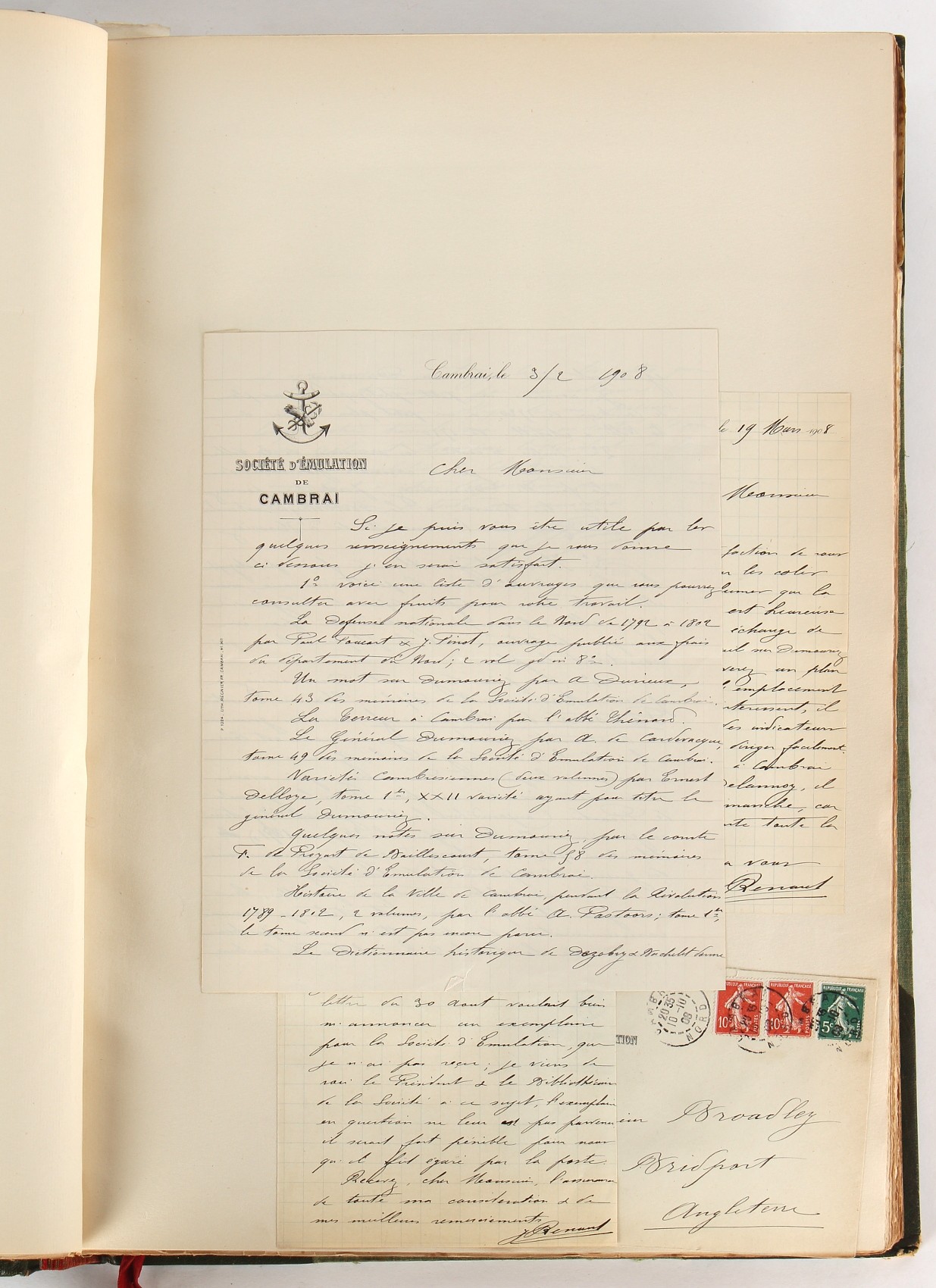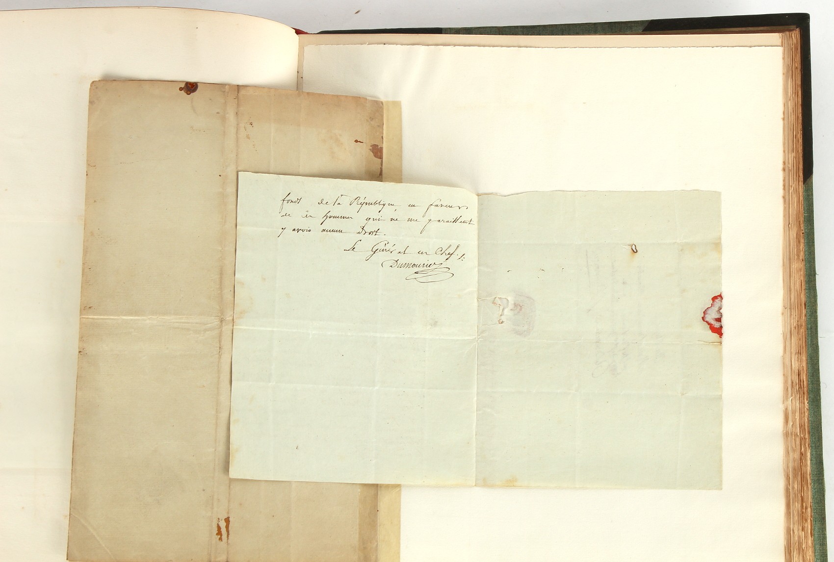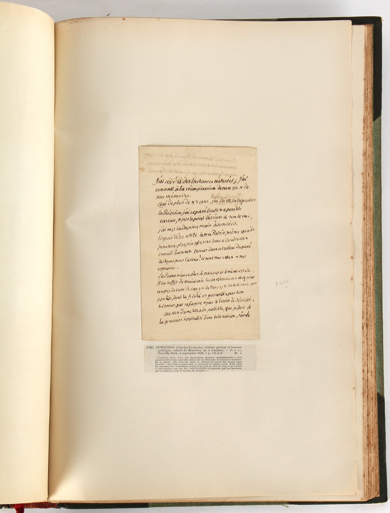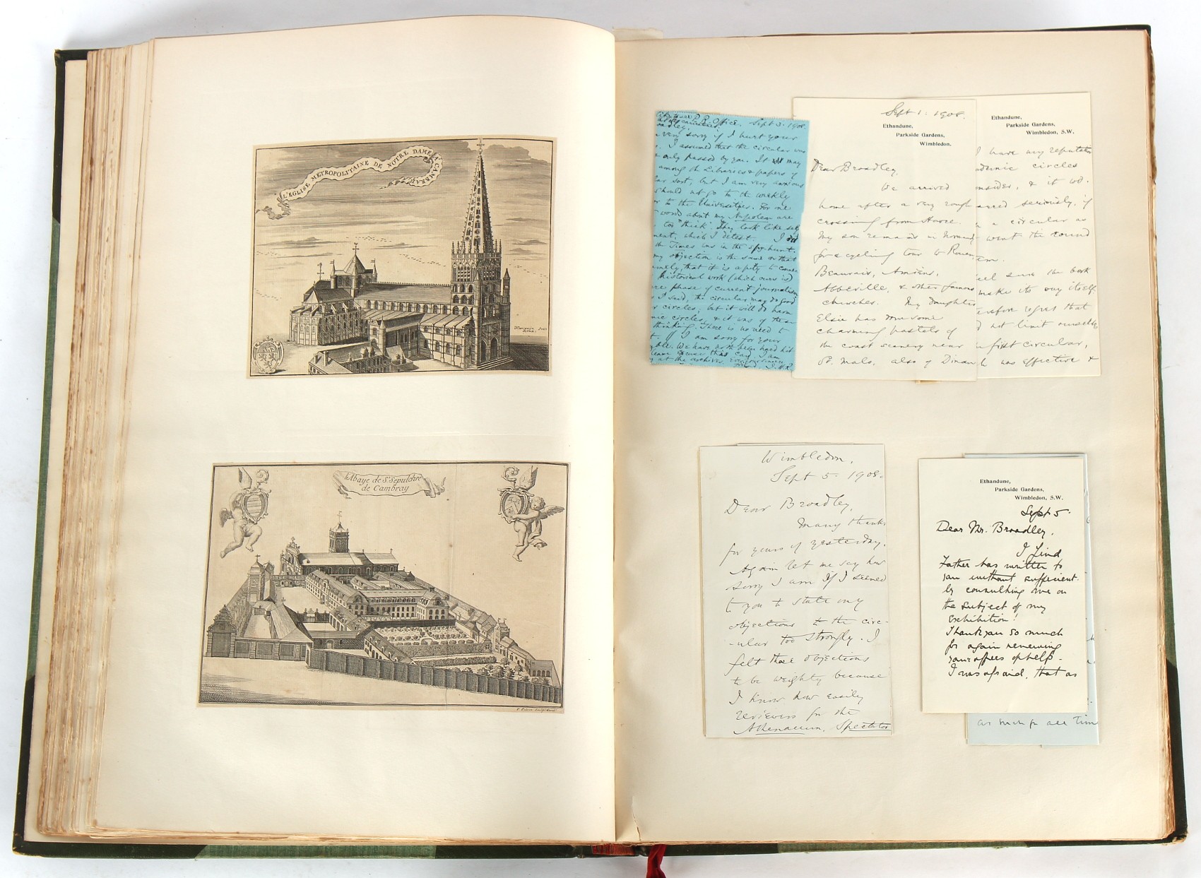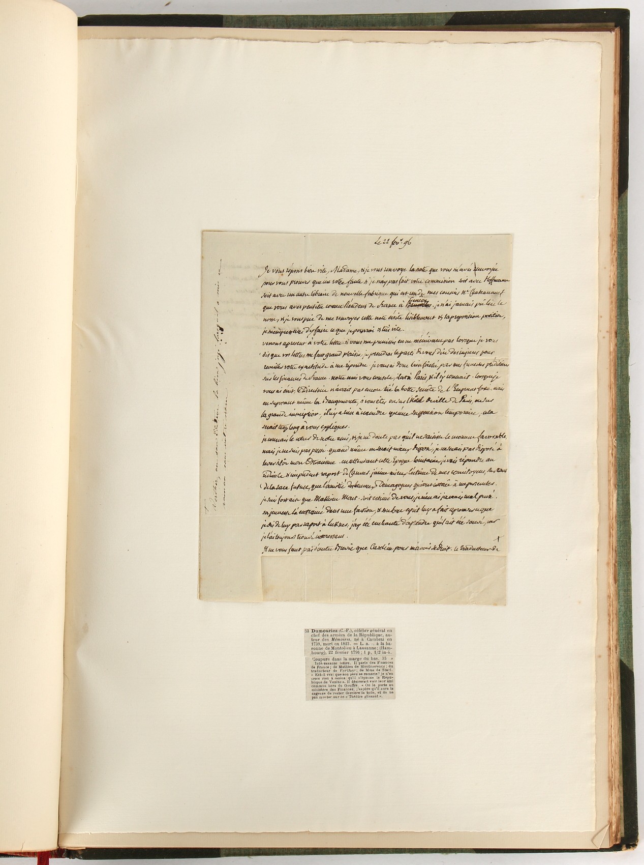 Property of a lady - Napoleonic historical interest - BROADLEY, Alexander Meyrick, and ROSE, John Holland - 'Dumouriez and the Defence of England against Napoleon' - two volume set, the personal 'Extra-Illustrated' or 'Grangerized' (or 'Grangerised') copies of Alexander Meyrick Broadley (1847-1916), London, John Lane, The Bodley Head, 1909, with tipped-in invoice from William Brendon & Son Limited Printers, Plymouth, dated 7th Sept. 1908 for £2 - - 'To one special copy pulled upon large paper, also 200 folio plain sheets', extra-illustrated or augmented with a large quantity of contemporarily hand-coloured and monochrome cartoon or caricature satirical prints, original drawings & watercolours, printed broadsides, etc., each affixed at the edges only into a window cut in to each plain folio sheet (so that backs are open & visible), Volume One including six tipped-in manuscript letters from Herbert H. Raphael (Major Sir Herbert Henry Raphael, 1st Baronet, 1859–1924) and twenty-six tipped-in manuscript letters from John Holland Rose (1855-1942) and two manuscript letters (one being four-sided) from Field Marshal Lord Roberts (1832-1914), and many other ms letters including some from Cambrai (Cambray), France (where Dumouriez was born), and the publishers (including the original contract between the authors and the publishers), all regarding the book and its compilation, also including twelve original ink manuscript letters by the subject of the book Charles Francois du Perier Dumouriez (1739-1823) (a further 16 letters by him are in Volume Two), the first dated 1765, the second (four sided) from Versailles dated 1772, the third (four sided) dated 1782, the fourth, fifth, sixth, seventh, eighth, ninth and tenth all dated 1792 when Dumouriez was Ministre des Affairs Etrangeres, Ministre de la Guerre, and Chef de L'Armee du Nord, an important ink manuscript letter from Dumouriez dated 1793 (two sided) consulting Charles James Fox on finding refuge in London (with letter from the dealer P.F. Madigan in Fifth Avenue, New York, regarding Boardley's purchase of this letter for $40), another ms letter from Dumouriez (two sided) dated 1796, and another from Antoine-Marie Chamans de Lavallette (Directeur General des Postes under Napoleon), the prints including Piercy Roberts after George Murgatroyd Woodward - 'John Bull and His Friends Commemorating The Peace' (1802); 'A Cock and Bull Story' (1803), published by Percy Roberts; a small pencil drawing portrait of Dumouriez initialled J.D. and dated 9 Oct. '69; 'La Retour en Angleterre' (we can find no record of this print); 'Carte des Descentes Faites en Angleterre et en Irlande Depuis Guillaume la Conquérant jusqu'à nos jours' (Map of the Invasions of England and Ireland from William the Conqueror to the Present) (1798), hand-coloured, with accompanying text; 'Capture of Bonaparte's Carriage', published by Edwards, 1818; a signed watercolour by G. Heberden entitled 'Genl. Dumouriez marching the Sans Culottes into Holland', 19.5 by 32.5cms.; 'A Dose for Dumourier, Evacuation of Holland and Brabant' (monochrome); and James Gillray - 'Dumourier dining in state at St James's, on the 15th of May, 1793' (monochrome), Volume Two including numerous broadsides or notices, some anti-Napoleon propaganda, one a folding monochrome broadside entitled 'An ABSTRACT of An Act for providing an Augmentation to the MILITIA, to be trained and exercised in the Manner therein directed; and for enabling His Majesty to cause the same to be embodied, in case of Necessity, for the Defence of these Kingdoms', printed by George Eyre and Andrew Strahan, 1796; lists of recruited foreign soldiers, etc.; an 'Army of Reserve Act' broadside for the Parish of St. Clement Danes, dated 1803; a Jan Kip folded engraving of Lulworth Castle entitled 'Lullworth Castle in Dorsetshire, The Seat of Humphry Weld'; other folding maps; several printed patriotic song scores of the period; a ms autograph ink sheet entitled 'Verses written on the threatened Invasion', by B. Atkinson of Bath'; a contemporary 60-page plus index ink ms booklet entitled 'Internal Defence of Essex', listing the names & number of carts & horses for each village or town to be called upon in the event of invasion; a printed list of 'Loyal Colchester Volunteers', dated July 1803; this second volume also includes a further 16 ink ms letters by Dumouriez dating from 1804 to 1822; and much more (helpfully, Broadley added a ms index of the extra illustrations); each volume approximately 20.5 by 14ins. (52 by 35.5cms.) (overall) (2). Footnote - Alexander Meyrick Broadley (1847-1916) was a British author, barrister, collector and social figure, known for defending Ahmed 'Urabi after the Urabi Revolt. Broadley penned numerous historical works later in life, particularly regarding Napoleon and his era. Among the works he authored or co-authored are 'Napoleon and the Invasion of England: The Story of the Great Terror' (London, 1908); 'Nelson’s Hardy: His Life, Letters and Friends' (London, 1909); 'Napoleon in Caricature 1795-1821' (London, 1911); and 'Napoleon in Exile' (London, 1914). Broadley was known as a celebrated grangeriser (or extra-illustrator) of books, and one of his greatest achievements was the creation, with the assistance of Daniell, of an extra-illustrated set of Rose’s 'Life of Napoleon I' and Rosebery’s 'Napoleon. The Last Phase', by inlaying and extending the works from three octavo to twenty-eight folio volumes with engravings, portraits, manuscripts, autograph letters, etc. over a period of four years. This monumental work was bought by George Nathaniel Curzon, Marquess Curzon of Kedleston at the auction of Broadley’s library held in four sales between 1916 and 1918, and Curzon later bequeathed the set to the Bodleian Library, Oxford.