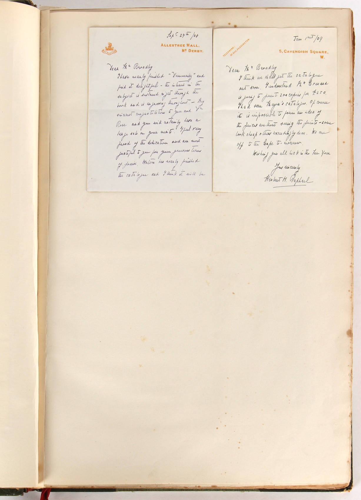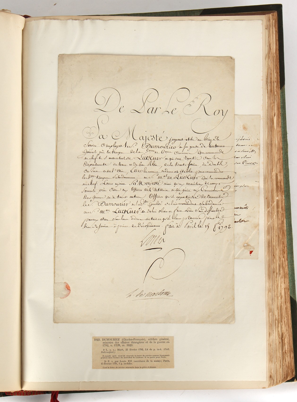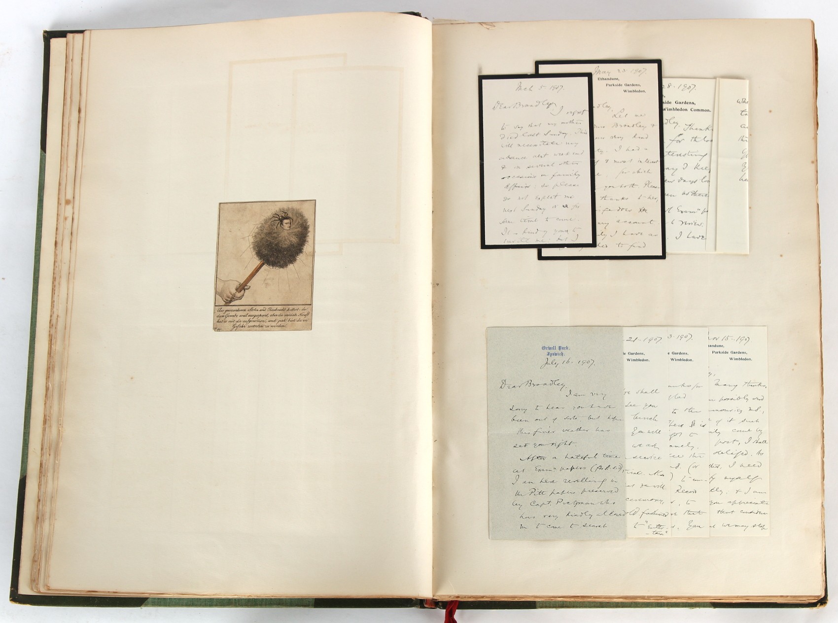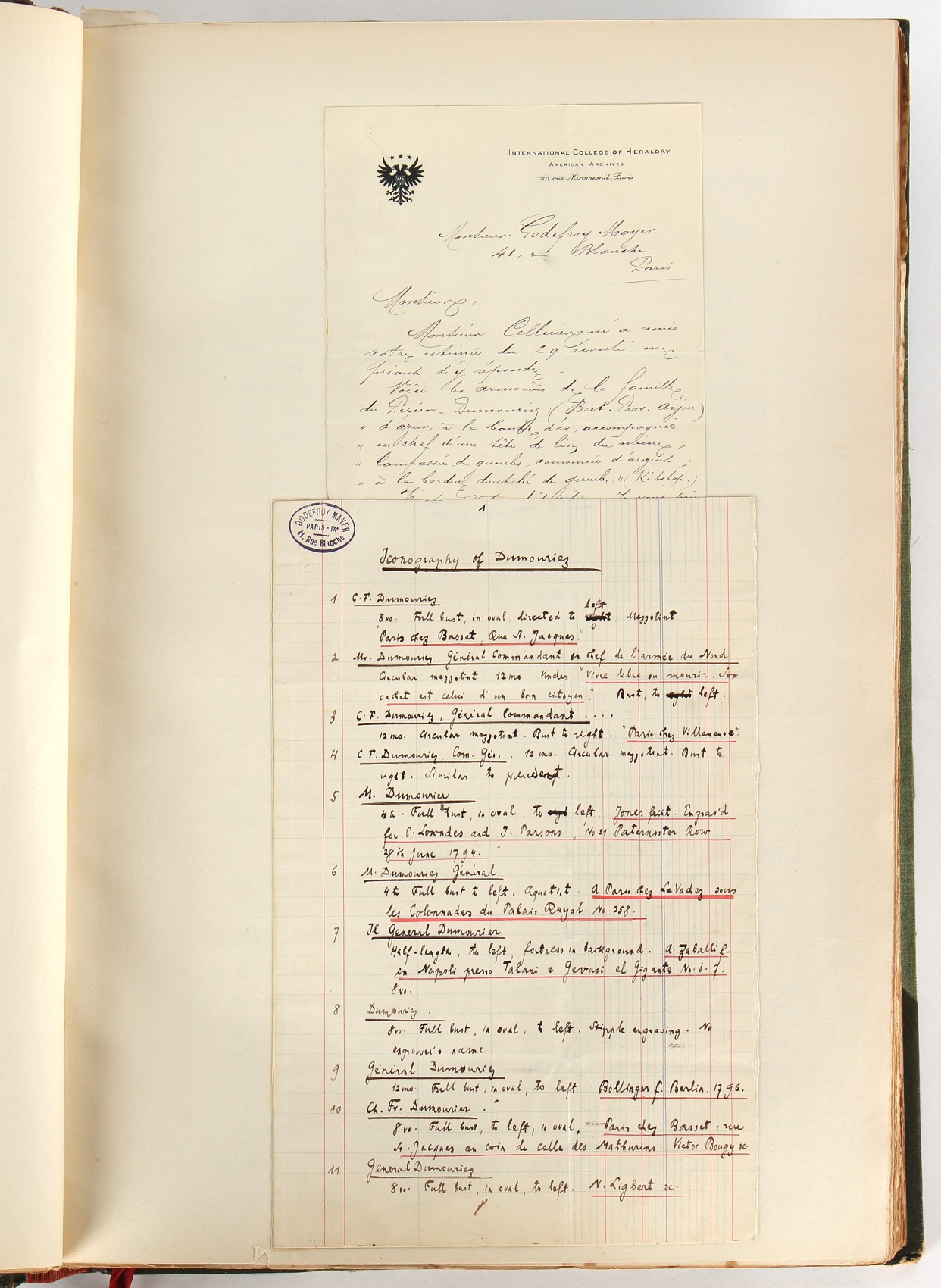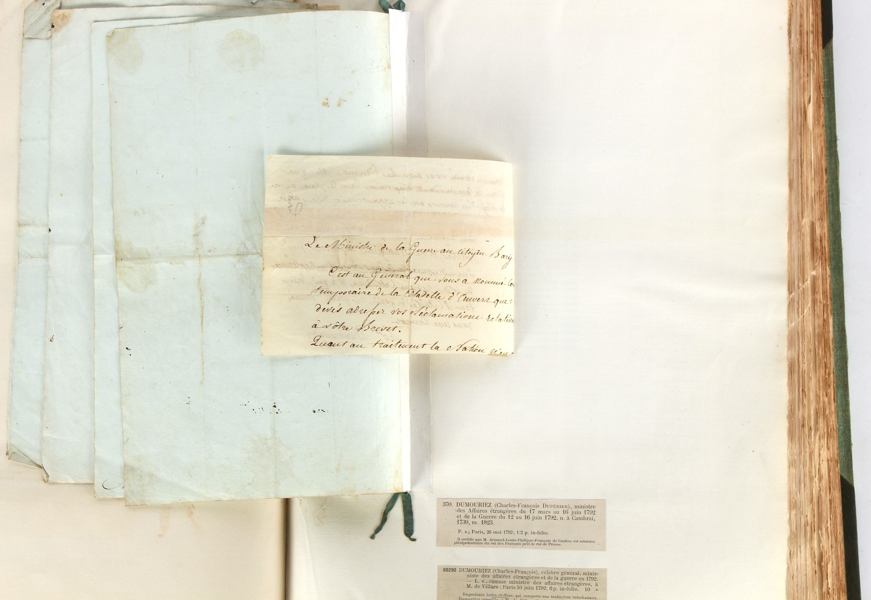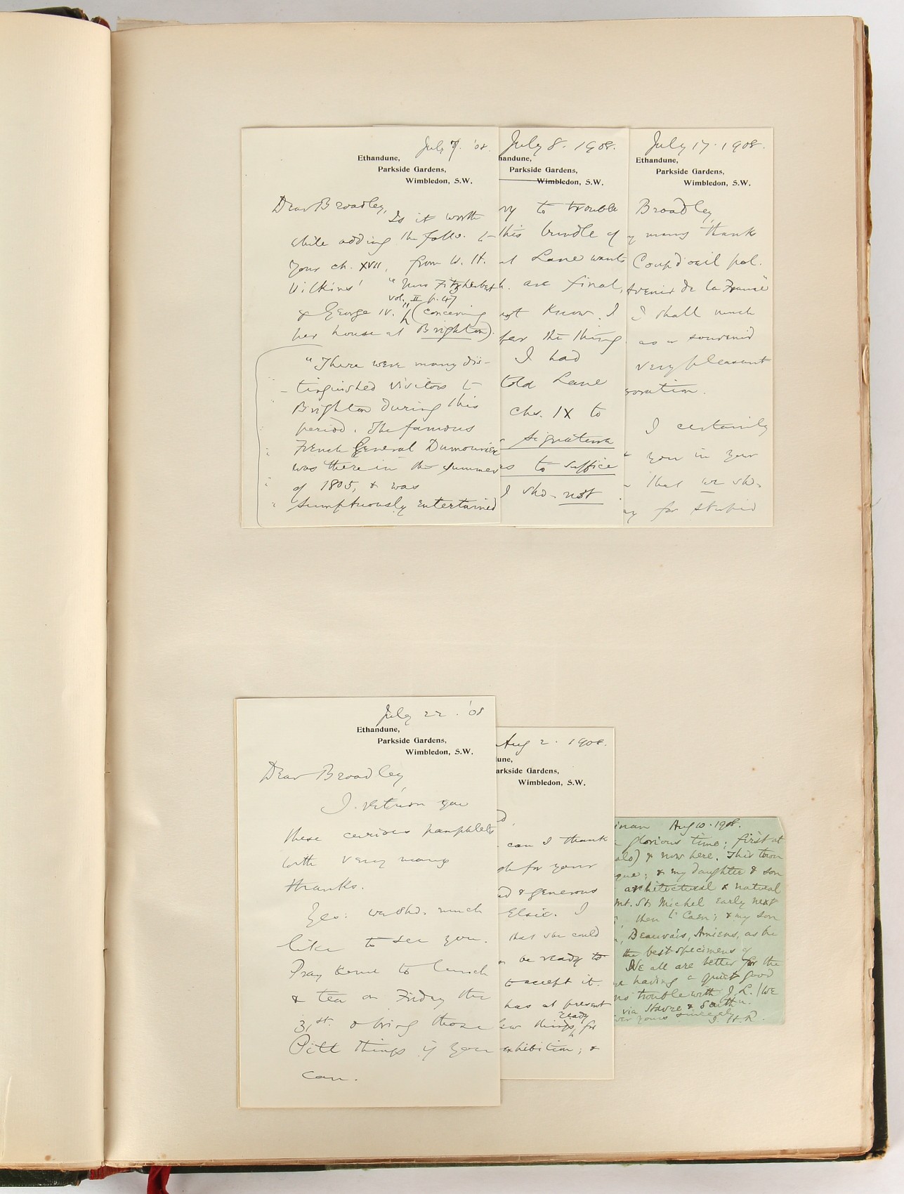 Property of a lady - Napoleonic historical interest - BROADLEY, Alexander Meyrick, and ROSE, John Holland - 'Dumouriez and the Defence of England against Napoleon' - two volume set, the personal 'Extra-Illustrated' or 'Grangerized' (or 'Grangerised') copies of Alexander Meyrick Broadley (1847-1916), London, John Lane, The Bodley Head, 1909, with tipped-in invoice from William Brendon & Son Limited Printers, Plymouth, dated 7th Sept. 1908 for £2 - - 'To one special copy pulled upon large paper, also 200 folio plain sheets', extra-illustrated or augmented with a large quantity of contemporarily hand-coloured and monochrome cartoon or caricature satirical prints, original drawings & watercolours, printed broadsides, etc., each affixed at the edges only into a window cut in to each plain folio sheet (so that backs are open & visible), Volume One including six tipped-in manuscript letters from Herbert H. Raphael (Major Sir Herbert Henry Raphael, 1st Baronet, 1859–1924) and twenty-six tipped-in manuscript letters from John Holland Rose (1855-1942) and two manuscript letters (one being four-sided) from Field Marshal Lord Roberts (1832-1914), and many other ms letters including some from Cambrai (Cambray), France (where Dumouriez was born), and the publishers (including the original contract between the authors and the publishers), all regarding the book and its compilation, also including twelve original ink manuscript letters by the subject of the book Charles Francois du Perier Dumouriez (1739-1823) (a further 16 letters by him are in Volume Two), the first dated 1765, the second (four sided) from Versailles dated 1772, the third (four sided) dated 1782, the fourth, fifth, sixth, seventh, eighth, ninth and tenth all dated 1792 when Dumouriez was Ministre des Affairs Etrangeres, Ministre de la Guerre, and Chef de L'Armee du Nord, an important ink manuscript letter from Dumouriez dated 1793 (two sided) consulting Charles James Fox on finding refuge in London (with letter from the dealer P.F. Madigan in Fifth Avenue, New York, regarding Boardley's purchase of this letter for $40), another ms letter from Dumouriez (two sided) dated 1796, and another from Antoine-Marie Chamans de Lavallette (Directeur General des Postes under Napoleon), the prints including Piercy Roberts after George Murgatroyd Woodward - 'John Bull and His Friends Commemorating The Peace' (1802); 'A Cock and Bull Story' (1803), published by Percy Roberts; a small pencil drawing portrait of Dumouriez initialled J.D. and dated 9 Oct. '69; 'La Retour en Angleterre' (we can find no record of this print); 'Carte des Descentes Faites en Angleterre et en Irlande Depuis Guillaume la Conquérant jusqu'à nos jours' (Map of the Invasions of England and Ireland from William the Conqueror to the Present) (1798), hand-coloured, with accompanying text; 'Capture of Bonaparte's Carriage', published by Edwards, 1818; a signed watercolour by G. Heberden entitled 'Genl. Dumouriez marching the Sans Culottes into Holland', 19.5 by 32.5cms.; 'A Dose for Dumourier, Evacuation of Holland and Brabant' (monochrome); and James Gillray - 'Dumourier dining in state at St James's, on the 15th of May, 1793' (monochrome), Volume Two including numerous broadsides or notices, some anti-Napoleon propaganda, one a folding monochrome broadside entitled 'An ABSTRACT of An Act for providing an Augmentation to the MILITIA, to be trained and exercised in the Manner therein directed; and for enabling His Majesty to cause the same to be embodied, in case of Necessity, for the Defence of these Kingdoms', printed by George Eyre and Andrew Strahan, 1796; lists of recruited foreign soldiers, etc.; an 'Army of Reserve Act' broadside for the Parish of St. Clement Danes, dated 1803; a Jan Kip folded engraving of Lulworth Castle entitled 'Lullworth Castle in Dorsetshire, The Seat of Humphry Weld'; other folding maps; several printed patriotic song scores of the period; a ms autograph ink sheet entitled 'Verses written on the threatened Invasion', by B. Atkinson of Bath'; a contemporary 60-page plus index ink ms booklet entitled 'Internal Defence of Essex', listing the names & number of carts & horses for each village or town to be called upon in the event of invasion; a printed list of 'Loyal Colchester Volunteers', dated July 1803; this second volume also includes a further 16 ink ms letters by Dumouriez dating from 1804 to 1822; and much more (helpfully, Broadley added a ms index of the extra illustrations); each volume approximately 20.5 by 14ins. (52 by 35.5cms.) (overall) (2). Footnote - Alexander Meyrick Broadley (1847-1916) was a British author, barrister, collector and social figure, known for defending Ahmed 'Urabi after the Urabi Revolt. Broadley penned numerous historical works later in life, particularly regarding Napoleon and his era. Among the works he authored or co-authored are 'Napoleon and the Invasion of England: The Story of the Great Terror' (London, 1908); 'Nelson’s Hardy: His Life, Letters and Friends' (London, 1909); 'Napoleon in Caricature 1795-1821' (London, 1911); and 'Napoleon in Exile' (London, 1914). Broadley was known as a celebrated grangeriser (or extra-illustrator) of books, and one of his greatest achievements was the creation, with the assistance of Daniell, of an extra-illustrated set of Rose’s 'Life of Napoleon I' and Rosebery’s 'Napoleon. The Last Phase', by inlaying and extending the works from three octavo to twenty-eight folio volumes with engravings, portraits, manuscripts, autograph letters, etc. over a period of four years. This monumental work was bought by George Nathaniel Curzon, Marquess Curzon of Kedleston at the auction of Broadley’s library held in four sales between 1916 and 1918, and Curzon later bequeathed the set to the Bodleian Library, Oxford.