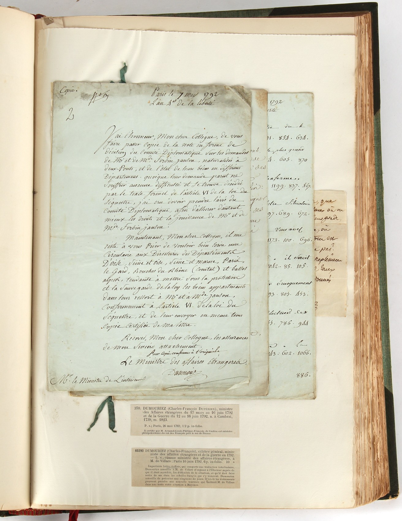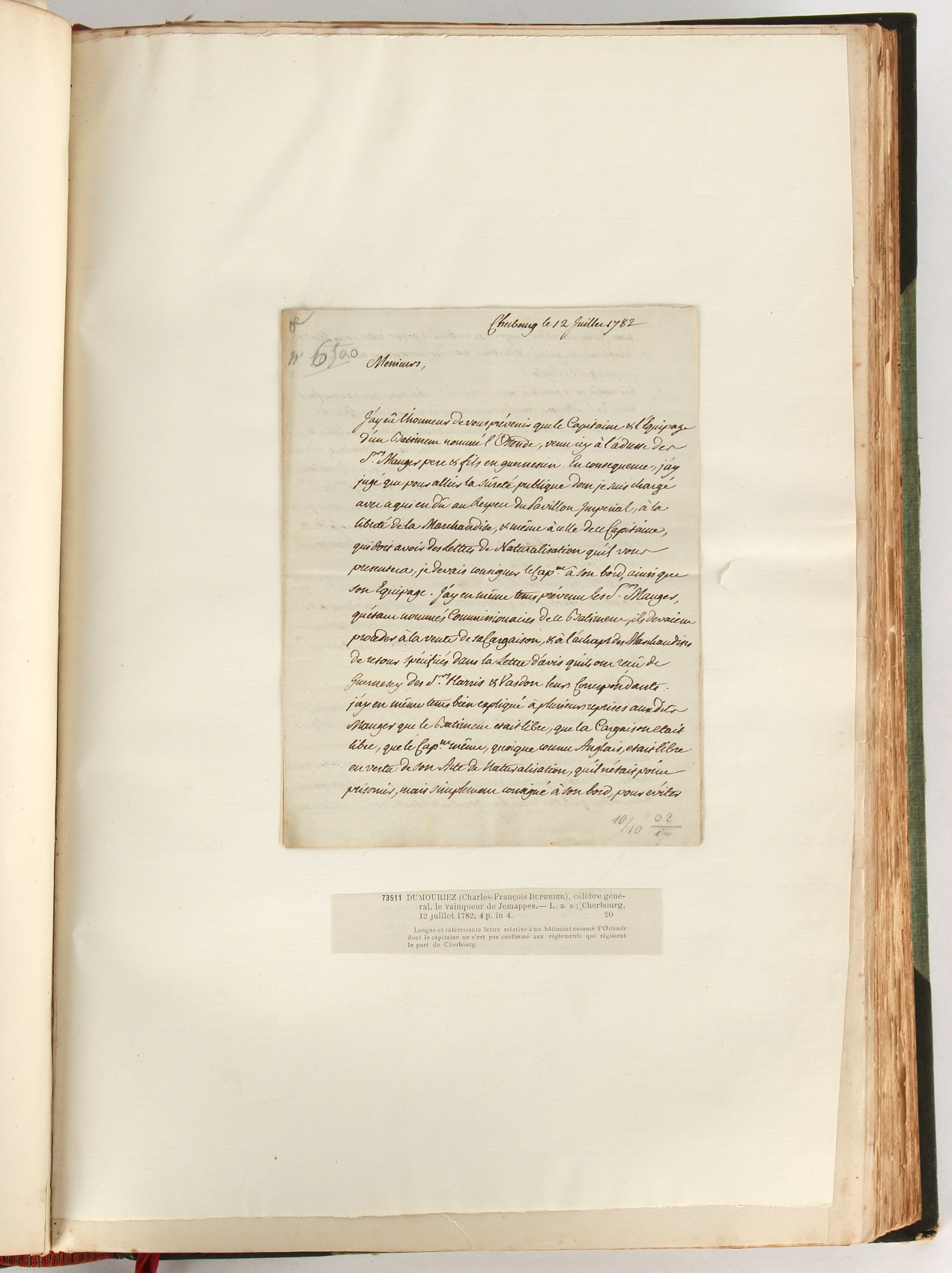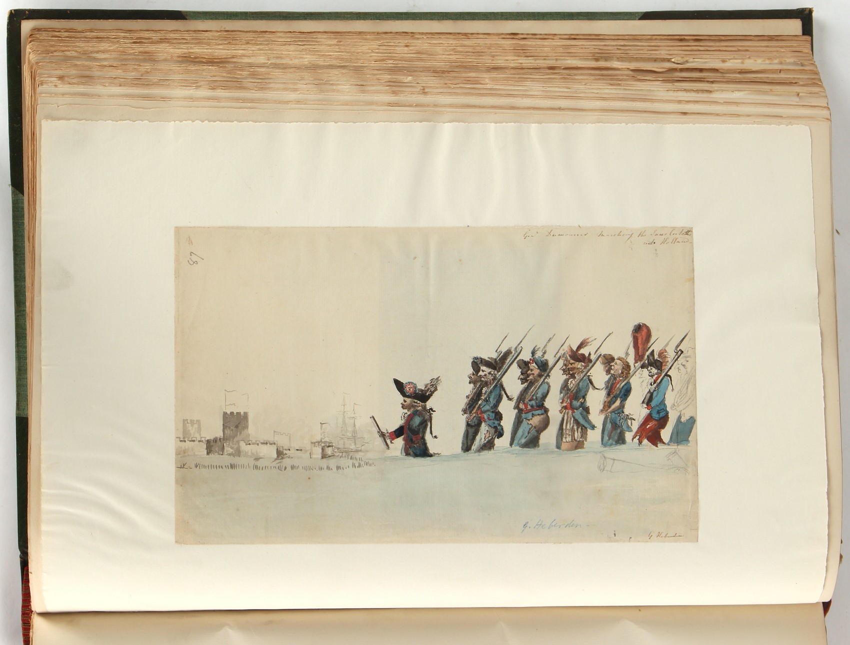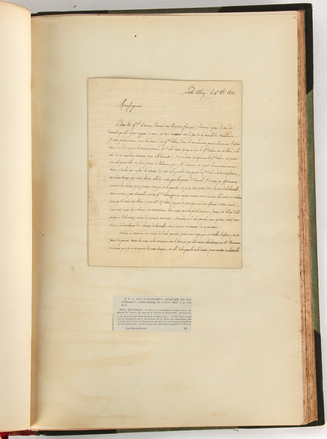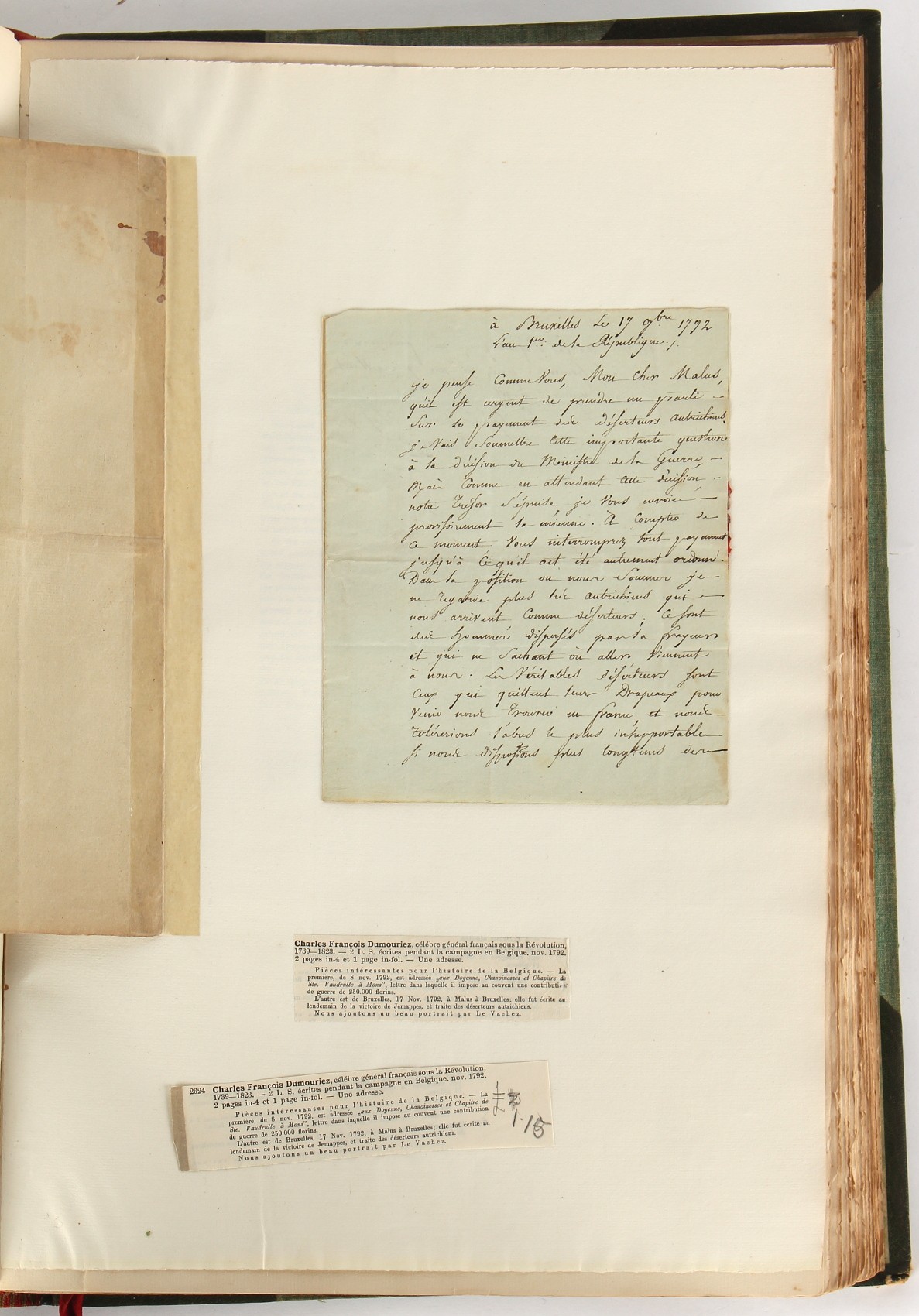 Property of a lady - Napoleonic historical interest - BROADLEY, Alexander Meyrick, and ROSE, John Holland - 'Dumouriez and the Defence of England against Napoleon' - two volume set, the personal 'Extra-Illustrated' or 'Grangerized' (or 'Grangerised') copies of Alexander Meyrick Broadley (1847-1916), London, John Lane, The Bodley Head, 1909, with tipped-in invoice from William Brendon & Son Limited Printers, Plymouth, dated 7th Sept. 1908 for £2 - - 'To one special copy pulled upon large paper, also 200 folio plain sheets', extra-illustrated or augmented with a large quantity of contemporarily hand-coloured and monochrome cartoon or caricature satirical prints, original drawings & watercolours, printed broadsides, etc., each affixed at the edges only into a window cut in to each plain folio sheet (so that backs are open & visible), Volume One including six tipped-in manuscript letters from Herbert H. Raphael (Major Sir Herbert Henry Raphael, 1st Baronet, 1859–1924) and twenty-six tipped-in manuscript letters from John Holland Rose (1855-1942) and two manuscript letters (one being four-sided) from Field Marshal Lord Roberts (1832-1914), and many other ms letters including some from Cambrai (Cambray), France (where Dumouriez was born), and the publishers (including the original contract between the authors and the publishers), all regarding the book and its compilation, also including twelve original ink manuscript letters by the subject of the book Charles Francois du Perier Dumouriez (1739-1823) (a further 16 letters by him are in Volume Two), the first dated 1765, the second (four sided) from Versailles dated 1772, the third (four sided) dated 1782, the fourth, fifth, sixth, seventh, eighth, ninth and tenth all dated 1792 when Dumouriez was Ministre des Affairs Etrangeres, Ministre de la Guerre, and Chef de L'Armee du Nord, an important ink manuscript letter from Dumouriez dated 1793 (two sided) consulting Charles James Fox on finding refuge in London (with letter from the dealer P.F. Madigan in Fifth Avenue, New York, regarding Boardley's purchase of this letter for $40), another ms letter from Dumouriez (two sided) dated 1796, and another from Antoine-Marie Chamans de Lavallette (Directeur General des Postes under Napoleon), the prints including Piercy Roberts after George Murgatroyd Woodward - 'John Bull and His Friends Commemorating The Peace' (1802); 'A Cock and Bull Story' (1803), published by Percy Roberts; a small pencil drawing portrait of Dumouriez initialled J.D. and dated 9 Oct. '69; 'La Retour en Angleterre' (we can find no record of this print); 'Carte des Descentes Faites en Angleterre et en Irlande Depuis Guillaume la Conquérant jusqu'à nos jours' (Map of the Invasions of England and Ireland from William the Conqueror to the Present) (1798), hand-coloured, with accompanying text; 'Capture of Bonaparte's Carriage', published by Edwards, 1818; a signed watercolour by G. Heberden entitled 'Genl. Dumouriez marching the Sans Culottes into Holland', 19.5 by 32.5cms.; 'A Dose for Dumourier, Evacuation of Holland and Brabant' (monochrome); and James Gillray - 'Dumourier dining in state at St James's, on the 15th of May, 1793' (monochrome), Volume Two including numerous broadsides or notices, some anti-Napoleon propaganda, one a folding monochrome broadside entitled 'An ABSTRACT of An Act for providing an Augmentation to the MILITIA, to be trained and exercised in the Manner therein directed; and for enabling His Majesty to cause the same to be embodied, in case of Necessity, for the Defence of these Kingdoms', printed by George Eyre and Andrew Strahan, 1796; lists of recruited foreign soldiers, etc.; an 'Army of Reserve Act' broadside for the Parish of St. Clement Danes, dated 1803; a Jan Kip folded engraving of Lulworth Castle entitled 'Lullworth Castle in Dorsetshire, The Seat of Humphry Weld'; other folding maps; several printed patriotic song scores of the period; a ms autograph ink sheet entitled 'Verses written on the threatened Invasion', by B. Atkinson of Bath'; a contemporary 60-page plus index ink ms booklet entitled 'Internal Defence of Essex', listing the names & number of carts & horses for each village or town to be called upon in the event of invasion; a printed list of 'Loyal Colchester Volunteers', dated July 1803; this second volume also includes a further 16 ink ms letters by Dumouriez dating from 1804 to 1822; and much more (helpfully, Broadley added a ms index of the extra illustrations); each volume approximately 20.5 by 14ins. (52 by 35.5cms.) (overall) (2). Footnote - Alexander Meyrick Broadley (1847-1916) was a British author, barrister, collector and social figure, known for defending Ahmed 'Urabi after the Urabi Revolt. Broadley penned numerous historical works later in life, particularly regarding Napoleon and his era. Among the works he authored or co-authored are 'Napoleon and the Invasion of England: The Story of the Great Terror' (London, 1908); 'Nelson’s Hardy: His Life, Letters and Friends' (London, 1909); 'Napoleon in Caricature 1795-1821' (London, 1911); and 'Napoleon in Exile' (London, 1914). Broadley was known as a celebrated grangeriser (or extra-illustrator) of books, and one of his greatest achievements was the creation, with the assistance of Daniell, of an extra-illustrated set of Rose’s 'Life of Napoleon I' and Rosebery’s 'Napoleon. The Last Phase', by inlaying and extending the works from three octavo to twenty-eight folio volumes with engravings, portraits, manuscripts, autograph letters, etc. over a period of four years. This monumental work was bought by George Nathaniel Curzon, Marquess Curzon of Kedleston at the auction of Broadley’s library held in four sales between 1916 and 1918, and Curzon later bequeathed the set to the Bodleian Library, Oxford.