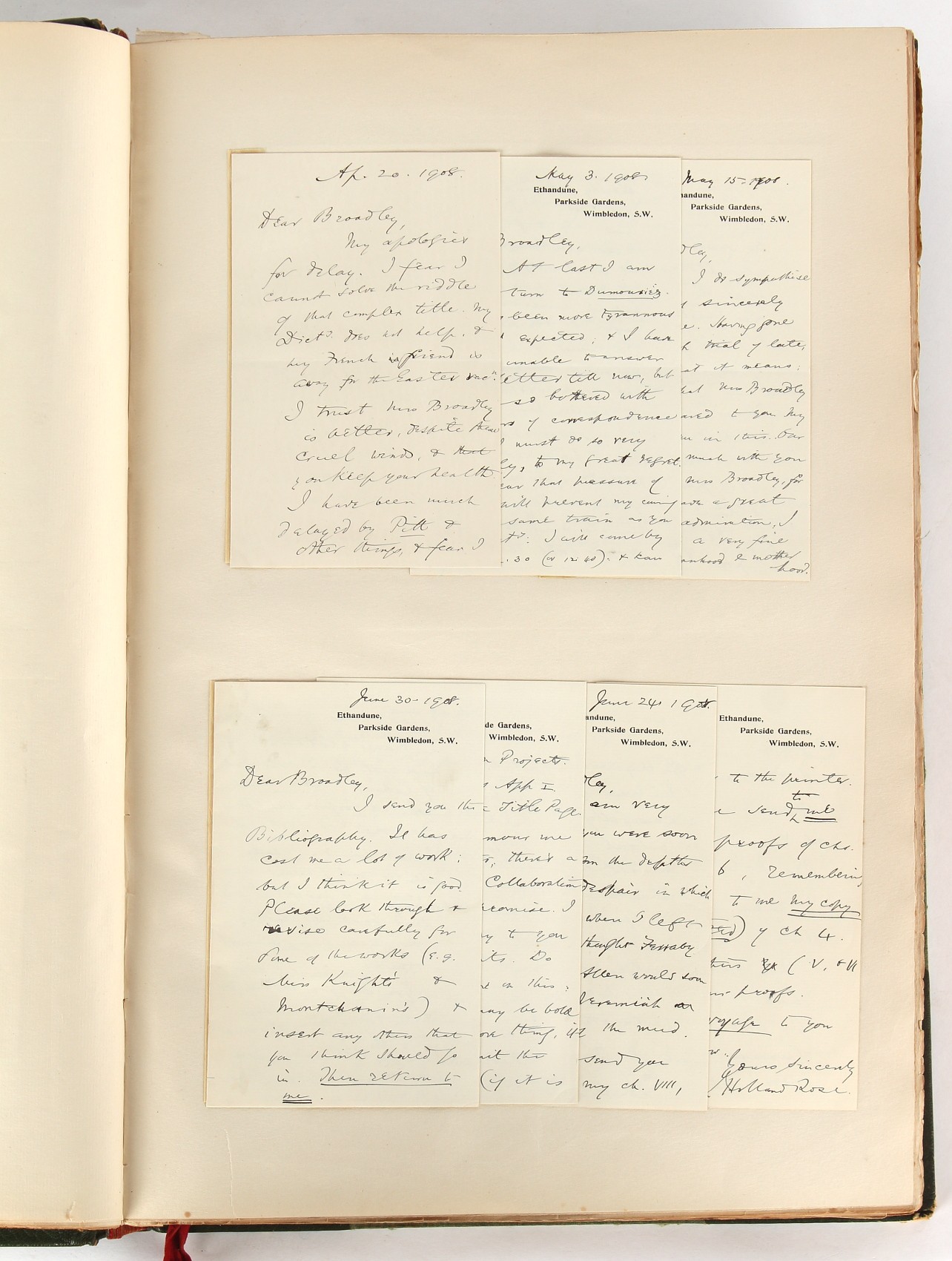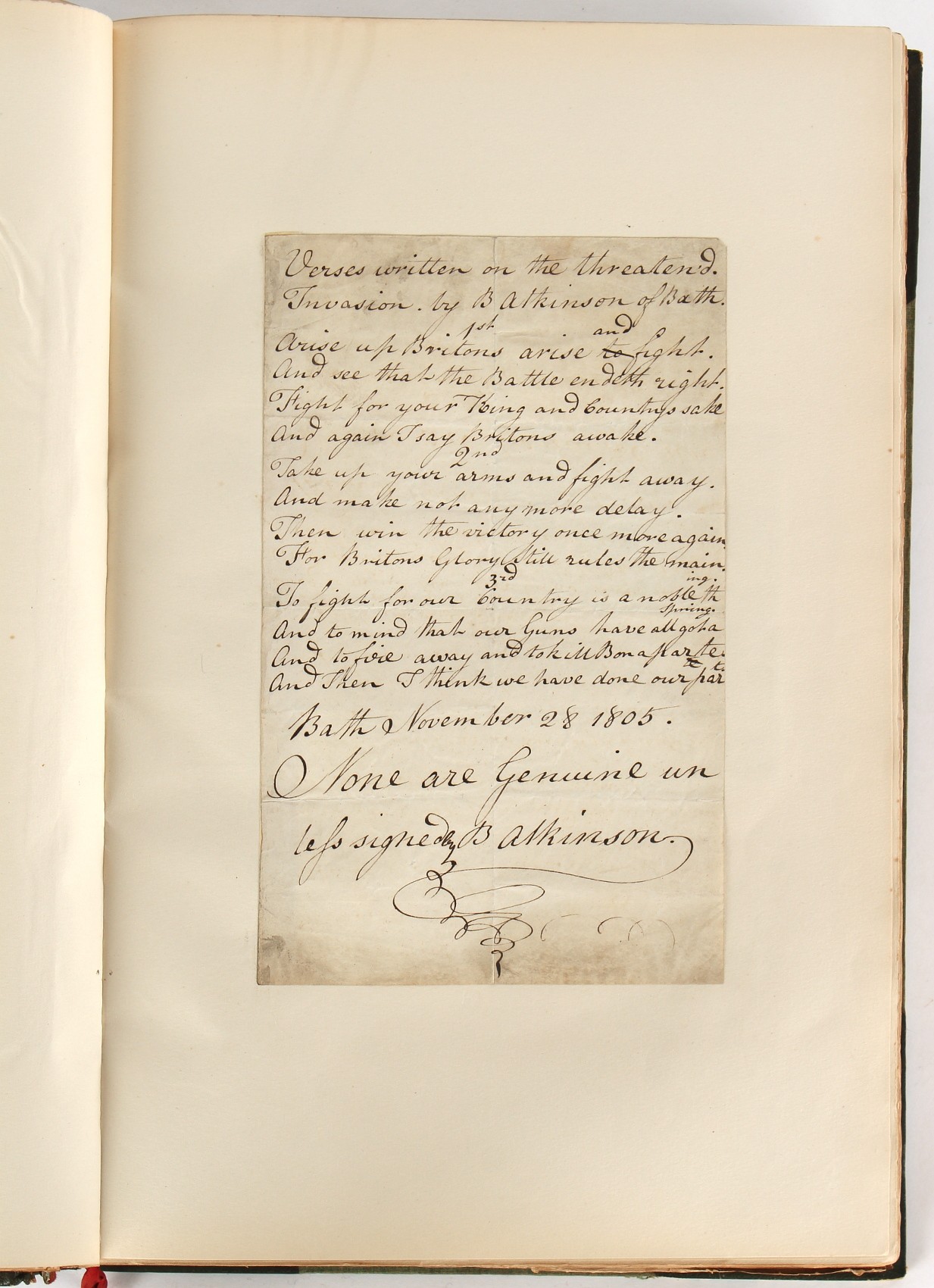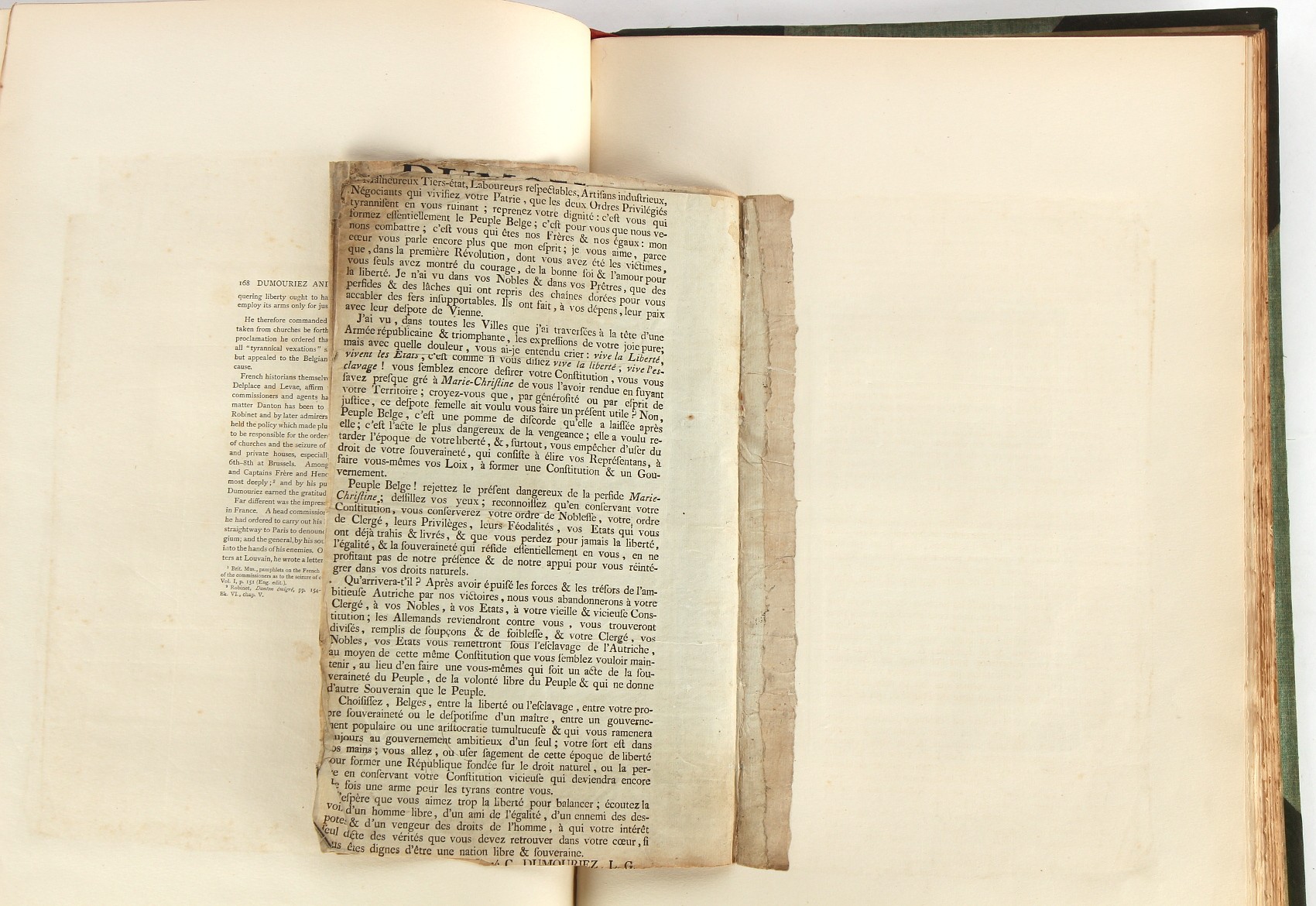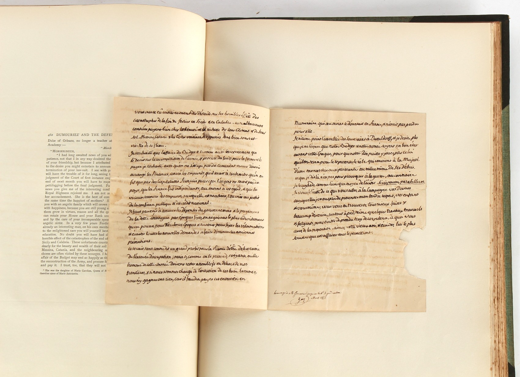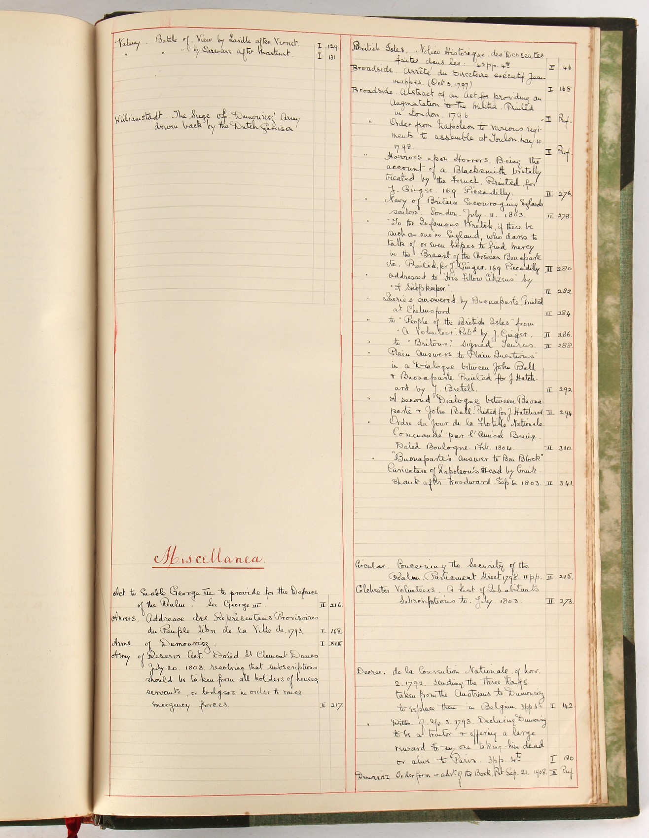 Property of a lady - Napoleonic historical interest - BROADLEY, Alexander Meyrick, and ROSE, John Holland - 'Dumouriez and the Defence of England against Napoleon' - two volume set, the personal 'Extra-Illustrated' or 'Grangerized' (or 'Grangerised') copies of Alexander Meyrick Broadley (1847-1916), London, John Lane, The Bodley Head, 1909, with tipped-in invoice from William Brendon & Son Limited Printers, Plymouth, dated 7th Sept. 1908 for £2 - - 'To one special copy pulled upon large paper, also 200 folio plain sheets', extra-illustrated or augmented with a large quantity of contemporarily hand-coloured and monochrome cartoon or caricature satirical prints, original drawings & watercolours, printed broadsides, etc., each affixed at the edges only into a window cut in to each plain folio sheet (so that backs are open & visible), Volume One including six tipped-in manuscript letters from Herbert H. Raphael (Major Sir Herbert Henry Raphael, 1st Baronet, 1859–1924) and twenty-six tipped-in manuscript letters from John Holland Rose (1855-1942) and two manuscript letters (one being four-sided) from Field Marshal Lord Roberts (1832-1914), and many other ms letters including some from Cambrai (Cambray), France (where Dumouriez was born), and the publishers (including the original contract between the authors and the publishers), all regarding the book and its compilation, also including twelve original ink manuscript letters by the subject of the book Charles Francois du Perier Dumouriez (1739-1823) (a further 16 letters by him are in Volume Two), the first dated 1765, the second (four sided) from Versailles dated 1772, the third (four sided) dated 1782, the fourth, fifth, sixth, seventh, eighth, ninth and tenth all dated 1792 when Dumouriez was Ministre des Affairs Etrangeres, Ministre de la Guerre, and Chef de L'Armee du Nord, an important ink manuscript letter from Dumouriez dated 1793 (two sided) consulting Charles James Fox on finding refuge in London (with letter from the dealer P.F. Madigan in Fifth Avenue, New York, regarding Boardley's purchase of this letter for $40), another ms letter from Dumouriez (two sided) dated 1796, and another from Antoine-Marie Chamans de Lavallette (Directeur General des Postes under Napoleon), the prints including Piercy Roberts after George Murgatroyd Woodward - 'John Bull and His Friends Commemorating The Peace' (1802); 'A Cock and Bull Story' (1803), published by Percy Roberts; a small pencil drawing portrait of Dumouriez initialled J.D. and dated 9 Oct. '69; 'La Retour en Angleterre' (we can find no record of this print); 'Carte des Descentes Faites en Angleterre et en Irlande Depuis Guillaume la Conquérant jusqu'à nos jours' (Map of the Invasions of England and Ireland from William the Conqueror to the Present) (1798), hand-coloured, with accompanying text; 'Capture of Bonaparte's Carriage', published by Edwards, 1818; a signed watercolour by G. Heberden entitled 'Genl. Dumouriez marching the Sans Culottes into Holland', 19.5 by 32.5cms.; 'A Dose for Dumourier, Evacuation of Holland and Brabant' (monochrome); and James Gillray - 'Dumourier dining in state at St James's, on the 15th of May, 1793' (monochrome), Volume Two including numerous broadsides or notices, some anti-Napoleon propaganda, one a folding monochrome broadside entitled 'An ABSTRACT of An Act for providing an Augmentation to the MILITIA, to be trained and exercised in the Manner therein directed; and for enabling His Majesty to cause the same to be embodied, in case of Necessity, for the Defence of these Kingdoms', printed by George Eyre and Andrew Strahan, 1796; lists of recruited foreign soldiers, etc.; an 'Army of Reserve Act' broadside for the Parish of St. Clement Danes, dated 1803; a Jan Kip folded engraving of Lulworth Castle entitled 'Lullworth Castle in Dorsetshire, The Seat of Humphry Weld'; other folding maps; several printed patriotic song scores of the period; a ms autograph ink sheet entitled 'Verses written on the threatened Invasion', by B. Atkinson of Bath'; a contemporary 60-page plus index ink ms booklet entitled 'Internal Defence of Essex', listing the names & number of carts & horses for each village or town to be called upon in the event of invasion; a printed list of 'Loyal Colchester Volunteers', dated July 1803; this second volume also includes a further 16 ink ms letters by Dumouriez dating from 1804 to 1822; and much more (helpfully, Broadley added a ms index of the extra illustrations); each volume approximately 20.5 by 14ins. (52 by 35.5cms.) (overall) (2). Footnote - Alexander Meyrick Broadley (1847-1916) was a British author, barrister, collector and social figure, known for defending Ahmed 'Urabi after the Urabi Revolt. Broadley penned numerous historical works later in life, particularly regarding Napoleon and his era. Among the works he authored or co-authored are 'Napoleon and the Invasion of England: The Story of the Great Terror' (London, 1908); 'Nelson’s Hardy: His Life, Letters and Friends' (London, 1909); 'Napoleon in Caricature 1795-1821' (London, 1911); and 'Napoleon in Exile' (London, 1914). Broadley was known as a celebrated grangeriser (or extra-illustrator) of books, and one of his greatest achievements was the creation, with the assistance of Daniell, of an extra-illustrated set of Rose’s 'Life of Napoleon I' and Rosebery’s 'Napoleon. The Last Phase', by inlaying and extending the works from three octavo to twenty-eight folio volumes with engravings, portraits, manuscripts, autograph letters, etc. over a period of four years. This monumental work was bought by George Nathaniel Curzon, Marquess Curzon of Kedleston at the auction of Broadley’s library held in four sales between 1916 and 1918, and Curzon later bequeathed the set to the Bodleian Library, Oxford.