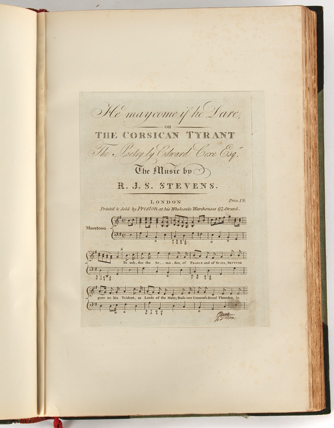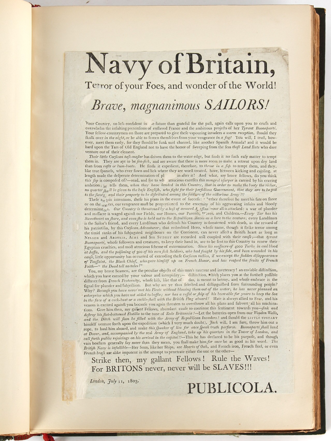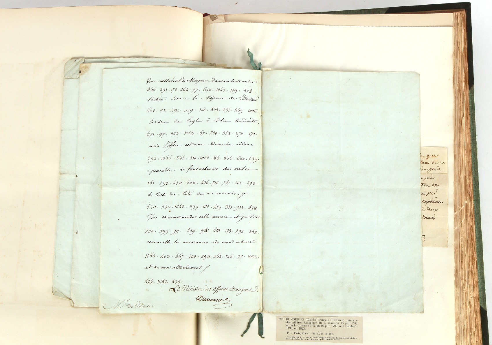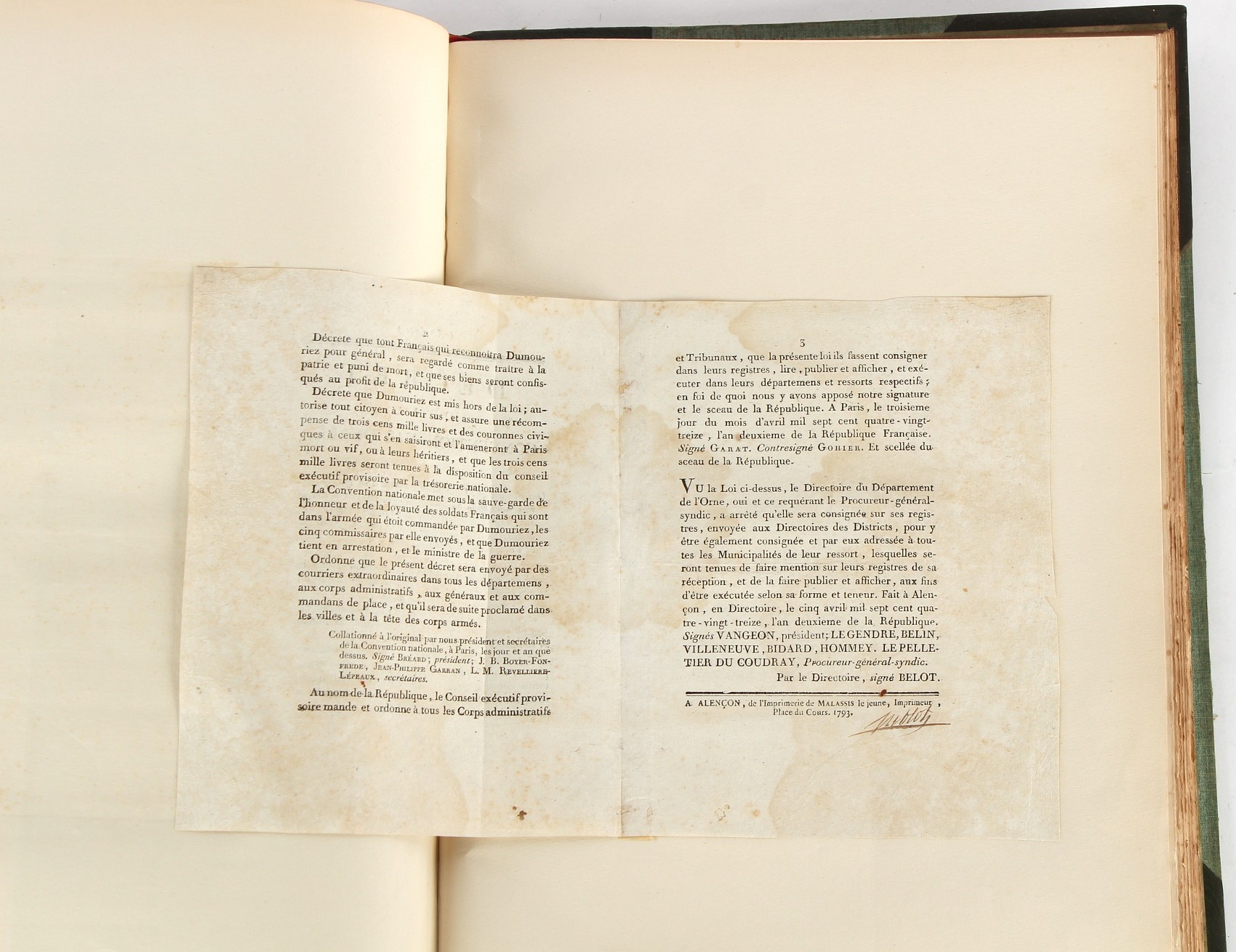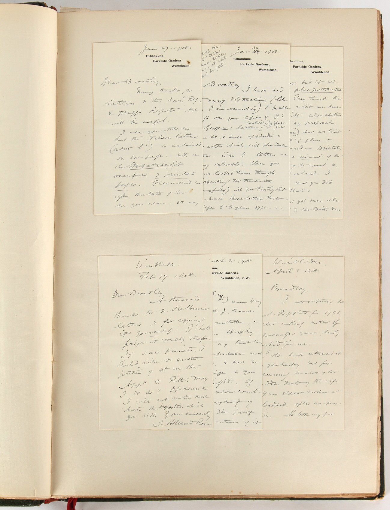 Property of a lady - Napoleonic historical interest - BROADLEY, Alexander Meyrick, and ROSE, John Holland - 'Dumouriez and the Defence of England against Napoleon' - two volume set, the personal 'Extra-Illustrated' or 'Grangerized' (or 'Grangerised') copies of Alexander Meyrick Broadley (1847-1916), London, John Lane, The Bodley Head, 1909, with tipped-in invoice from William Brendon & Son Limited Printers, Plymouth, dated 7th Sept. 1908 for £2 - - 'To one special copy pulled upon large paper, also 200 folio plain sheets', extra-illustrated or augmented with a large quantity of contemporarily hand-coloured and monochrome cartoon or caricature satirical prints, original drawings & watercolours, printed broadsides, etc., each affixed at the edges only into a window cut in to each plain folio sheet (so that backs are open & visible), Volume One including six tipped-in manuscript letters from Herbert H. Raphael (Major Sir Herbert Henry Raphael, 1st Baronet, 1859–1924) and twenty-six tipped-in manuscript letters from John Holland Rose (1855-1942) and two manuscript letters (one being four-sided) from Field Marshal Lord Roberts (1832-1914), and many other ms letters including some from Cambrai (Cambray), France (where Dumouriez was born), and the publishers (including the original contract between the authors and the publishers), all regarding the book and its compilation, also including twelve original ink manuscript letters by the subject of the book Charles Francois du Perier Dumouriez (1739-1823) (a further 16 letters by him are in Volume Two), the first dated 1765, the second (four sided) from Versailles dated 1772, the third (four sided) dated 1782, the fourth, fifth, sixth, seventh, eighth, ninth and tenth all dated 1792 when Dumouriez was Ministre des Affairs Etrangeres, Ministre de la Guerre, and Chef de L'Armee du Nord, an important ink manuscript letter from Dumouriez dated 1793 (two sided) consulting Charles James Fox on finding refuge in London (with letter from the dealer P.F. Madigan in Fifth Avenue, New York, regarding Boardley's purchase of this letter for $40), another ms letter from Dumouriez (two sided) dated 1796, and another from Antoine-Marie Chamans de Lavallette (Directeur General des Postes under Napoleon), the prints including Piercy Roberts after George Murgatroyd Woodward - 'John Bull and His Friends Commemorating The Peace' (1802); 'A Cock and Bull Story' (1803), published by Percy Roberts; a small pencil drawing portrait of Dumouriez initialled J.D. and dated 9 Oct. '69; 'La Retour en Angleterre' (we can find no record of this print); 'Carte des Descentes Faites en Angleterre et en Irlande Depuis Guillaume la Conquérant jusqu'à nos jours' (Map of the Invasions of England and Ireland from William the Conqueror to the Present) (1798), hand-coloured, with accompanying text; 'Capture of Bonaparte's Carriage', published by Edwards, 1818; a signed watercolour by G. Heberden entitled 'Genl. Dumouriez marching the Sans Culottes into Holland', 19.5 by 32.5cms.; 'A Dose for Dumourier, Evacuation of Holland and Brabant' (monochrome); and James Gillray - 'Dumourier dining in state at St James's, on the 15th of May, 1793' (monochrome), Volume Two including numerous broadsides or notices, some anti-Napoleon propaganda, one a folding monochrome broadside entitled 'An ABSTRACT of An Act for providing an Augmentation to the MILITIA, to be trained and exercised in the Manner therein directed; and for enabling His Majesty to cause the same to be embodied, in case of Necessity, for the Defence of these Kingdoms', printed by George Eyre and Andrew Strahan, 1796; lists of recruited foreign soldiers, etc.; an 'Army of Reserve Act' broadside for the Parish of St. Clement Danes, dated 1803; a Jan Kip folded engraving of Lulworth Castle entitled 'Lullworth Castle in Dorsetshire, The Seat of Humphry Weld'; other folding maps; several printed patriotic song scores of the period; a ms autograph ink sheet entitled 'Verses written on the threatened Invasion', by B. Atkinson of Bath'; a contemporary 60-page plus index ink ms booklet entitled 'Internal Defence of Essex', listing the names & number of carts & horses for each village or town to be called upon in the event of invasion; a printed list of 'Loyal Colchester Volunteers', dated July 1803; this second volume also includes a further 16 ink ms letters by Dumouriez dating from 1804 to 1822; and much more (helpfully, Broadley added a ms index of the extra illustrations); each volume approximately 20.5 by 14ins. (52 by 35.5cms.) (overall) (2). Footnote - Alexander Meyrick Broadley (1847-1916) was a British author, barrister, collector and social figure, known for defending Ahmed 'Urabi after the Urabi Revolt. Broadley penned numerous historical works later in life, particularly regarding Napoleon and his era. Among the works he authored or co-authored are 'Napoleon and the Invasion of England: The Story of the Great Terror' (London, 1908); 'Nelson’s Hardy: His Life, Letters and Friends' (London, 1909); 'Napoleon in Caricature 1795-1821' (London, 1911); and 'Napoleon in Exile' (London, 1914). Broadley was known as a celebrated grangeriser (or extra-illustrator) of books, and one of his greatest achievements was the creation, with the assistance of Daniell, of an extra-illustrated set of Rose’s 'Life of Napoleon I' and Rosebery’s 'Napoleon. The Last Phase', by inlaying and extending the works from three octavo to twenty-eight folio volumes with engravings, portraits, manuscripts, autograph letters, etc. over a period of four years. This monumental work was bought by George Nathaniel Curzon, Marquess Curzon of Kedleston at the auction of Broadley’s library held in four sales between 1916 and 1918, and Curzon later bequeathed the set to the Bodleian Library, Oxford.