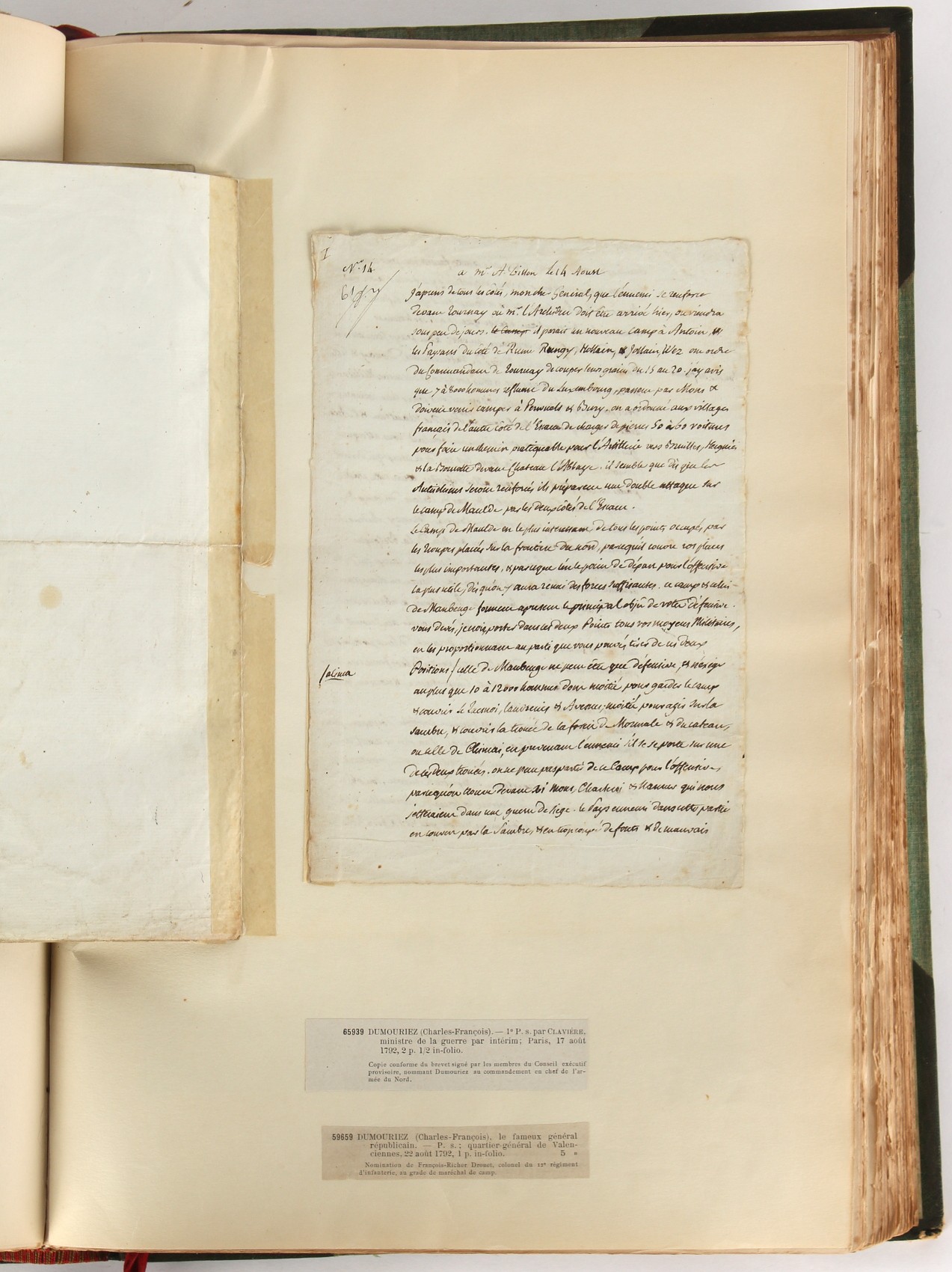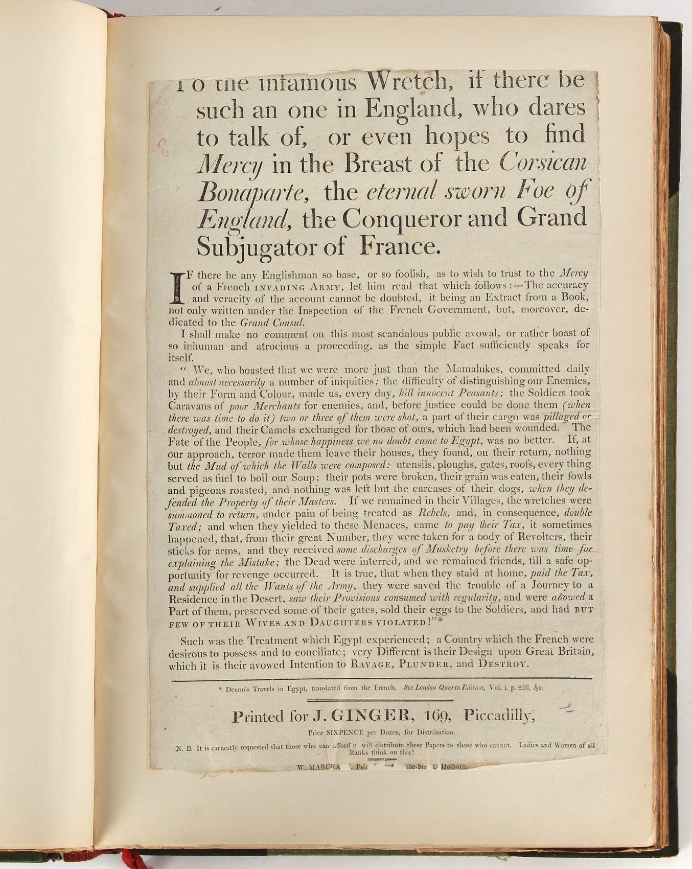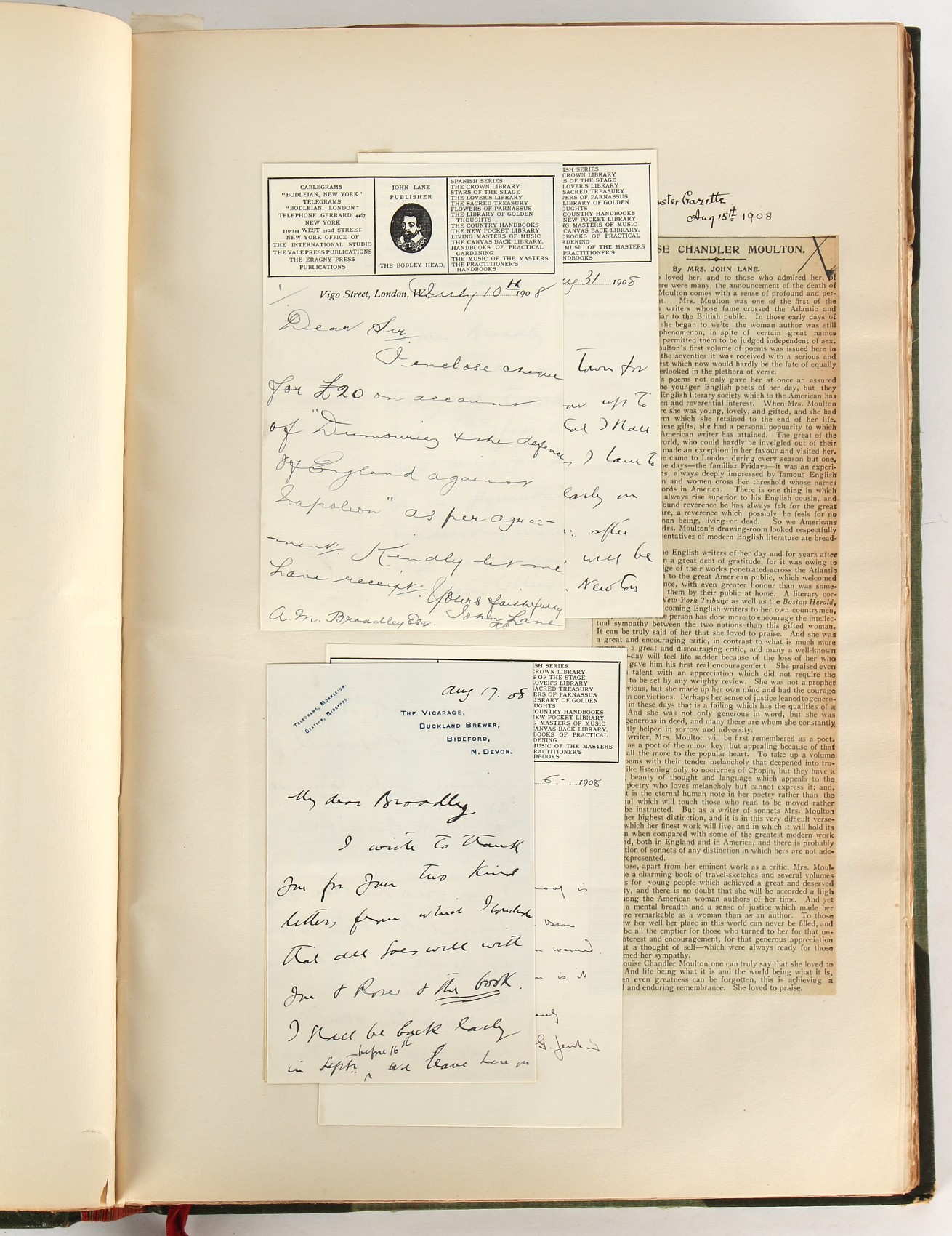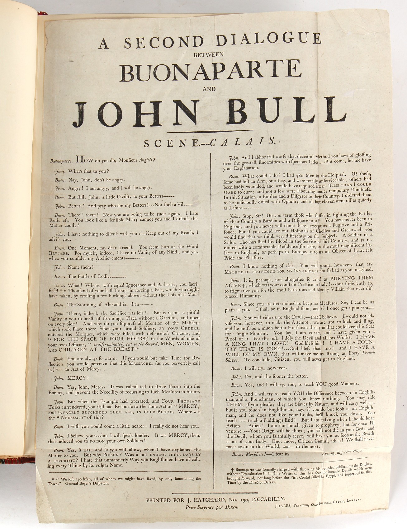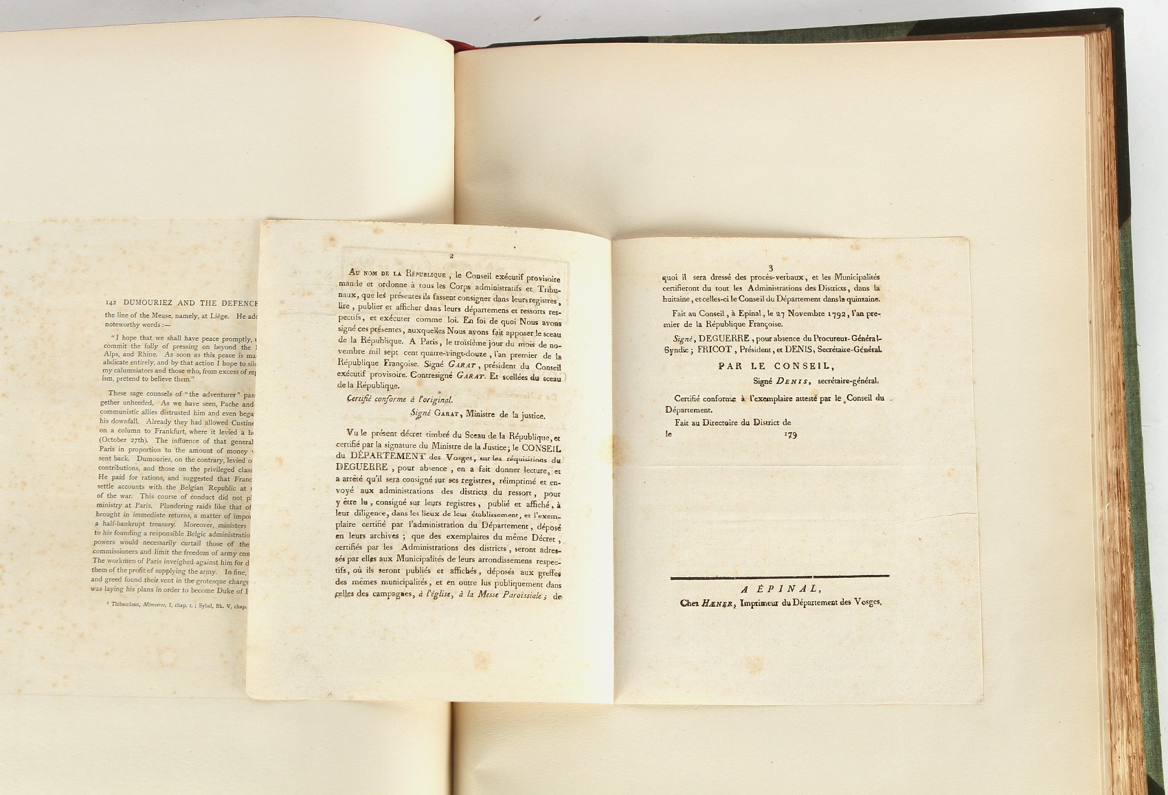 Property of a lady - Napoleonic historical interest - BROADLEY, Alexander Meyrick, and ROSE, John Holland - 'Dumouriez and the Defence of England against Napoleon' - two volume set, the personal 'Extra-Illustrated' or 'Grangerized' (or 'Grangerised') copies of Alexander Meyrick Broadley (1847-1916), London, John Lane, The Bodley Head, 1909, with tipped-in invoice from William Brendon & Son Limited Printers, Plymouth, dated 7th Sept. 1908 for £2 - - 'To one special copy pulled upon large paper, also 200 folio plain sheets', extra-illustrated or augmented with a large quantity of contemporarily hand-coloured and monochrome cartoon or caricature satirical prints, original drawings & watercolours, printed broadsides, etc., each affixed at the edges only into a window cut in to each plain folio sheet (so that backs are open & visible), Volume One including six tipped-in manuscript letters from Herbert H. Raphael (Major Sir Herbert Henry Raphael, 1st Baronet, 1859–1924) and twenty-six tipped-in manuscript letters from John Holland Rose (1855-1942) and two manuscript letters (one being four-sided) from Field Marshal Lord Roberts (1832-1914), and many other ms letters including some from Cambrai (Cambray), France (where Dumouriez was born), and the publishers (including the original contract between the authors and the publishers), all regarding the book and its compilation, also including twelve original ink manuscript letters by the subject of the book Charles Francois du Perier Dumouriez (1739-1823) (a further 16 letters by him are in Volume Two), the first dated 1765, the second (four sided) from Versailles dated 1772, the third (four sided) dated 1782, the fourth, fifth, sixth, seventh, eighth, ninth and tenth all dated 1792 when Dumouriez was Ministre des Affairs Etrangeres, Ministre de la Guerre, and Chef de L'Armee du Nord, an important ink manuscript letter from Dumouriez dated 1793 (two sided) consulting Charles James Fox on finding refuge in London (with letter from the dealer P.F. Madigan in Fifth Avenue, New York, regarding Boardley's purchase of this letter for $40), another ms letter from Dumouriez (two sided) dated 1796, and another from Antoine-Marie Chamans de Lavallette (Directeur General des Postes under Napoleon), the prints including Piercy Roberts after George Murgatroyd Woodward - 'John Bull and His Friends Commemorating The Peace' (1802); 'A Cock and Bull Story' (1803), published by Percy Roberts; a small pencil drawing portrait of Dumouriez initialled J.D. and dated 9 Oct. '69; 'La Retour en Angleterre' (we can find no record of this print); 'Carte des Descentes Faites en Angleterre et en Irlande Depuis Guillaume la Conquérant jusqu'à nos jours' (Map of the Invasions of England and Ireland from William the Conqueror to the Present) (1798), hand-coloured, with accompanying text; 'Capture of Bonaparte's Carriage', published by Edwards, 1818; a signed watercolour by G. Heberden entitled 'Genl. Dumouriez marching the Sans Culottes into Holland', 19.5 by 32.5cms.; 'A Dose for Dumourier, Evacuation of Holland and Brabant' (monochrome); and James Gillray - 'Dumourier dining in state at St James's, on the 15th of May, 1793' (monochrome), Volume Two including numerous broadsides or notices, some anti-Napoleon propaganda, one a folding monochrome broadside entitled 'An ABSTRACT of An Act for providing an Augmentation to the MILITIA, to be trained and exercised in the Manner therein directed; and for enabling His Majesty to cause the same to be embodied, in case of Necessity, for the Defence of these Kingdoms', printed by George Eyre and Andrew Strahan, 1796; lists of recruited foreign soldiers, etc.; an 'Army of Reserve Act' broadside for the Parish of St. Clement Danes, dated 1803; a Jan Kip folded engraving of Lulworth Castle entitled 'Lullworth Castle in Dorsetshire, The Seat of Humphry Weld'; other folding maps; several printed patriotic song scores of the period; a ms autograph ink sheet entitled 'Verses written on the threatened Invasion', by B. Atkinson of Bath'; a contemporary 60-page plus index ink ms booklet entitled 'Internal Defence of Essex', listing the names & number of carts & horses for each village or town to be called upon in the event of invasion; a printed list of 'Loyal Colchester Volunteers', dated July 1803; this second volume also includes a further 16 ink ms letters by Dumouriez dating from 1804 to 1822; and much more (helpfully, Broadley added a ms index of the extra illustrations); each volume approximately 20.5 by 14ins. (52 by 35.5cms.) (overall) (2). Footnote - Alexander Meyrick Broadley (1847-1916) was a British author, barrister, collector and social figure, known for defending Ahmed 'Urabi after the Urabi Revolt. Broadley penned numerous historical works later in life, particularly regarding Napoleon and his era. Among the works he authored or co-authored are 'Napoleon and the Invasion of England: The Story of the Great Terror' (London, 1908); 'Nelson’s Hardy: His Life, Letters and Friends' (London, 1909); 'Napoleon in Caricature 1795-1821' (London, 1911); and 'Napoleon in Exile' (London, 1914). Broadley was known as a celebrated grangeriser (or extra-illustrator) of books, and one of his greatest achievements was the creation, with the assistance of Daniell, of an extra-illustrated set of Rose’s 'Life of Napoleon I' and Rosebery’s 'Napoleon. The Last Phase', by inlaying and extending the works from three octavo to twenty-eight folio volumes with engravings, portraits, manuscripts, autograph letters, etc. over a period of four years. This monumental work was bought by George Nathaniel Curzon, Marquess Curzon of Kedleston at the auction of Broadley’s library held in four sales between 1916 and 1918, and Curzon later bequeathed the set to the Bodleian Library, Oxford.