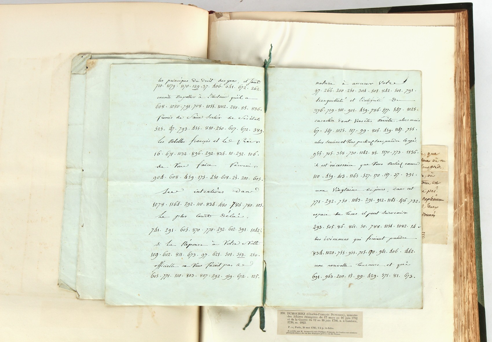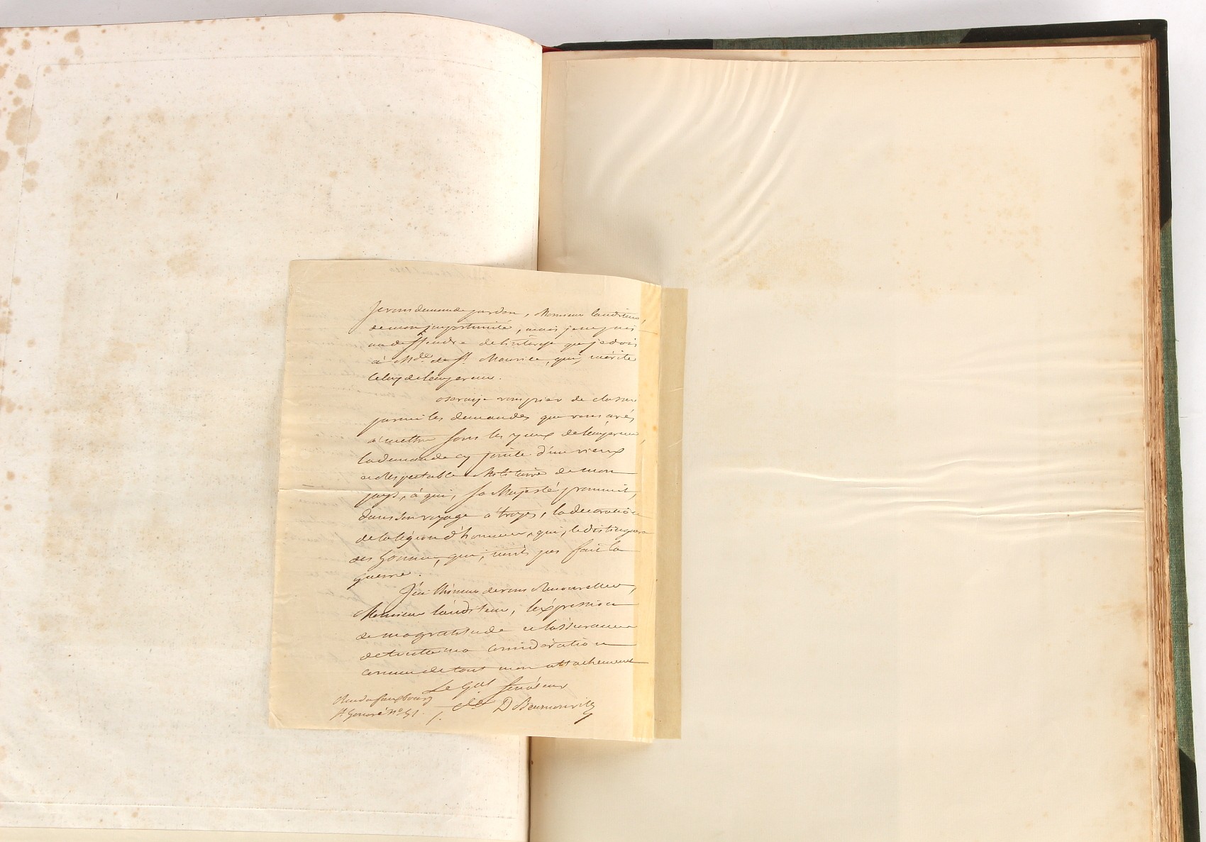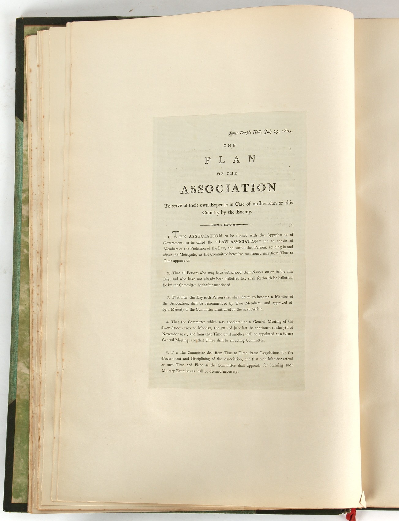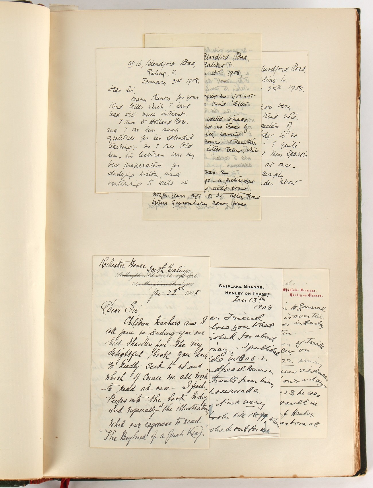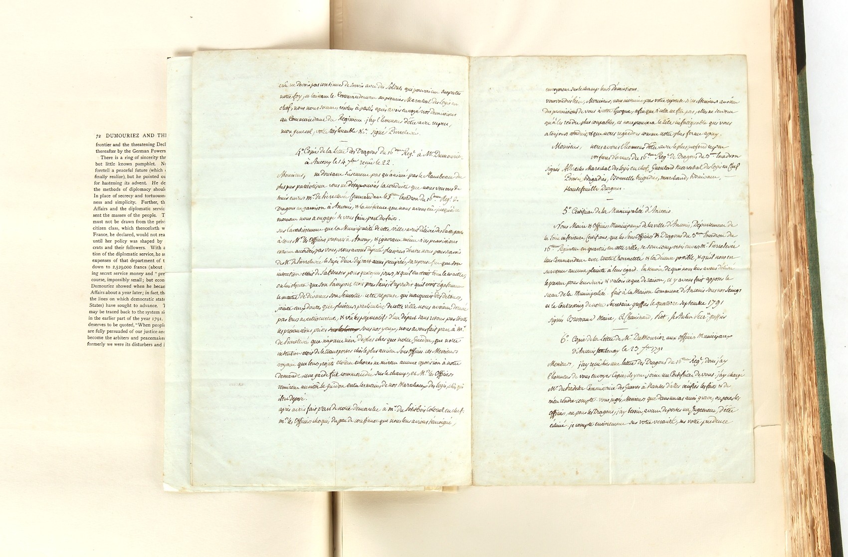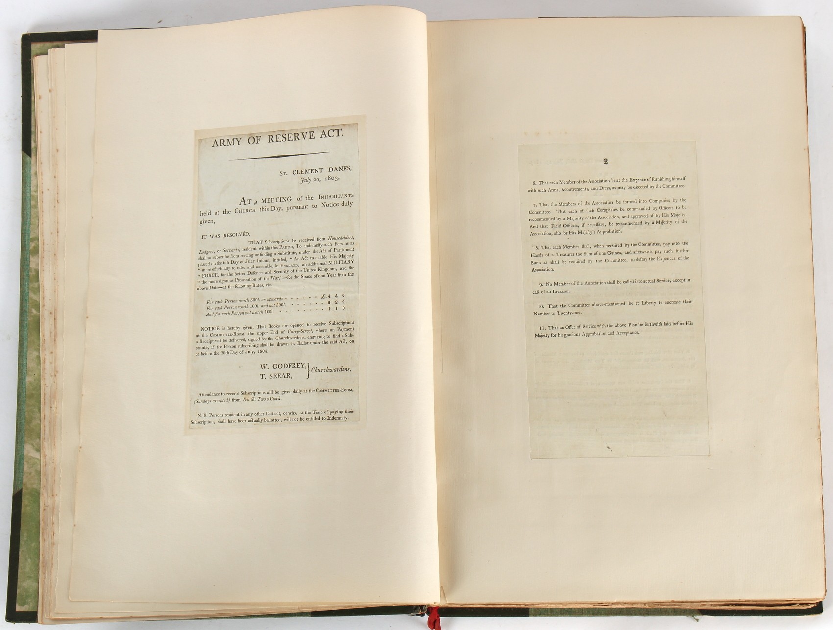Property of a lady - Napoleonic historical interest - BROADLEY, Alexander Meyrick, and ROSE, John Holland - 'Dumouriez and the Defence of England against Napoleon' - two volume set, the personal 'Extra-Illustrated' or 'Grangerized' (or 'Grangerised') copies of Alexander Meyrick Broadley (1847-1916), London, John Lane, The Bodley Head, 1909, with tipped-in invoice from William Brendon & Son Limited Printers, Plymouth, dated 7th Sept. 1908 for £2 - - 'To one special copy pulled upon large paper, also 200 folio plain sheets', extra-illustrated or augmented with a large quantity of contemporarily hand-coloured and monochrome cartoon or caricature satirical prints, original drawings & watercolours, printed broadsides, etc., each affixed at the edges only into a window cut in to each plain folio sheet (so that backs are open & visible), Volume One including six tipped-in manuscript letters from Herbert H. Raphael (Major Sir Herbert Henry Raphael, 1st Baronet, 1859–1924) and twenty-six tipped-in manuscript letters from John Holland Rose (1855-1942) and two manuscript letters (one being four-sided) from Field Marshal Lord Roberts (1832-1914), and many other ms letters including some from Cambrai (Cambray), France (where Dumouriez was born), and the publishers (including the original contract between the authors and the publishers), all regarding the book and its compilation, also including twelve original ink manuscript letters by the subject of the book Charles Francois du Perier Dumouriez (1739-1823) (a further 16 letters by him are in Volume Two), the first dated 1765, the second (four sided) from Versailles dated 1772, the third (four sided) dated 1782, the fourth, fifth, sixth, seventh, eighth, ninth and tenth all dated 1792 when Dumouriez was Ministre des Affairs Etrangeres, Ministre de la Guerre, and Chef de L'Armee du Nord, an important ink manuscript letter from Dumouriez dated 1793 (two sided) consulting Charles James Fox on finding refuge in London (with letter from the dealer P.F. Madigan in Fifth Avenue, New York, regarding Boardley's purchase of this letter for $40), another ms letter from Dumouriez (two sided) dated 1796, and another from Antoine-Marie Chamans de Lavallette (Directeur General des Postes under Napoleon), the prints including Piercy Roberts after George Murgatroyd Woodward - 'John Bull and His Friends Commemorating The Peace' (1802); 'A Cock and Bull Story' (1803), published by Percy Roberts; a small pencil drawing portrait of Dumouriez initialled J.D. and dated 9 Oct. '69; 'La Retour en Angleterre' (we can find no record of this print); 'Carte des Descentes Faites en Angleterre et en Irlande Depuis Guillaume la Conquérant jusqu'à nos jours' (Map of the Invasions of England and Ireland from William the Conqueror to the Present) (1798), hand-coloured, with accompanying text; 'Capture of Bonaparte's Carriage', published by Edwards, 1818; a signed watercolour by G. Heberden entitled 'Genl. Dumouriez marching the Sans Culottes into Holland', 19.5 by 32.5cms.; 'A Dose for Dumourier, Evacuation of Holland and Brabant' (monochrome); and James Gillray - 'Dumourier dining in state at St James's, on the 15th of May, 1793' (monochrome), Volume Two including numerous broadsides or notices, some anti-Napoleon propaganda, one a folding monochrome broadside entitled 'An ABSTRACT of An Act for providing an Augmentation to the MILITIA, to be trained and exercised in the Manner therein directed; and for enabling His Majesty to cause the same to be embodied, in case of Necessity, for the Defence of these Kingdoms', printed by George Eyre and Andrew Strahan, 1796; lists of recruited foreign soldiers, etc.; an 'Army of Reserve Act' broadside for the Parish of St. Clement Danes, dated 1803; a Jan Kip folded engraving of Lulworth Castle entitled 'Lullworth Castle in Dorsetshire, The Seat of Humphry Weld'; other folding maps; several printed patriotic song scores of the period; a ms autograph ink sheet entitled 'Verses written on the threatened Invasion', by B. Atkinson of Bath'; a contemporary 60-page plus index ink ms booklet entitled 'Internal Defence of Essex', listing the names & number of carts & horses for each village or town to be called upon in the event of invasion; a printed list of 'Loyal Colchester Volunteers', dated July 1803; this second volume also includes a further 16 ink ms letters by Dumouriez dating from 1804 to 1822; and much more (helpfully, Broadley added a ms index of the extra illustrations); each volume approximately 20.5 by 14ins. (52 by 35.5cms.) (overall) (2). Footnote - Alexander Meyrick Broadley (1847-1916) was a British author, barrister, collector and social figure, known for defending Ahmed 'Urabi after the Urabi Revolt. Broadley penned numerous historical works later in life, particularly regarding Napoleon and his era. Among the works he authored or co-authored are 'Napoleon and the Invasion of England: The Story of the Great Terror' (London, 1908); 'Nelson’s Hardy: His Life, Letters and Friends' (London, 1909); 'Napoleon in Caricature 1795-1821' (London, 1911); and 'Napoleon in Exile' (London, 1914). Broadley was known as a celebrated grangeriser (or extra-illustrator) of books, and one of his greatest achievements was the creation, with the assistance of Daniell, of an extra-illustrated set of Rose’s 'Life of Napoleon I' and Rosebery’s 'Napoleon. The Last Phase', by inlaying and extending the works from three octavo to twenty-eight folio volumes with engravings, portraits, manuscripts, autograph letters, etc. over a period of four years. This monumental work was bought by George Nathaniel Curzon, Marquess Curzon of Kedleston at the auction of Broadley’s library held in four sales between 1916 and 1918, and Curzon later bequeathed the set to the Bodleian Library, Oxford.