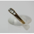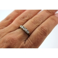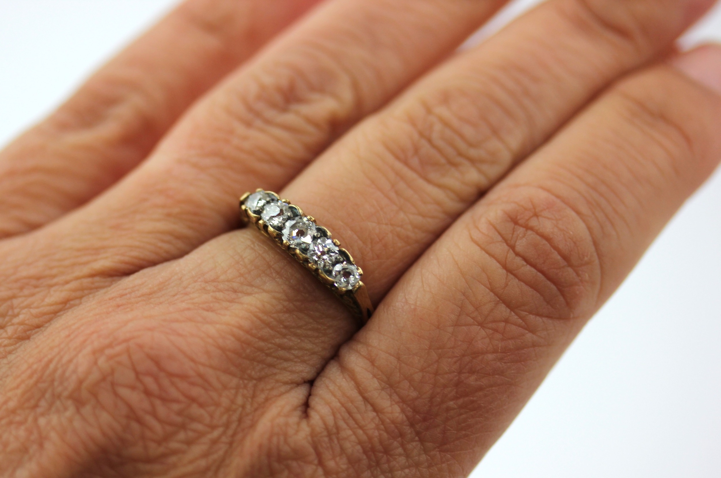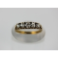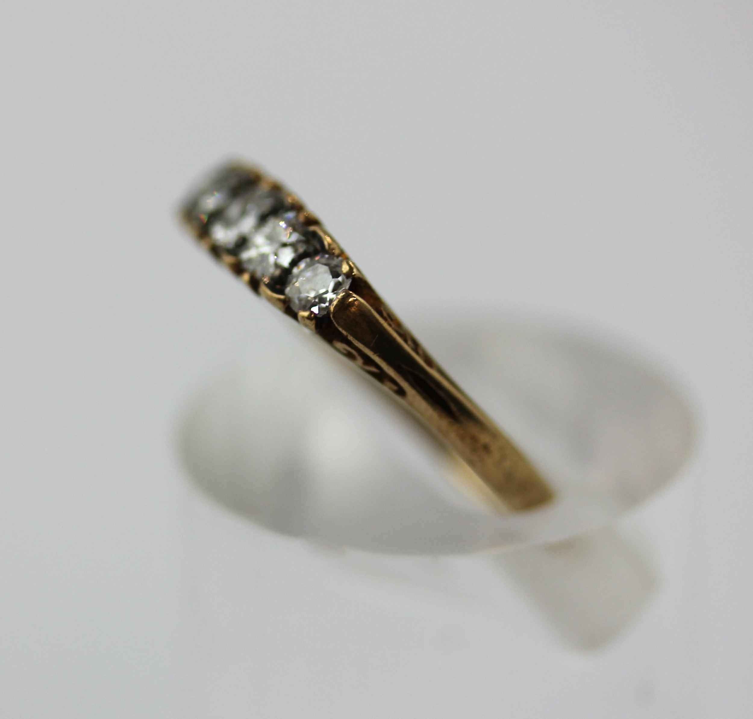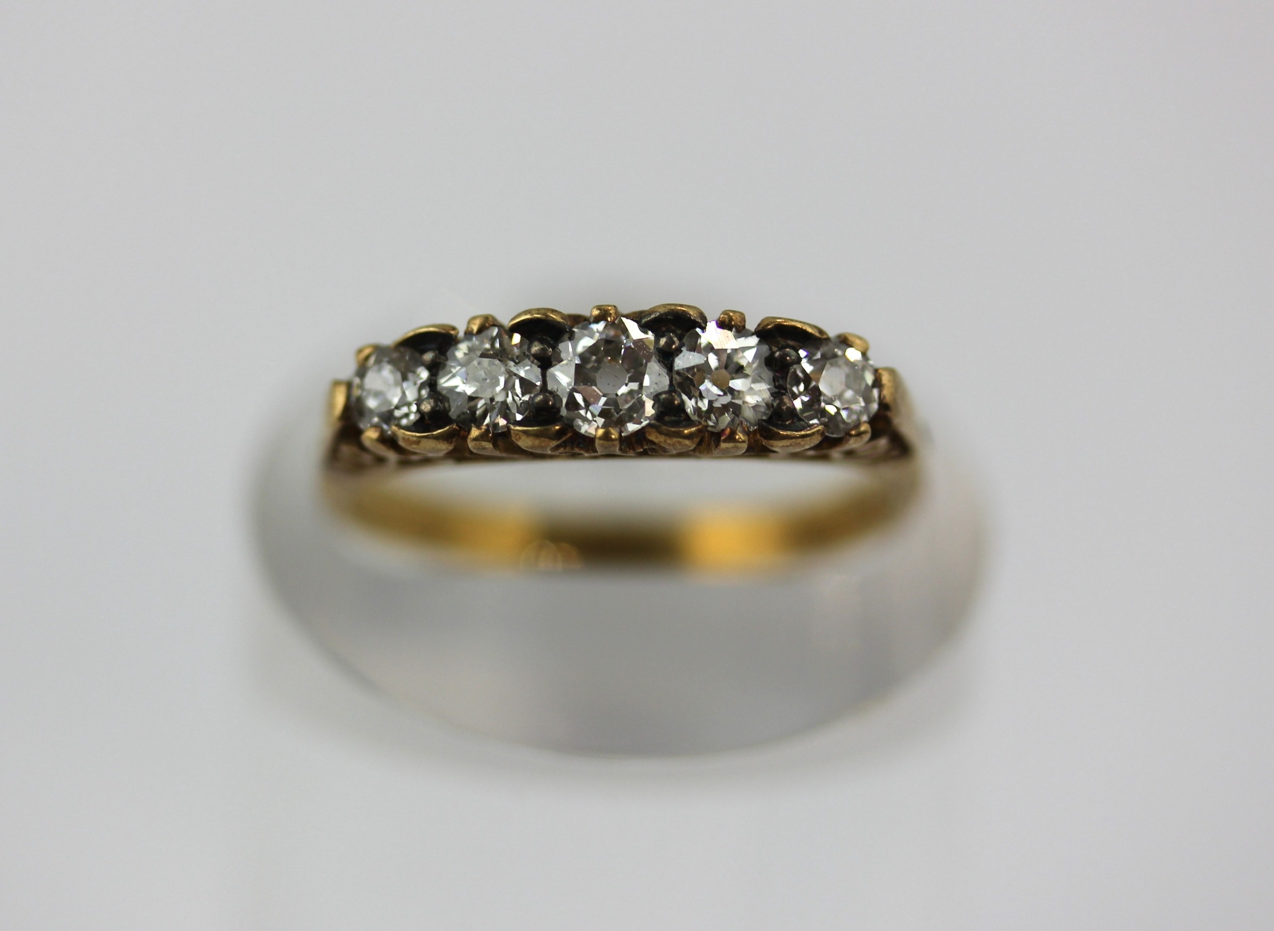 A gold and diamond five stone ring mounted with a row of graduated cushion shaped diamonds, the mount with scroll pierced sides, detailed '18ct', ring size P 1/2, gross weight 3.9g
