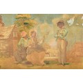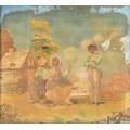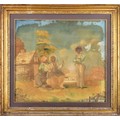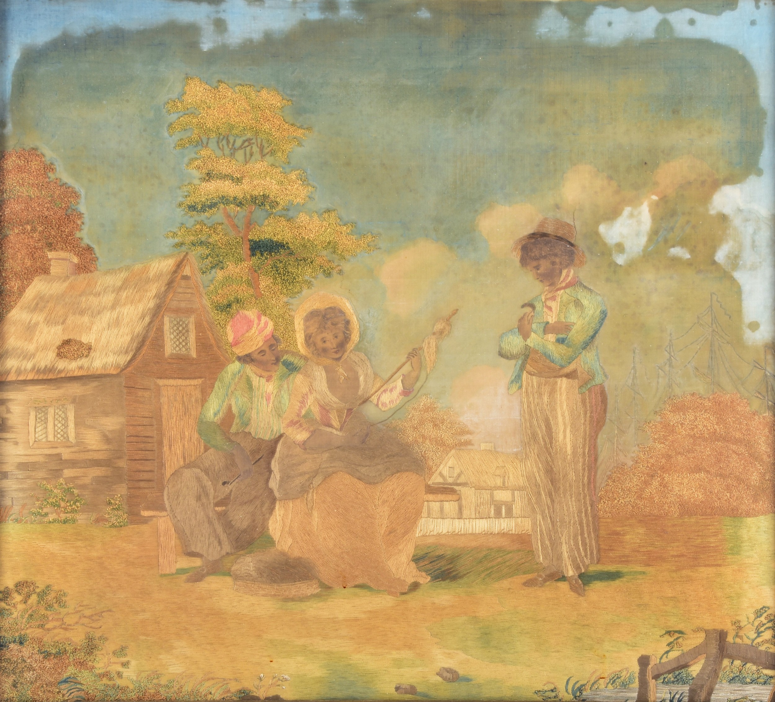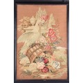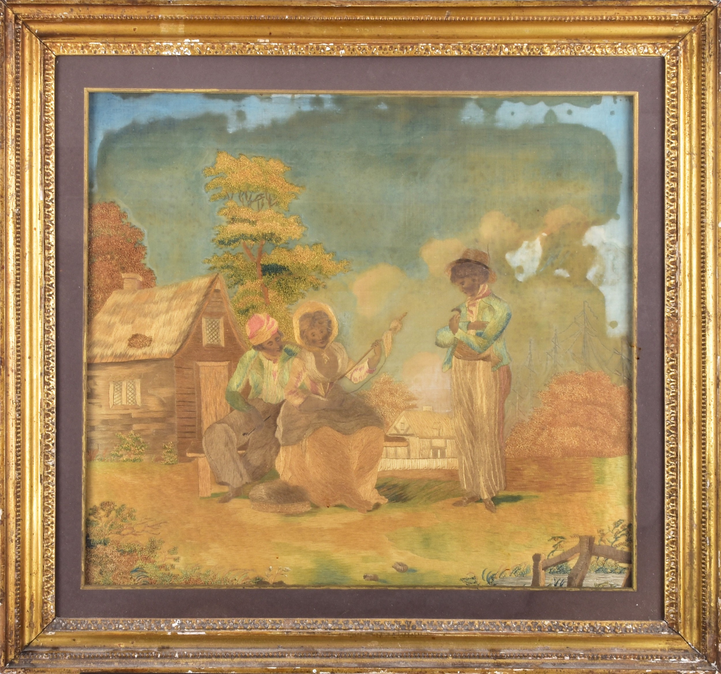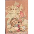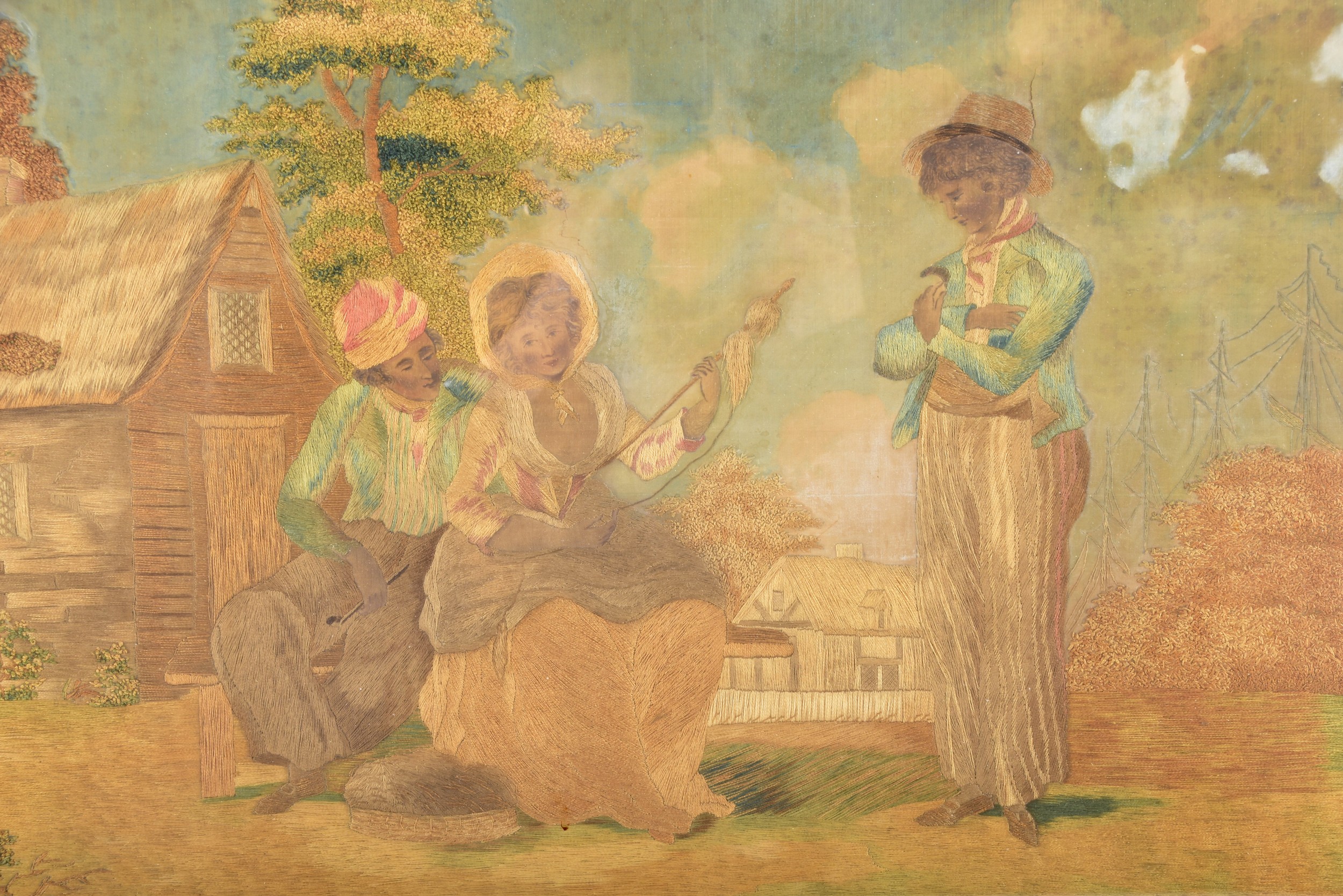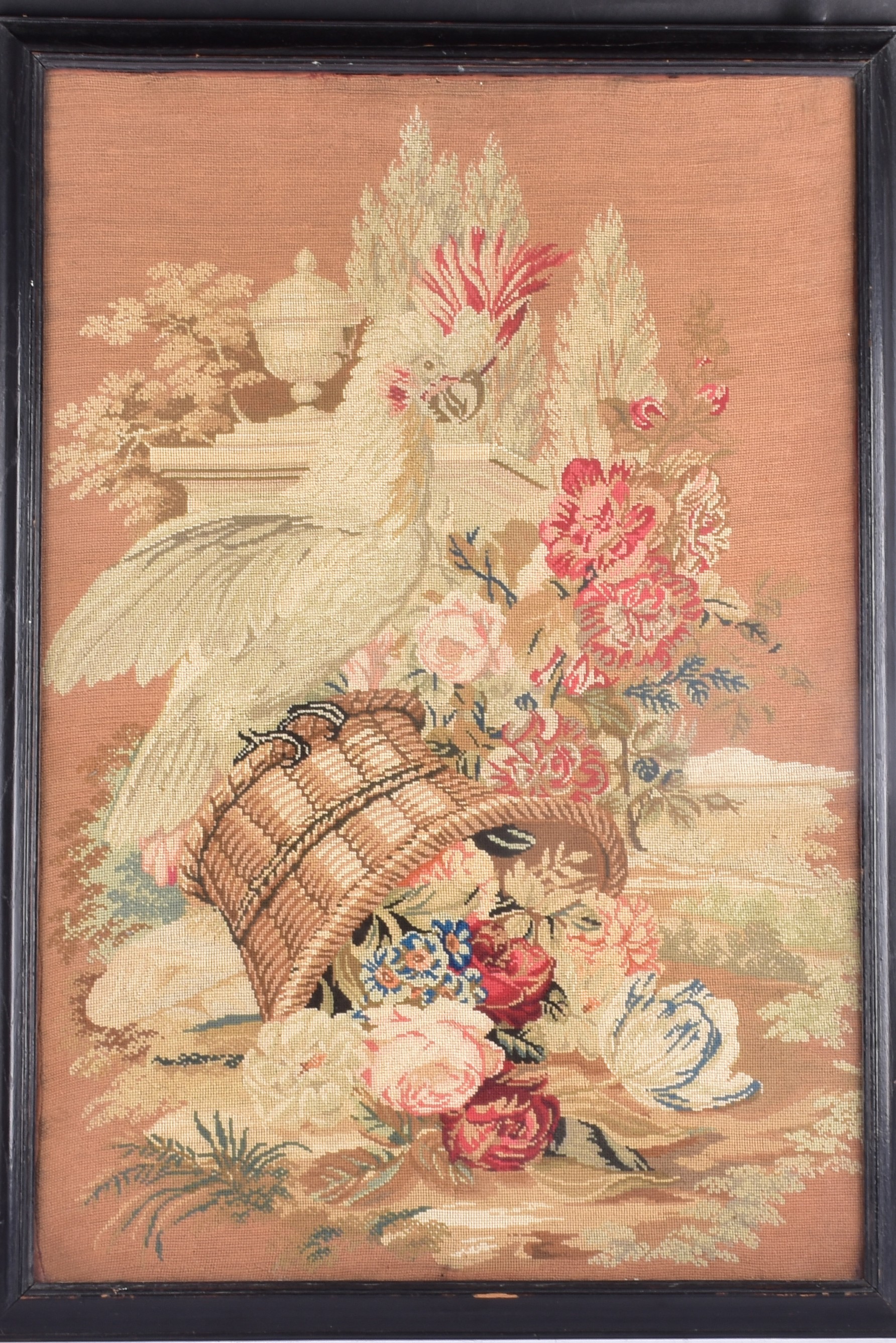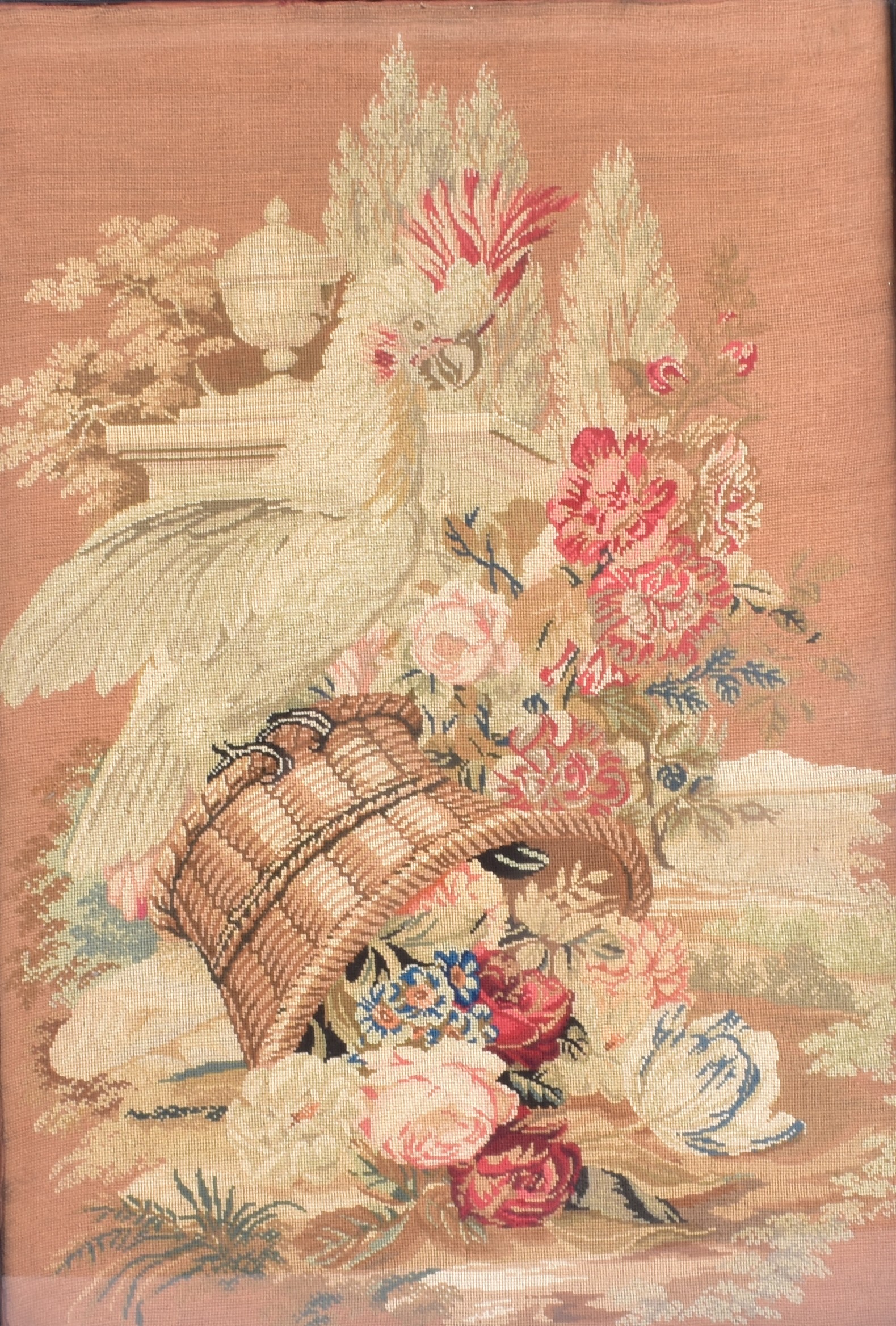 A mid to late 19th century silkwork picture, a pastoral scene of a shepherdess in a rural setting, spinning wool, observed by two sailors, the masts of a departing ship visible in the distance, 41 x 46 cm, framed and glazed, together with a tapestry featuring a cockatoo, 70 x 47.5cm. (2)