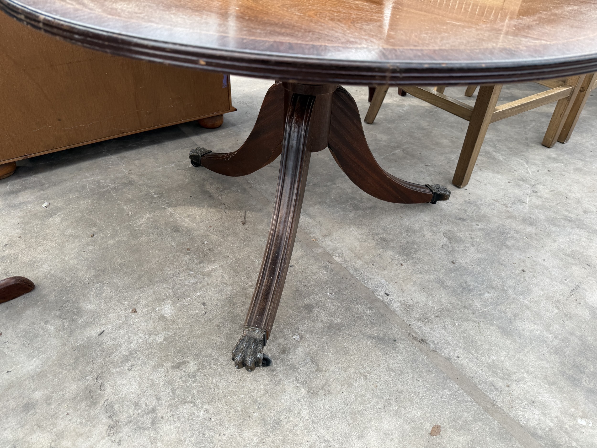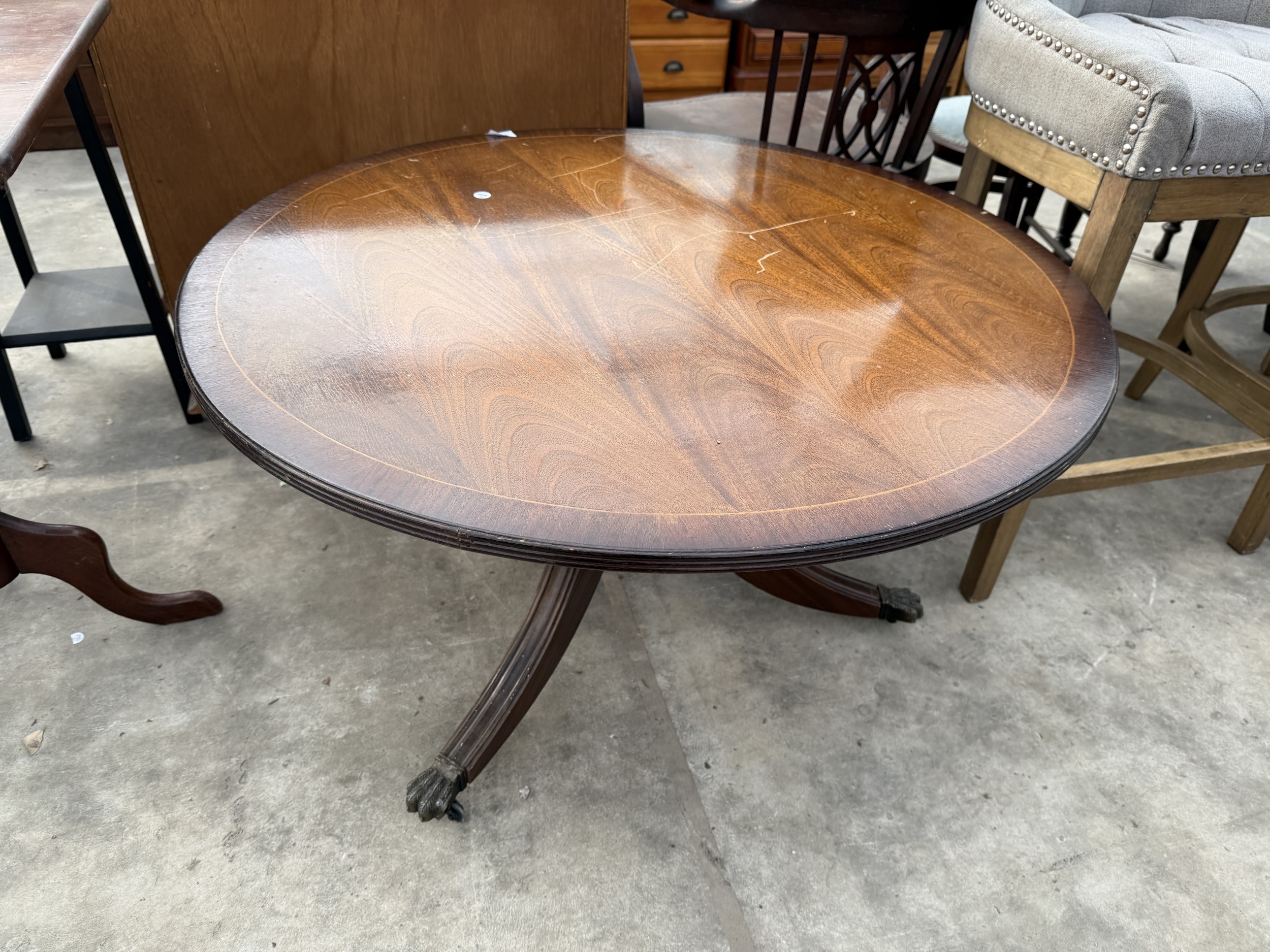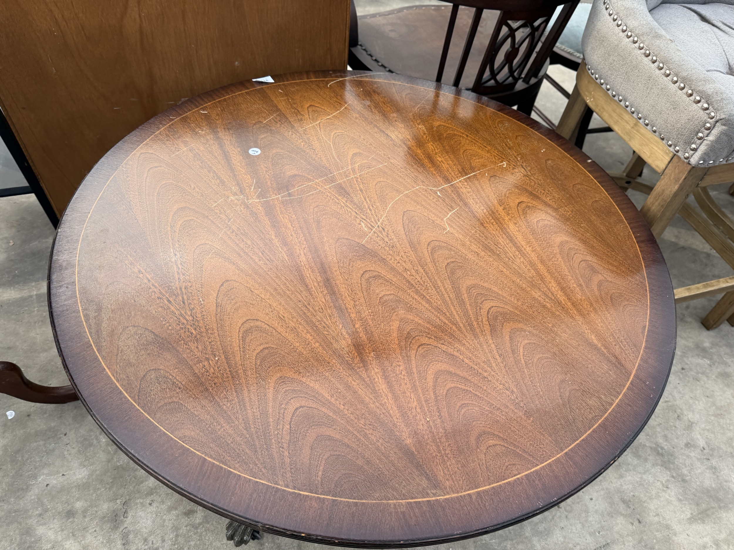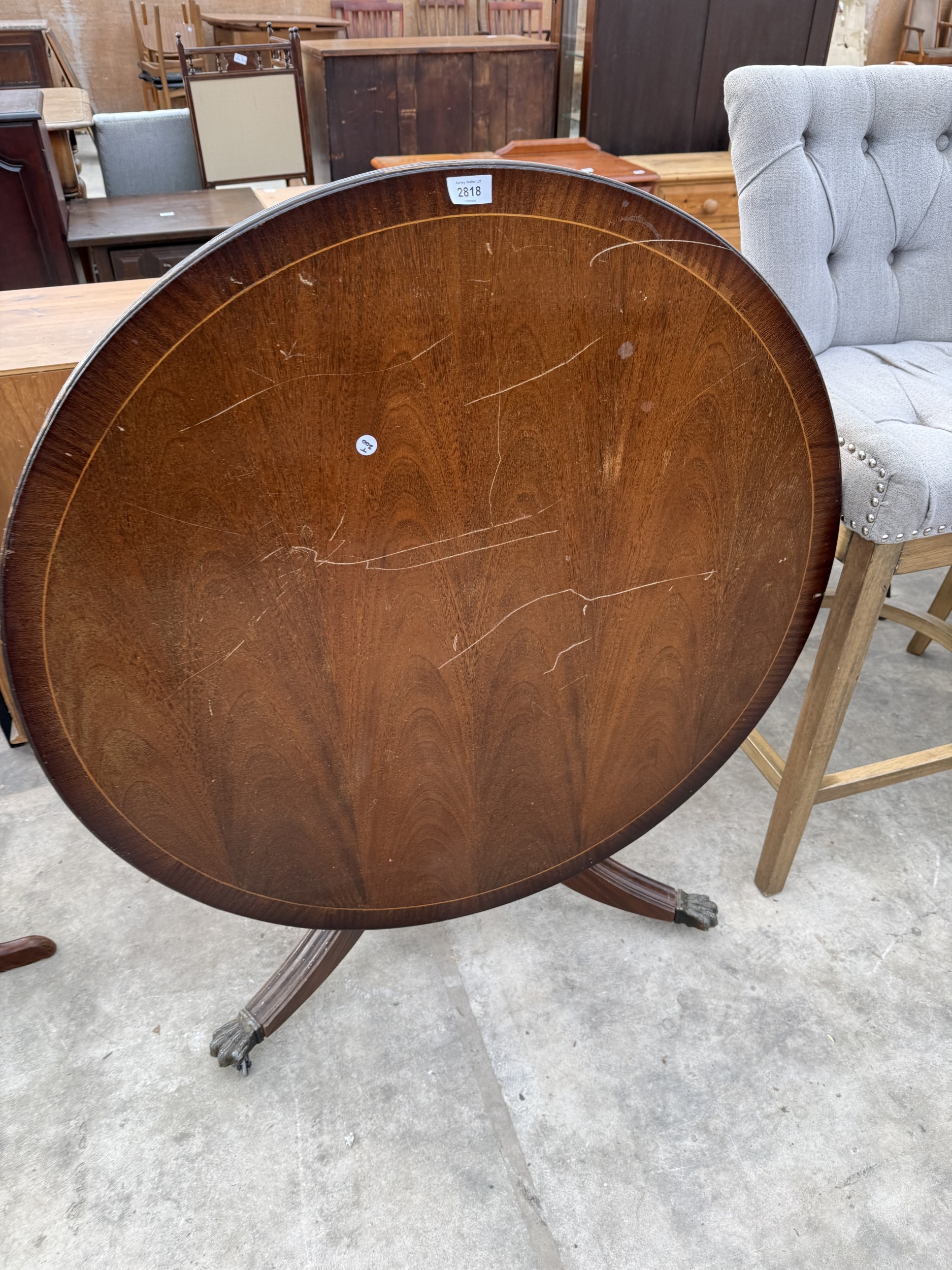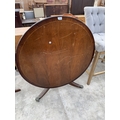 A MAHOGANY AND CROSSBANDED PEDESTAL TILT TOP TABLE, 36" DIAMETER