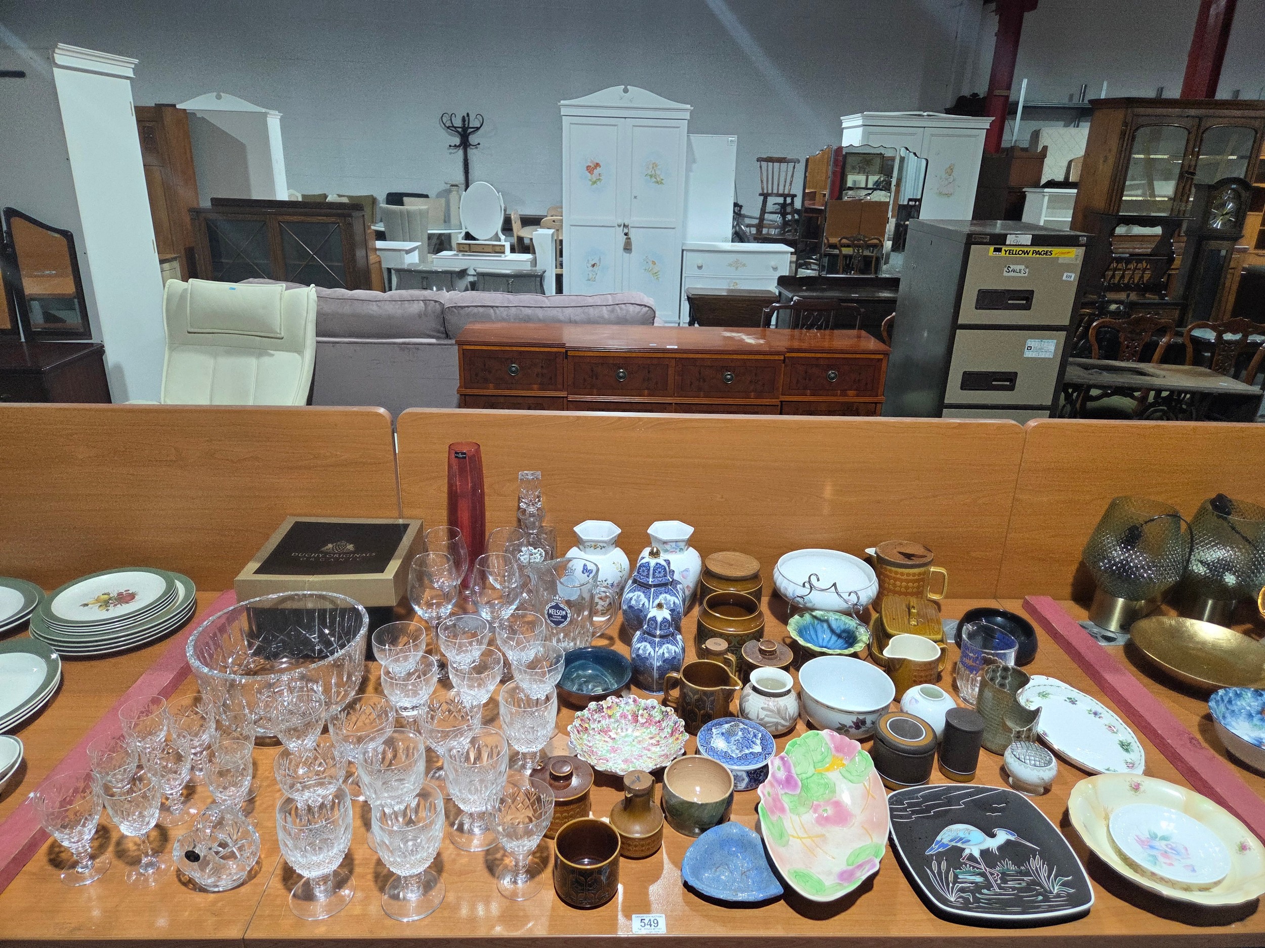 Decorative china and glassware to include a cut glass decanter, bowl, Hornsea, Aynsley, etc
