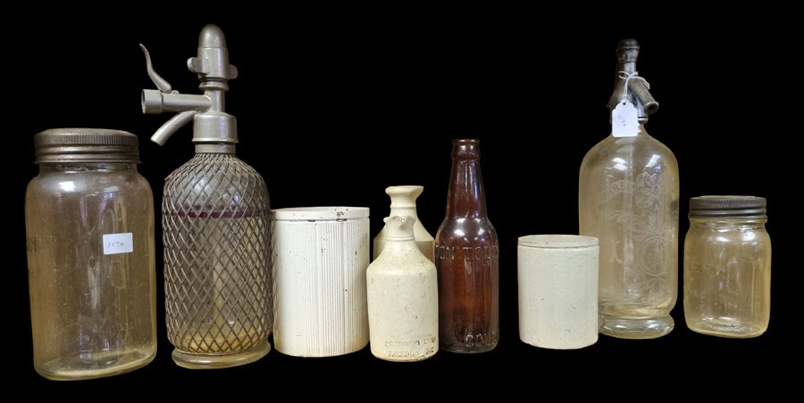 An Old 'Cantrell & Cochrane' Soda Syphon, Another and A Lot of Old Earthenware Jars, etc.