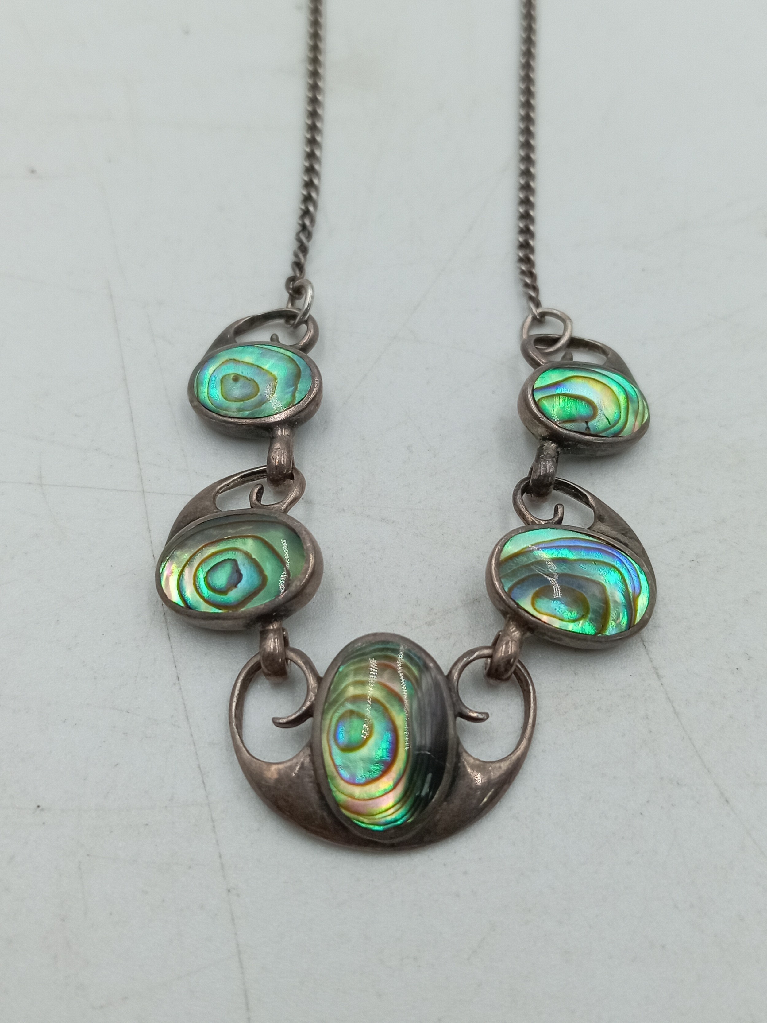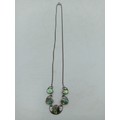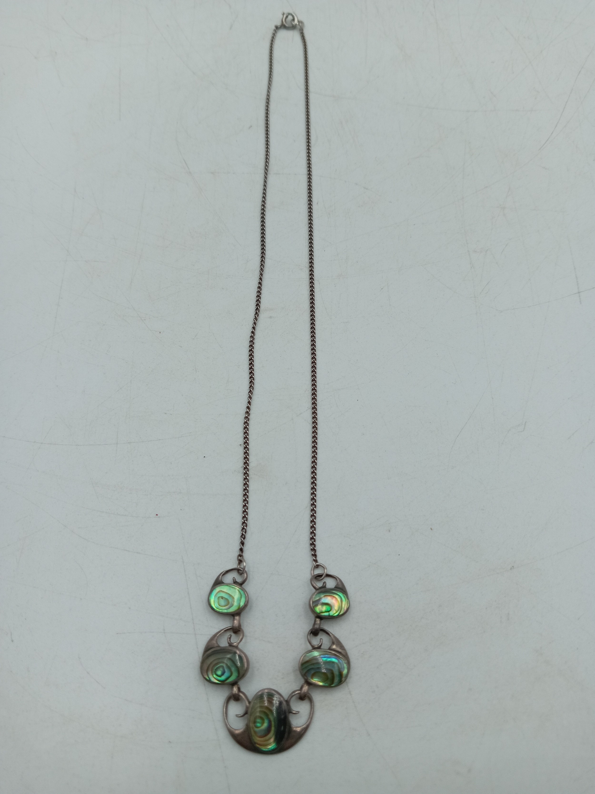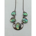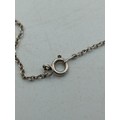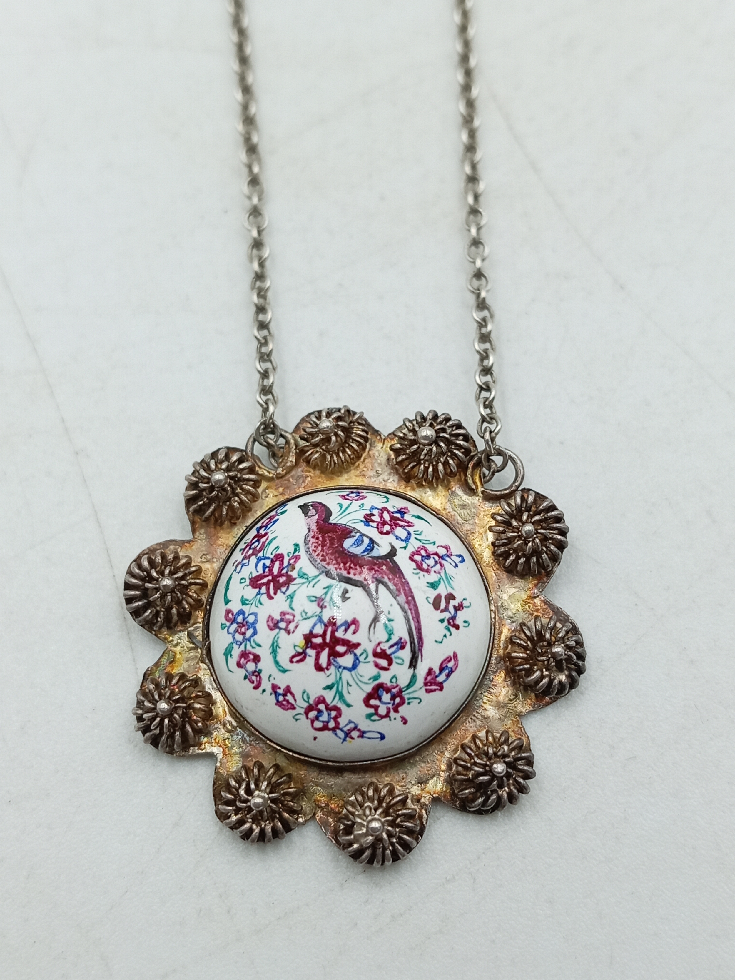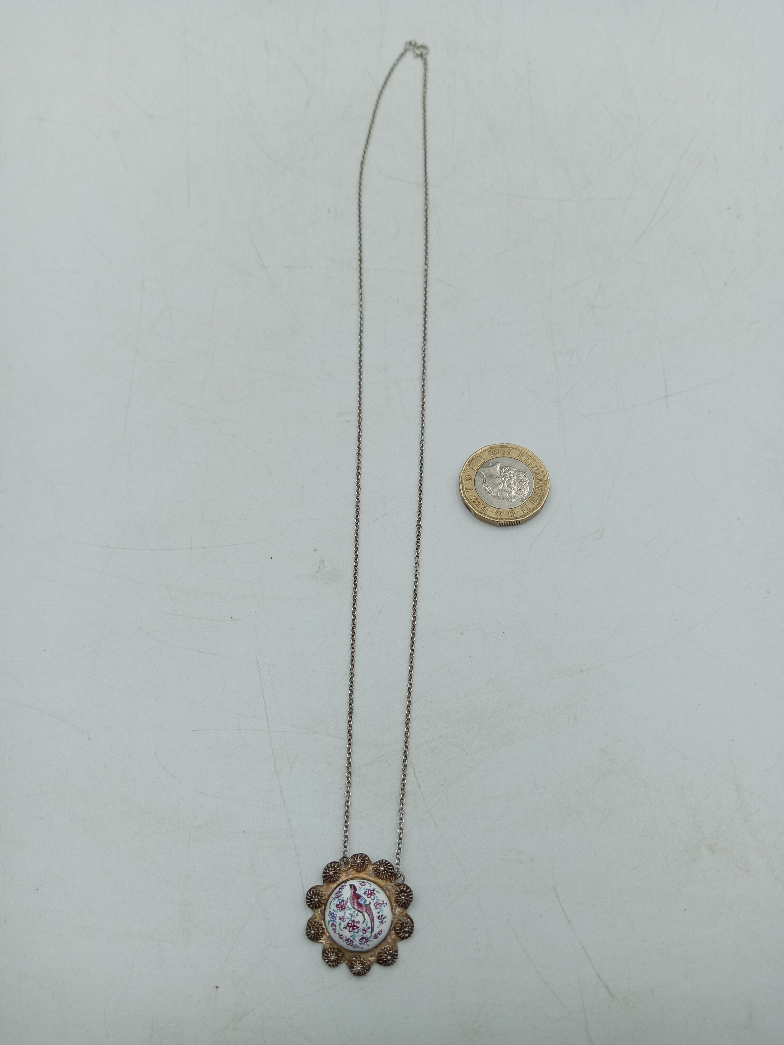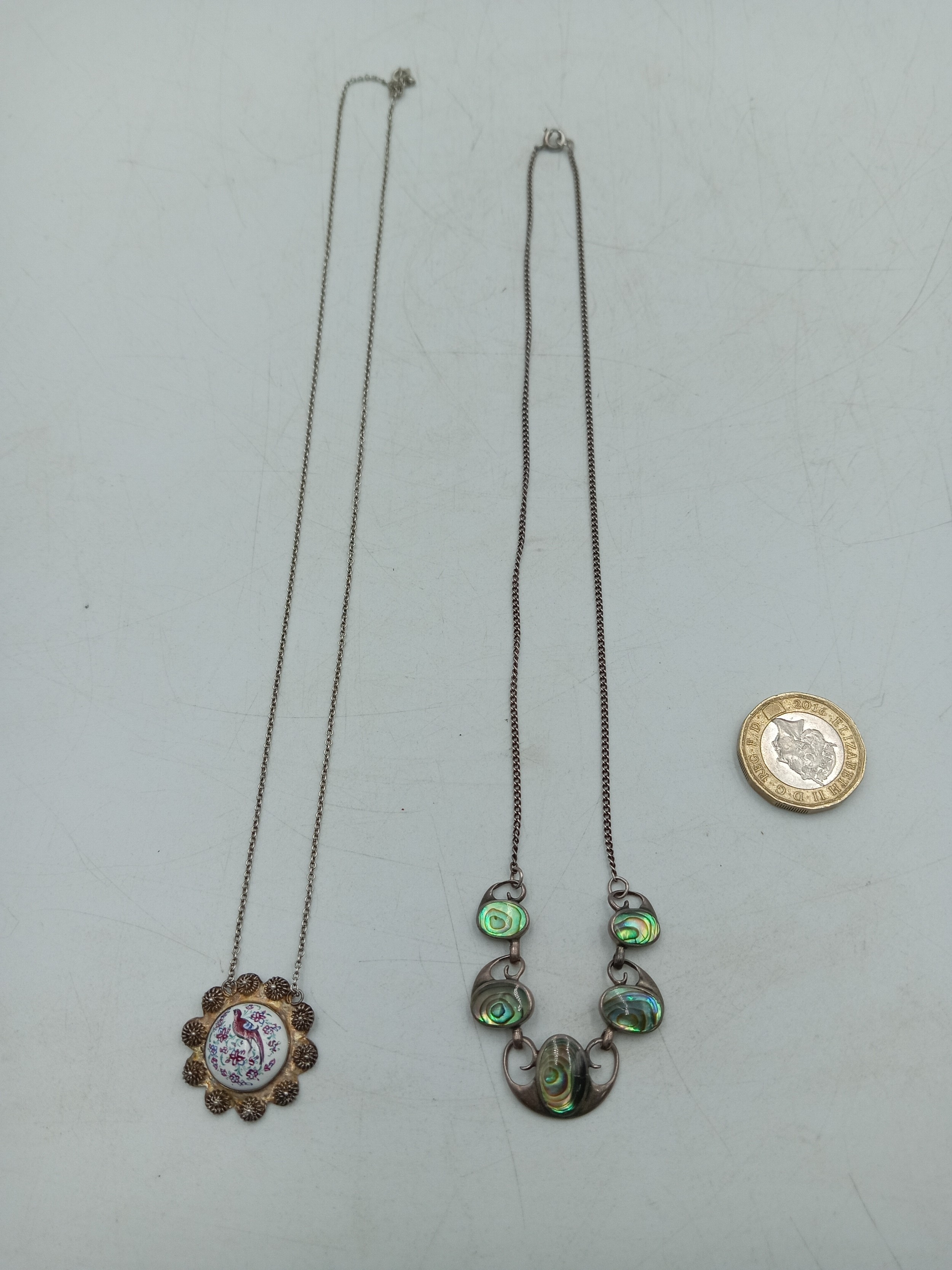 A pair of necklaces, one stamped "Stirling" with 5 iridescent stones set in white metal and a white metal necklace with an enamel centred pendant with a bird on it.