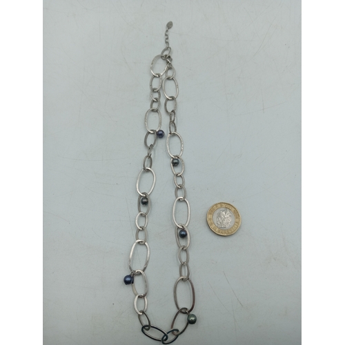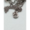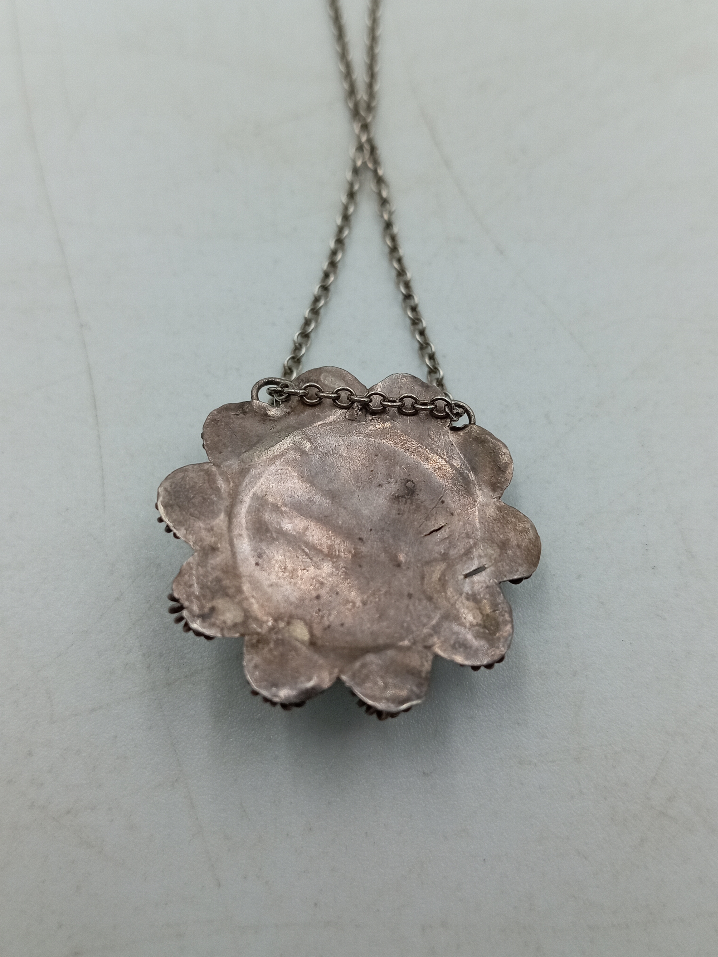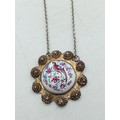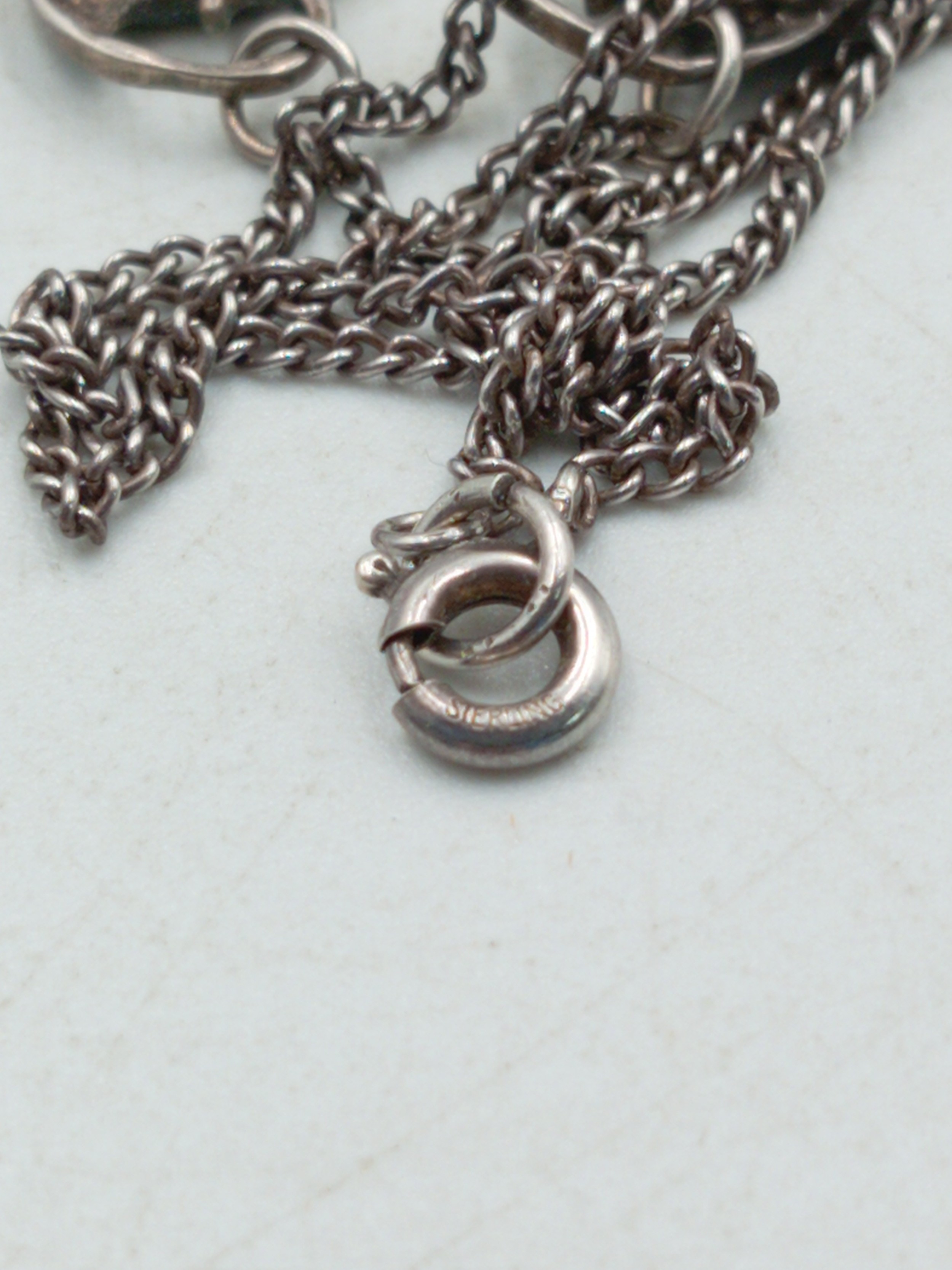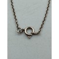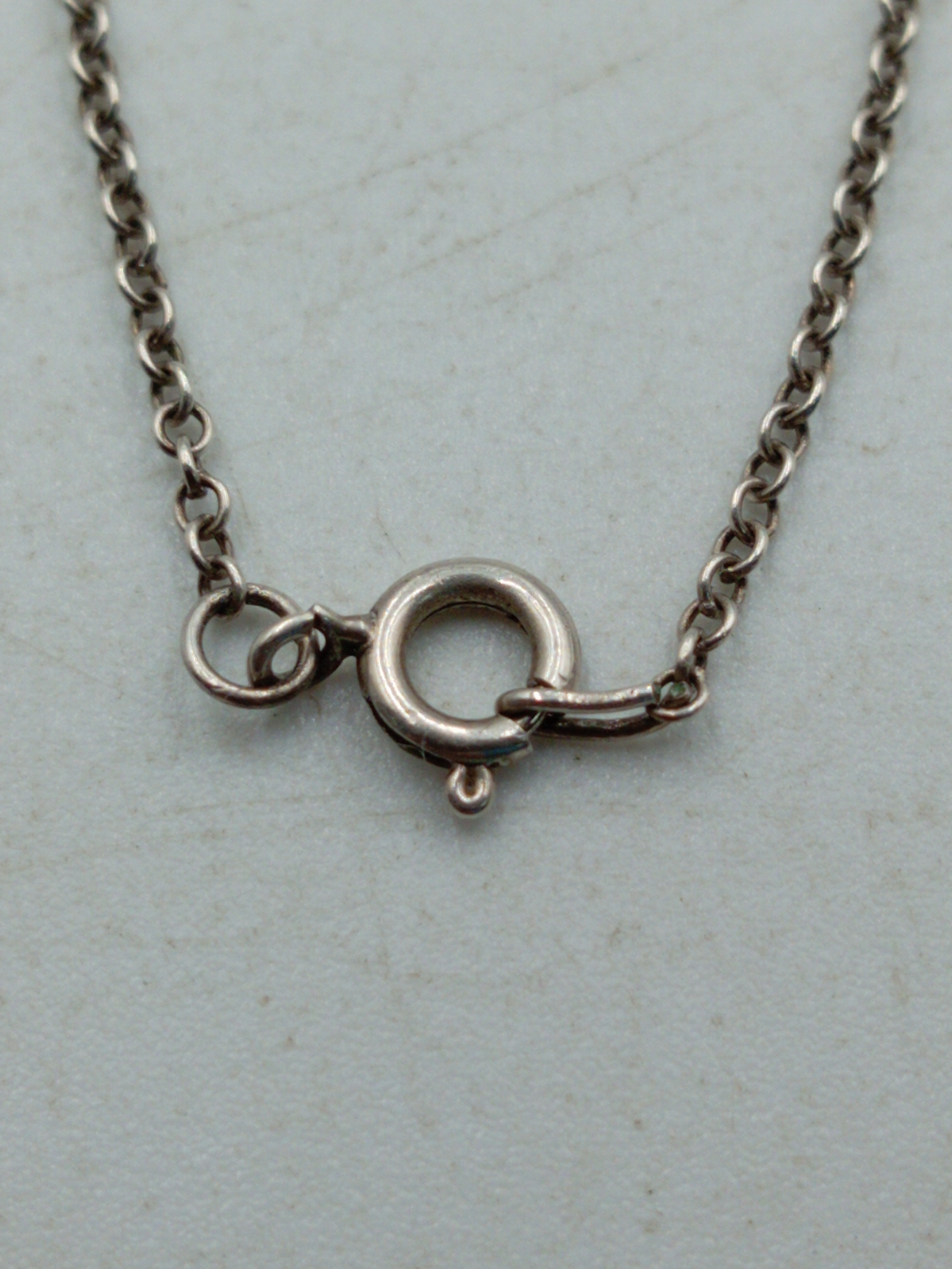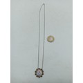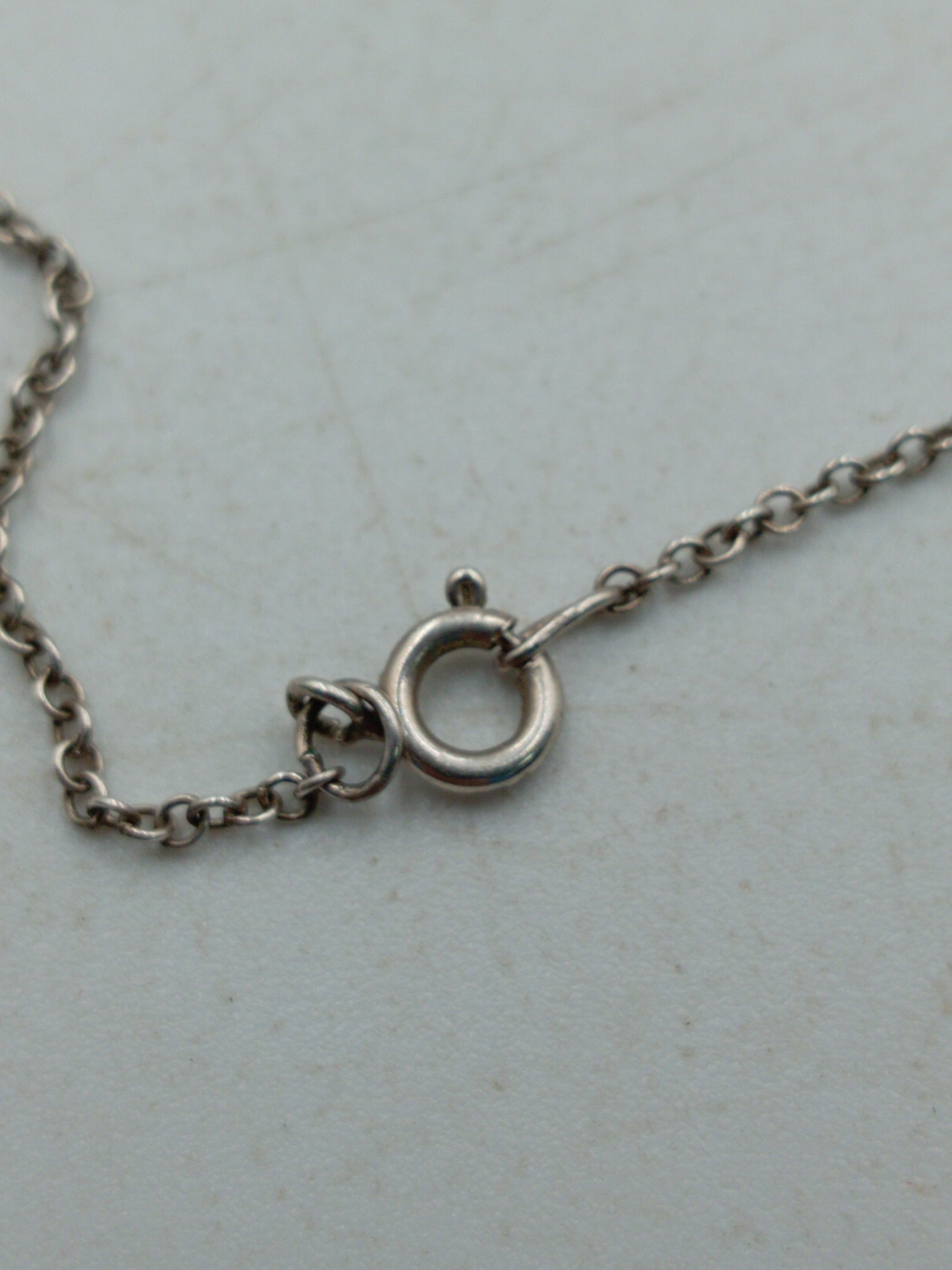 A pair of necklaces, one stamped "Stirling" with 5 iridescent stones set in white metal and a white metal necklace with an enamel centred pendant with a bird on it.