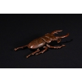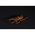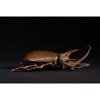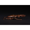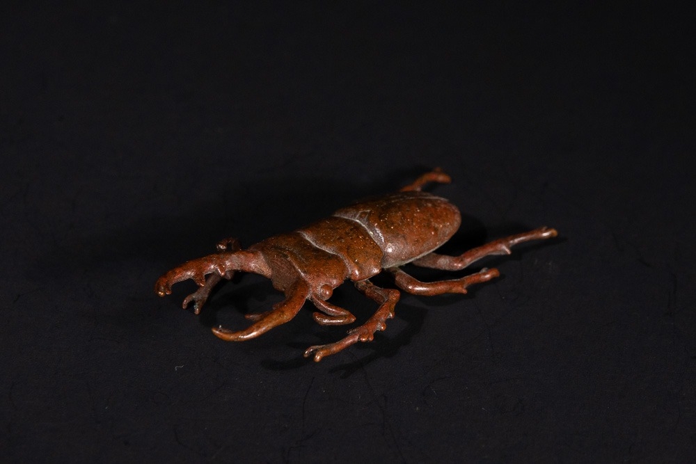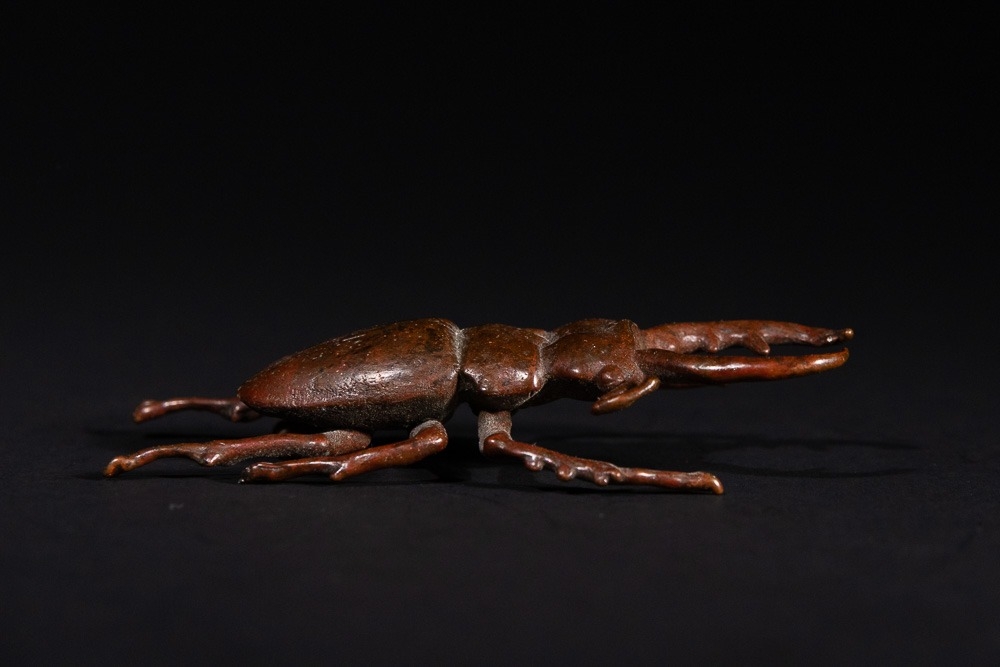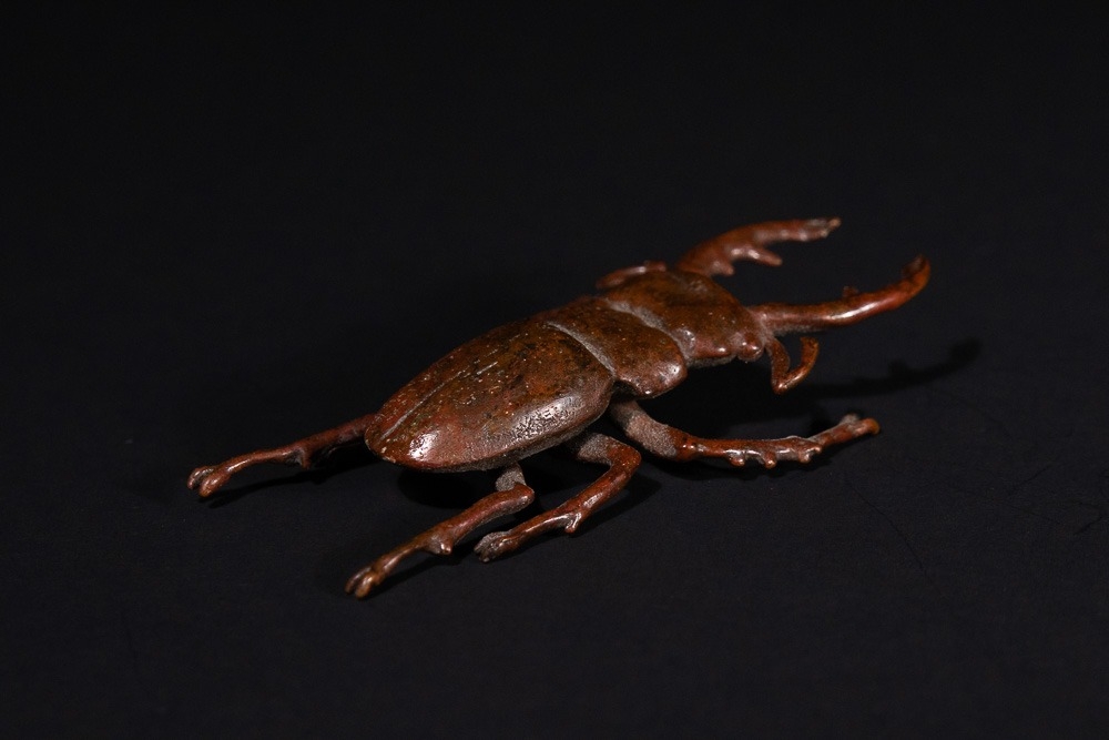 A Japanese Bronze Stag Beetle Okimono - A naturalistic sculpture of a stag beetle, cast in a patinated bronze, exhibiting a reddish-brown hue. The piece accurately depicts the insect's segmented body, six legs, antennae, and prominent mandibles with intricate detail.