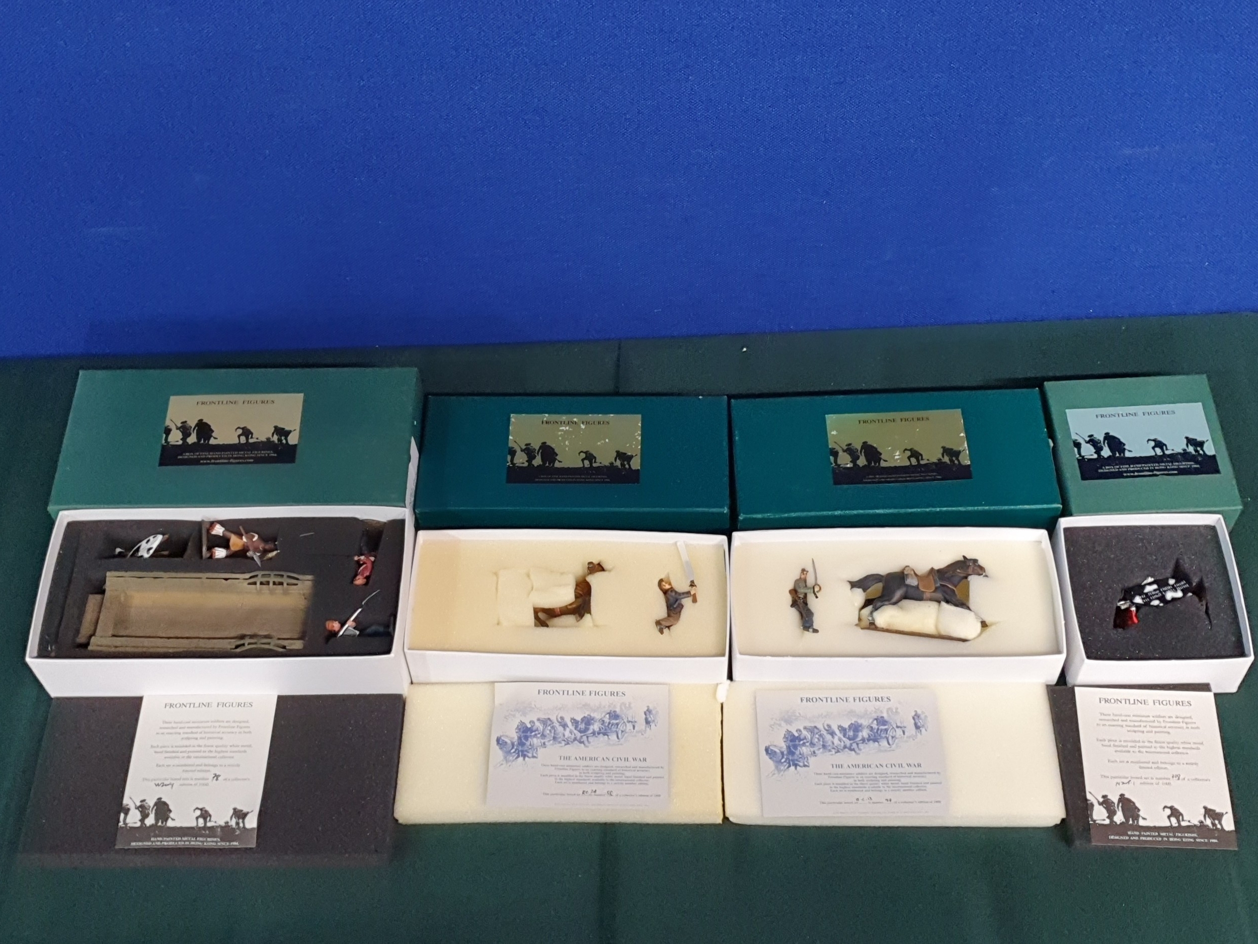 Four boxed Frontline Figures comprising American Civil War R.C.13. Confederate Cavalry Trooper type 13 and R.A.24. Confederate Cavalry Collapsing Trooper, Zulu Wars N.Z.W.P.1. Zulu running with captured jacket and WZW.1. Zulu Wars Wagons, 2 Zulus and 2 24th Foot fighting, contents M, boxes VG-Ex