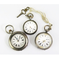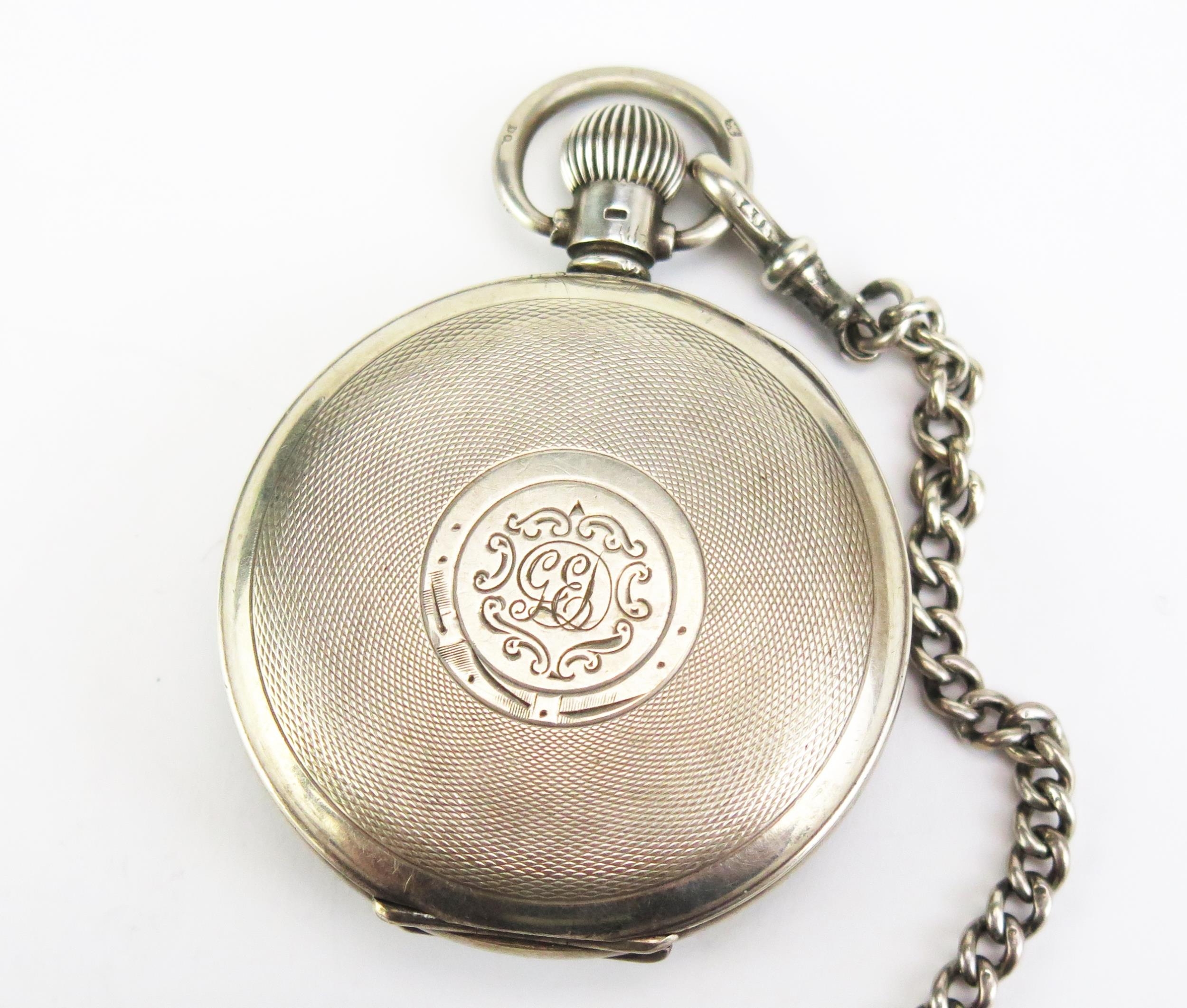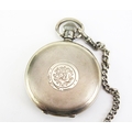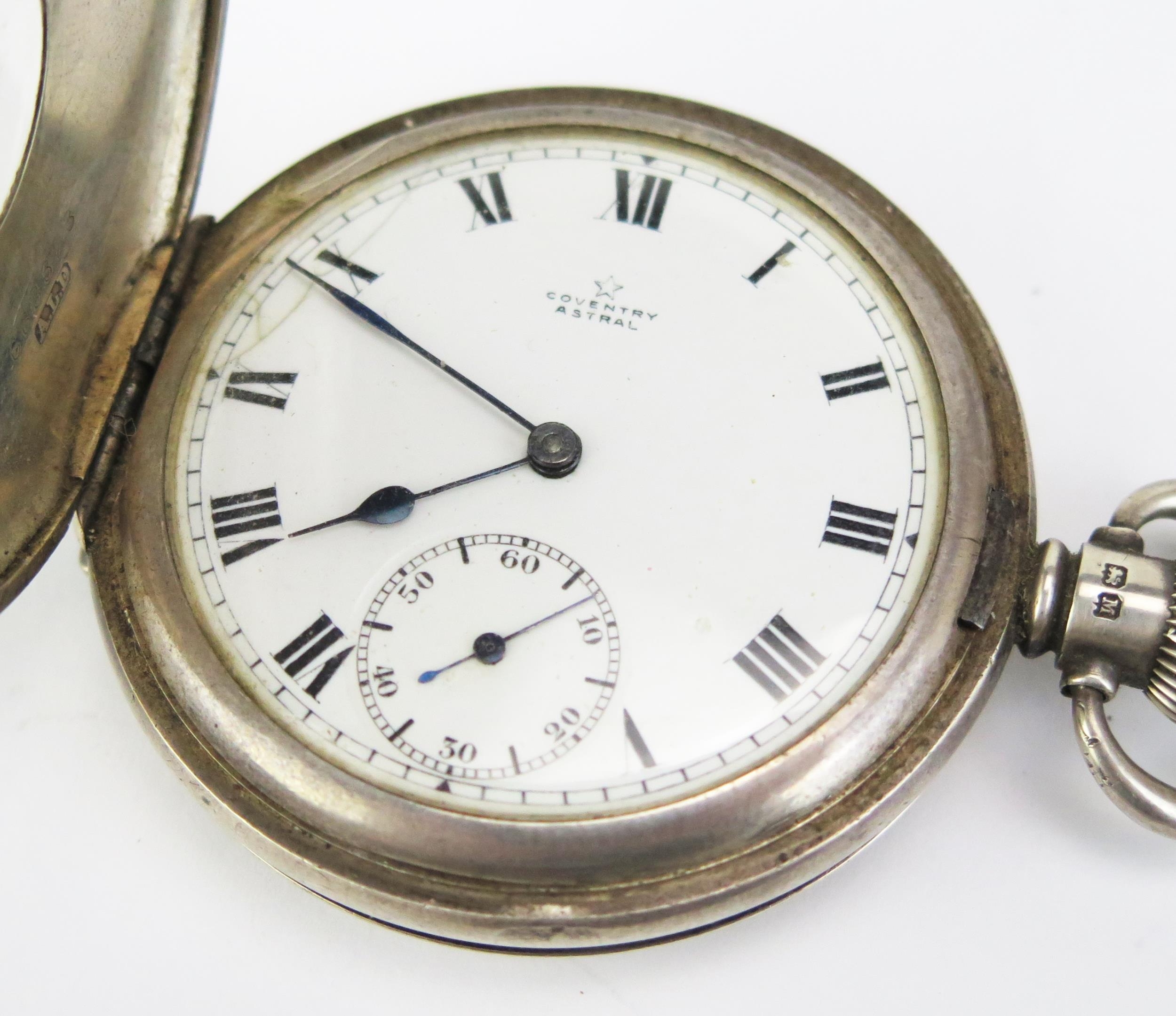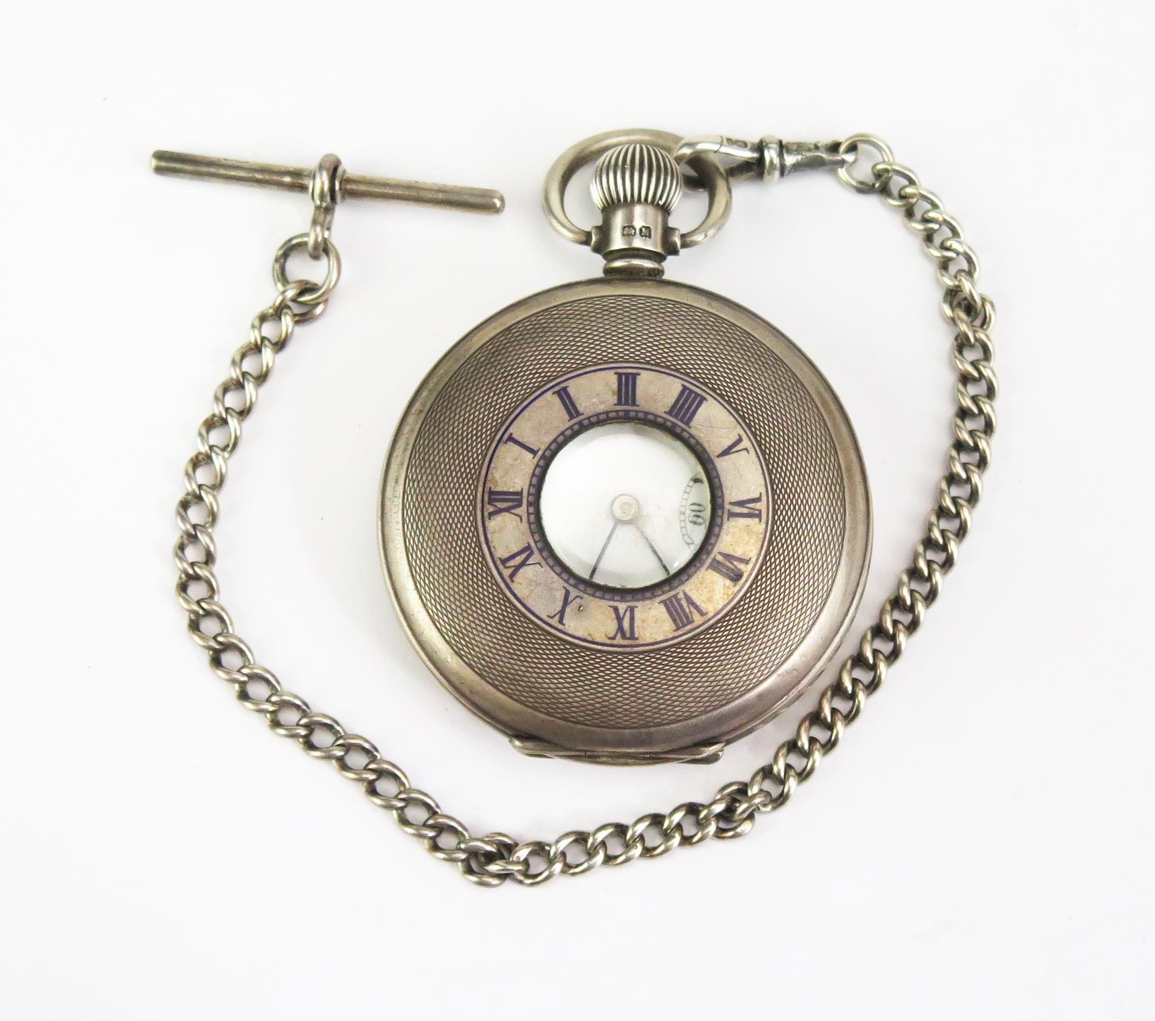 A Silver Half Hunter Pocket Watch with silver Albert and T-bar, Birmingham 1936 52mm case, Coventry Astral patent keyless movement. Running