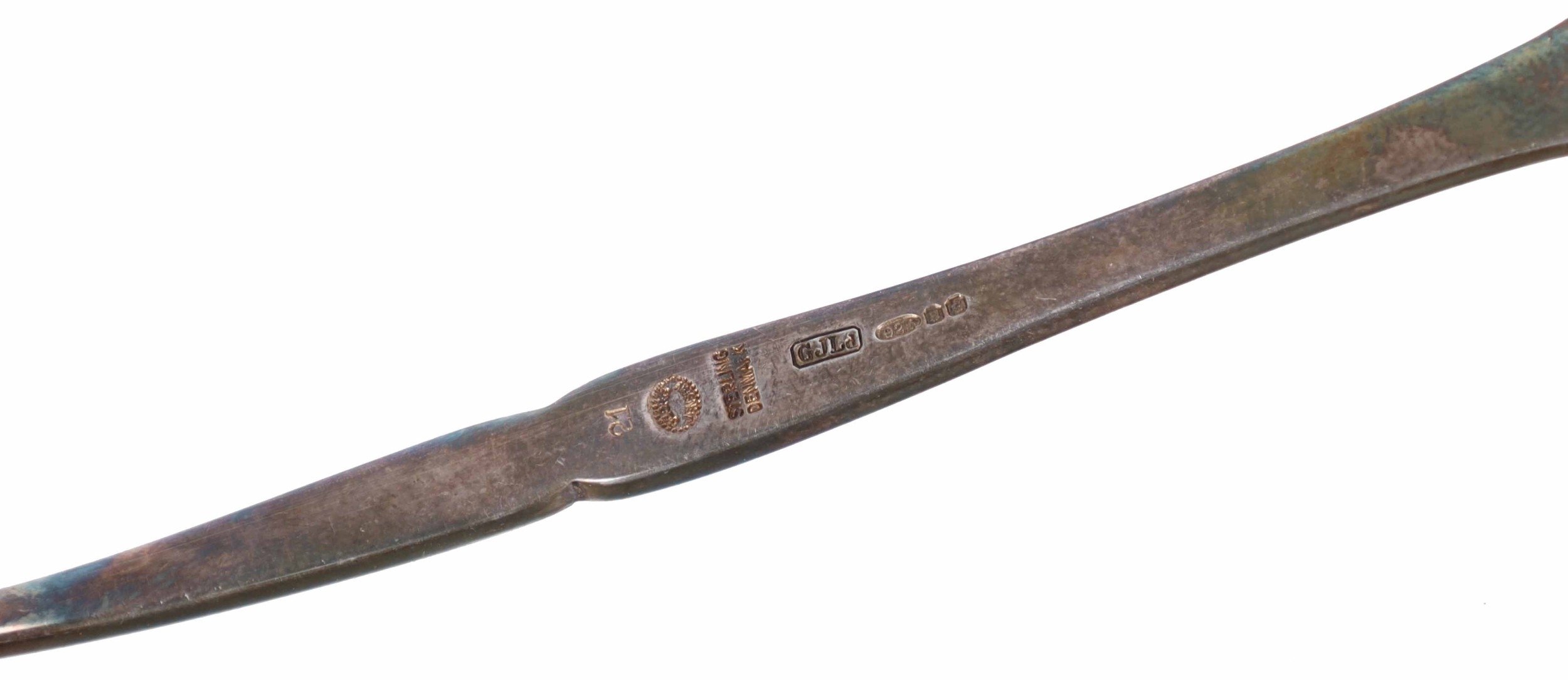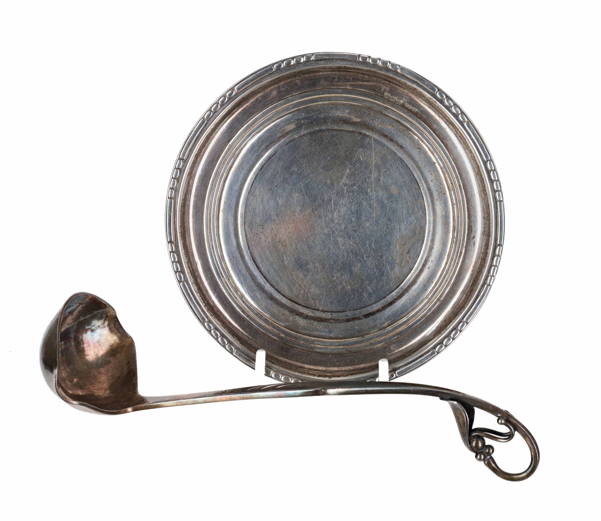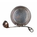 Danish silver small circular dish and miniature ladle, marked for Georg Jensen, Denmark, the dish 3.3" diameter, combined weight 51gm (2)