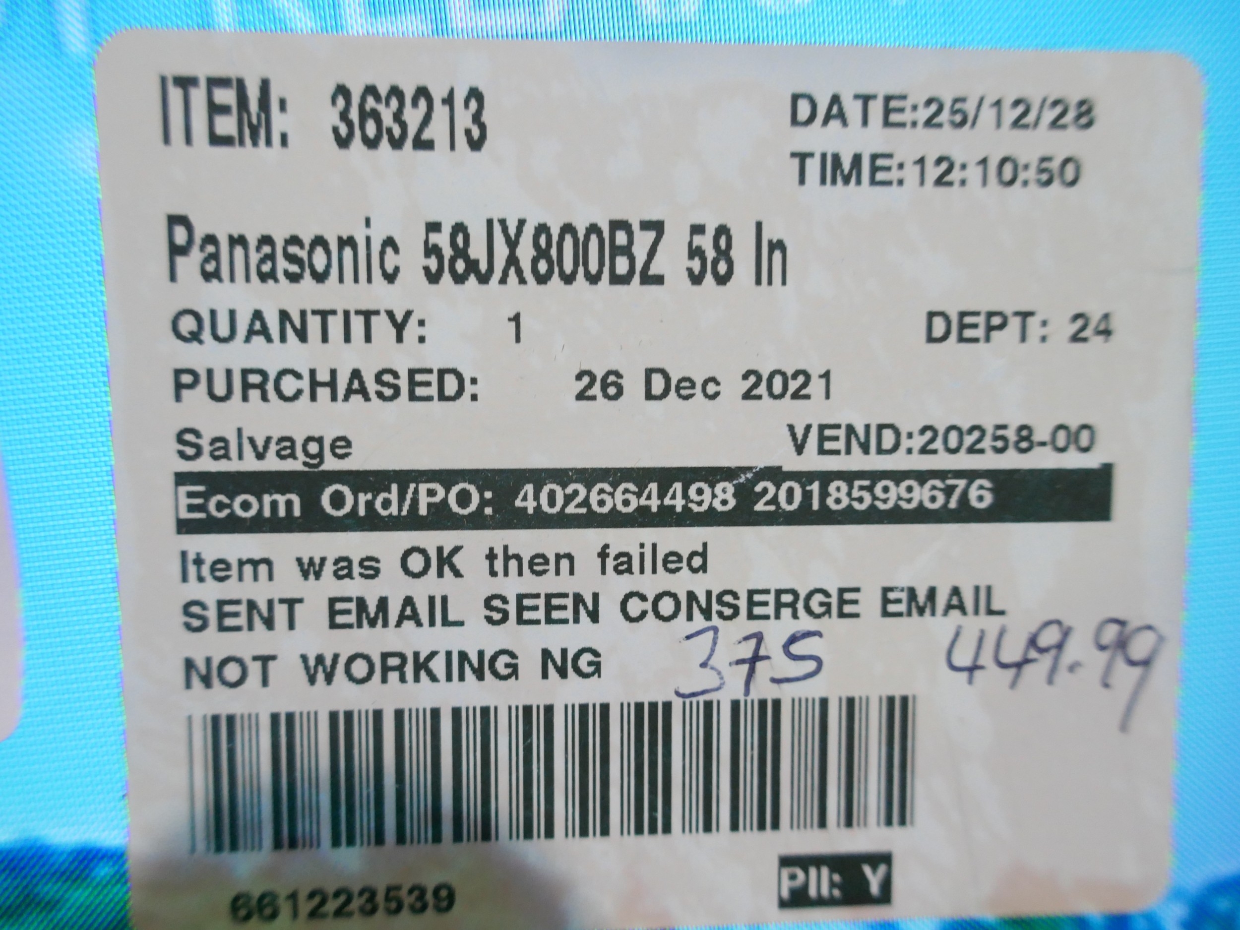 A Panasonic 58” 4K UHD television with remote- model no - TX-58JX800BZ, original RRP £345.83 + VAT (377-443) *This lot is subject to VAT