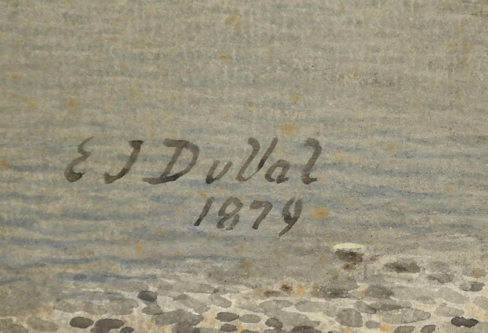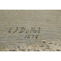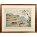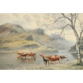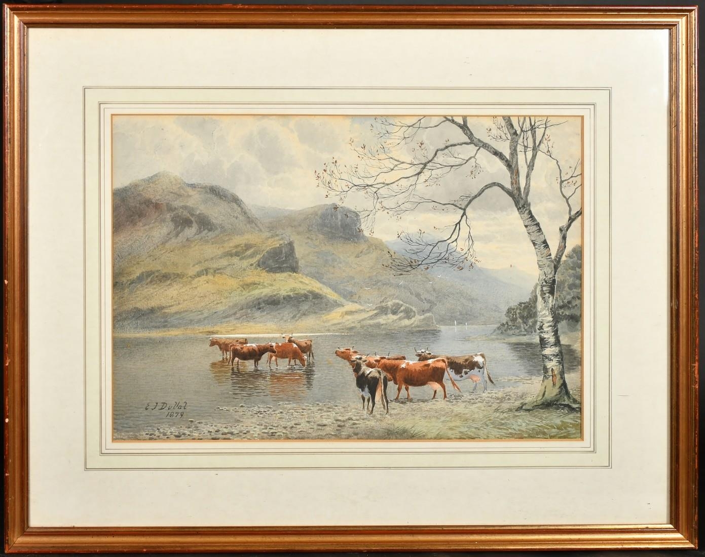 Edward .J. Duval (1838-1923) British, Cattle watering at the edge of a loch with mountains beyond, watercolour, signed and dated 1879, Fortescue Swann Galleries trade label verso, 14" x 20.5", (35.5x52cm).