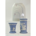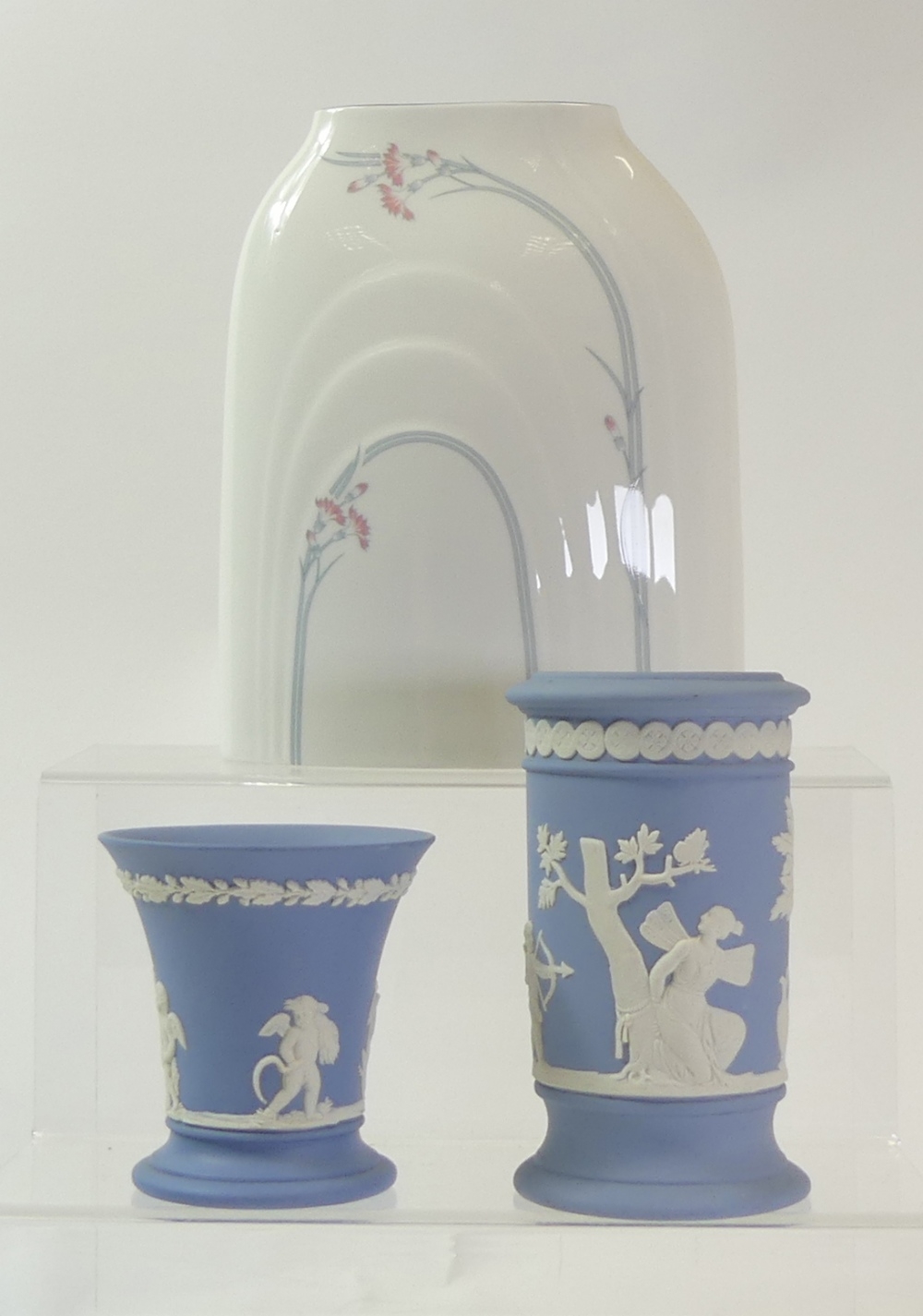 Wedgwood Jasperware powder blue small footed Trumpet Vase, Neoclassical Style Vase together with Royal Doulton china Vase Impressions 'Carnation' tapered Tallest:-20cm(3)