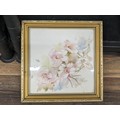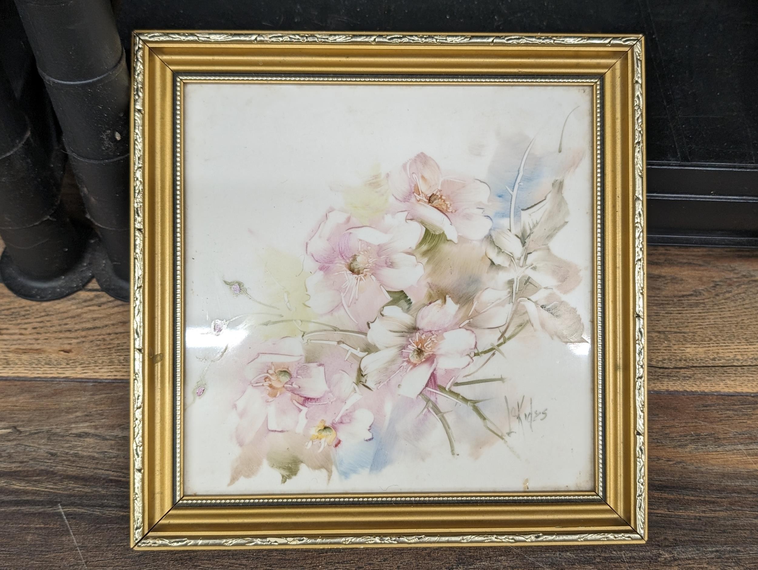 24 x 24 cm gilt framed hand painted and glazed porcelain tile with wild flowers signed La Kides?