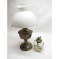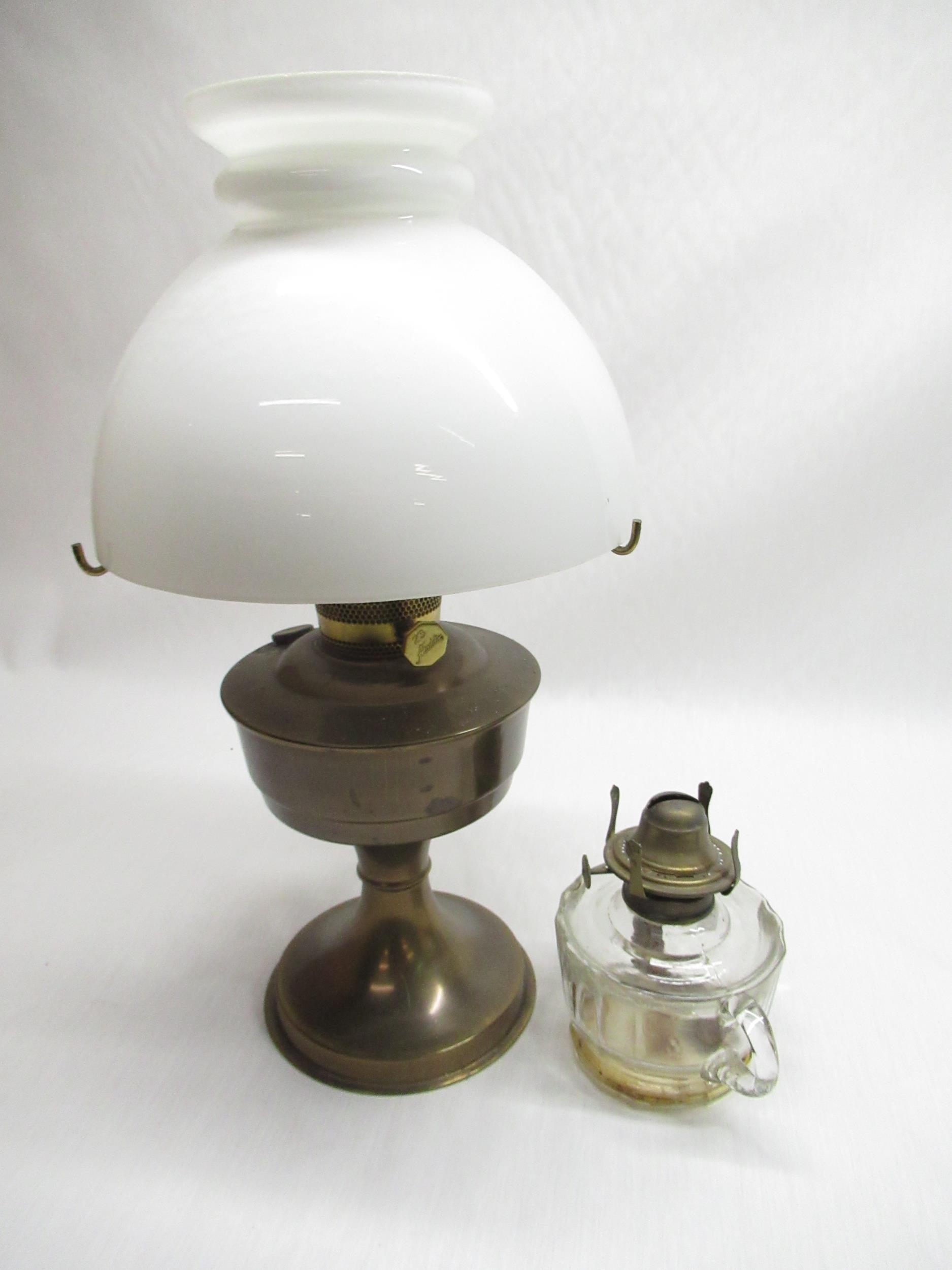 Aladdin brass bodied paraffin lamp with opaline glass shade, handheld paraffin lamp with clear glass body, handle and clear shade