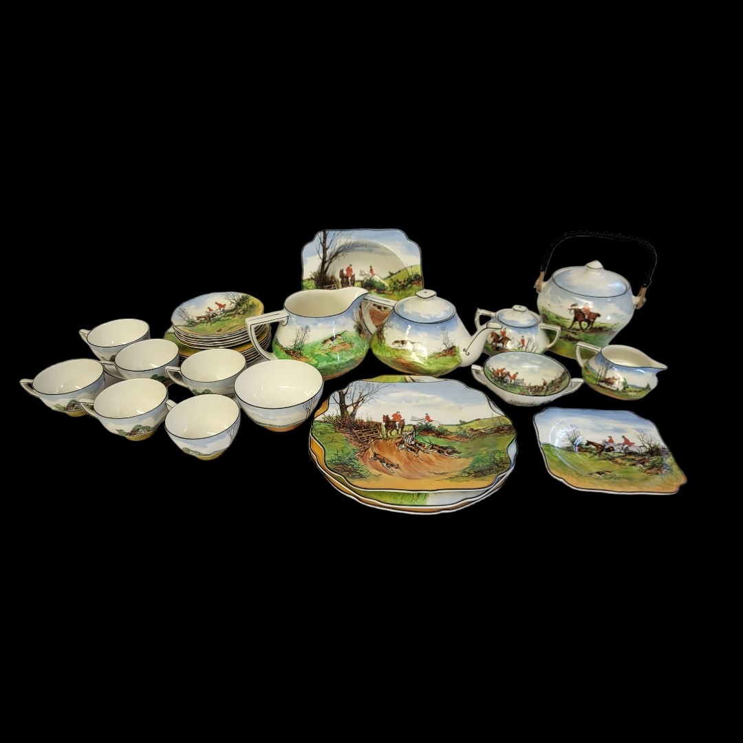 Decorated with traditional English country hunting scenes, made expressly for Ovington, New York, Circa 1925 - 1930, print and tint technique overpainted body, comprising a teapot, six cups and saucers, sugar bowl, milk and water jug, fruit bowl, biscuit barrel, three large cake plates etc.
