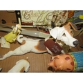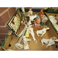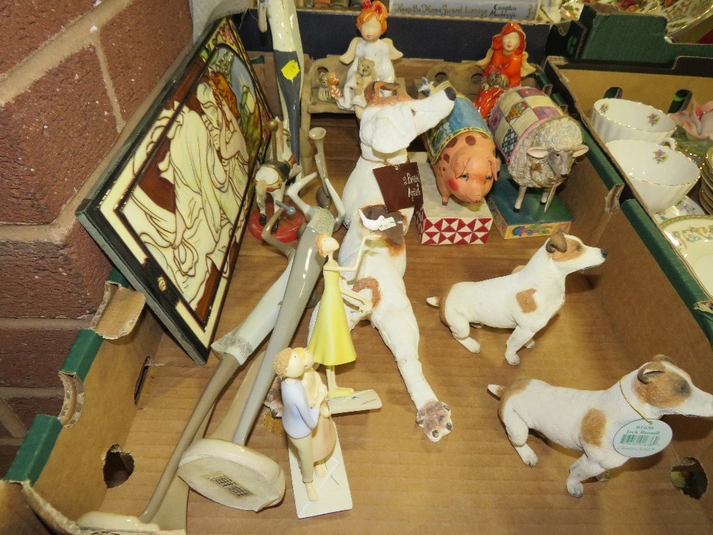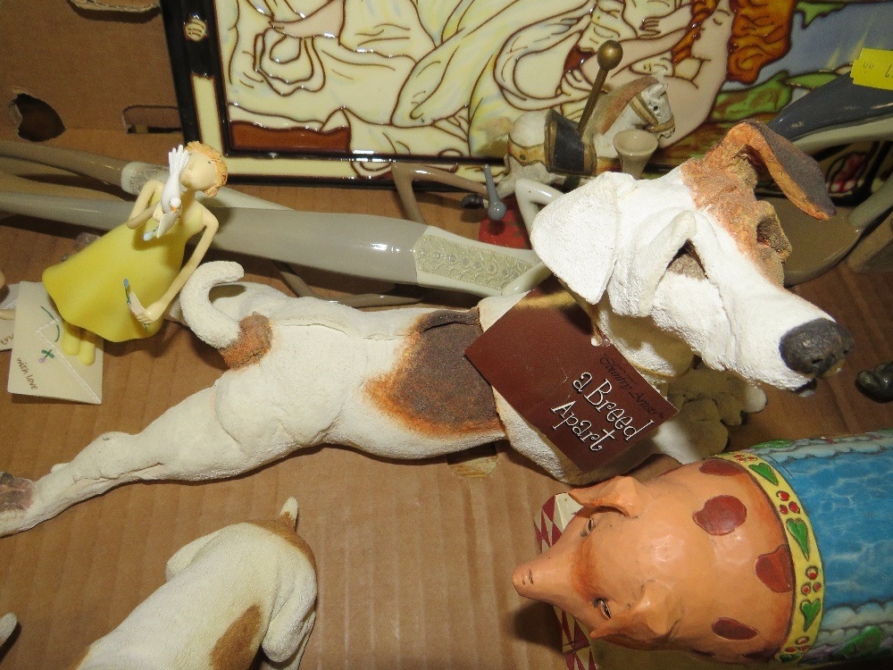 A tray of ceramics figures, plaques, to include Jim Shore farm animals etc