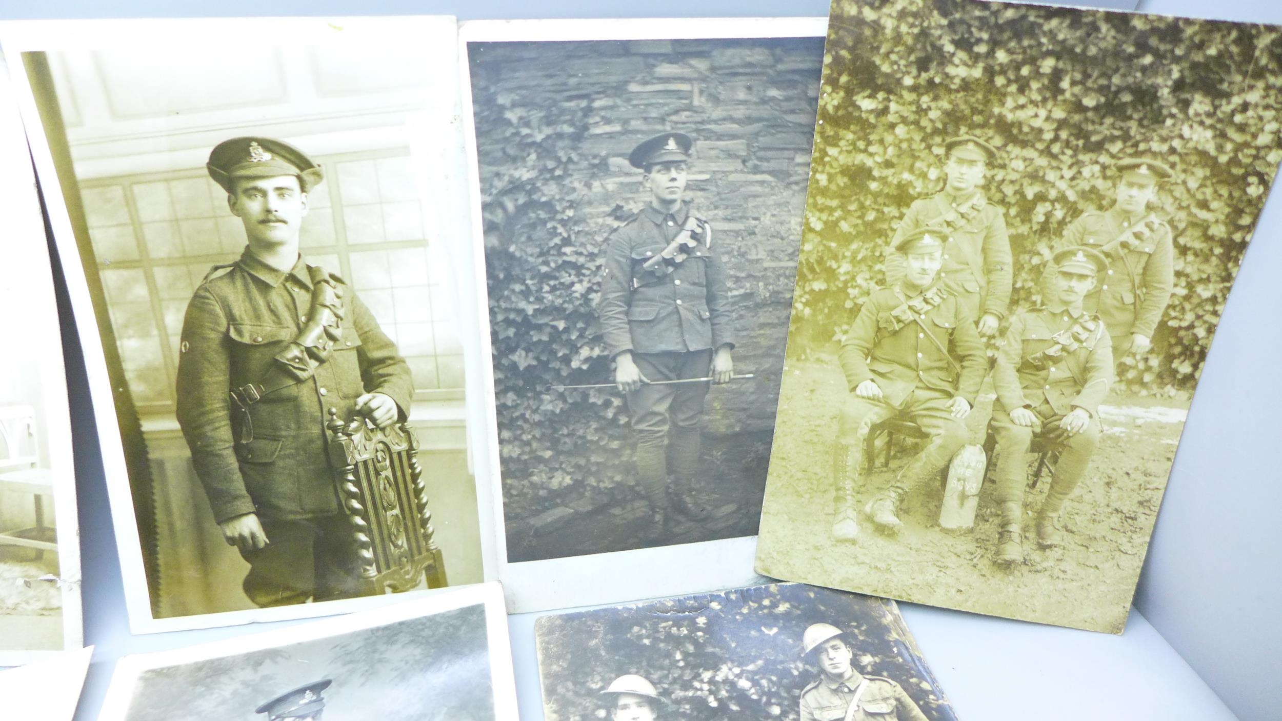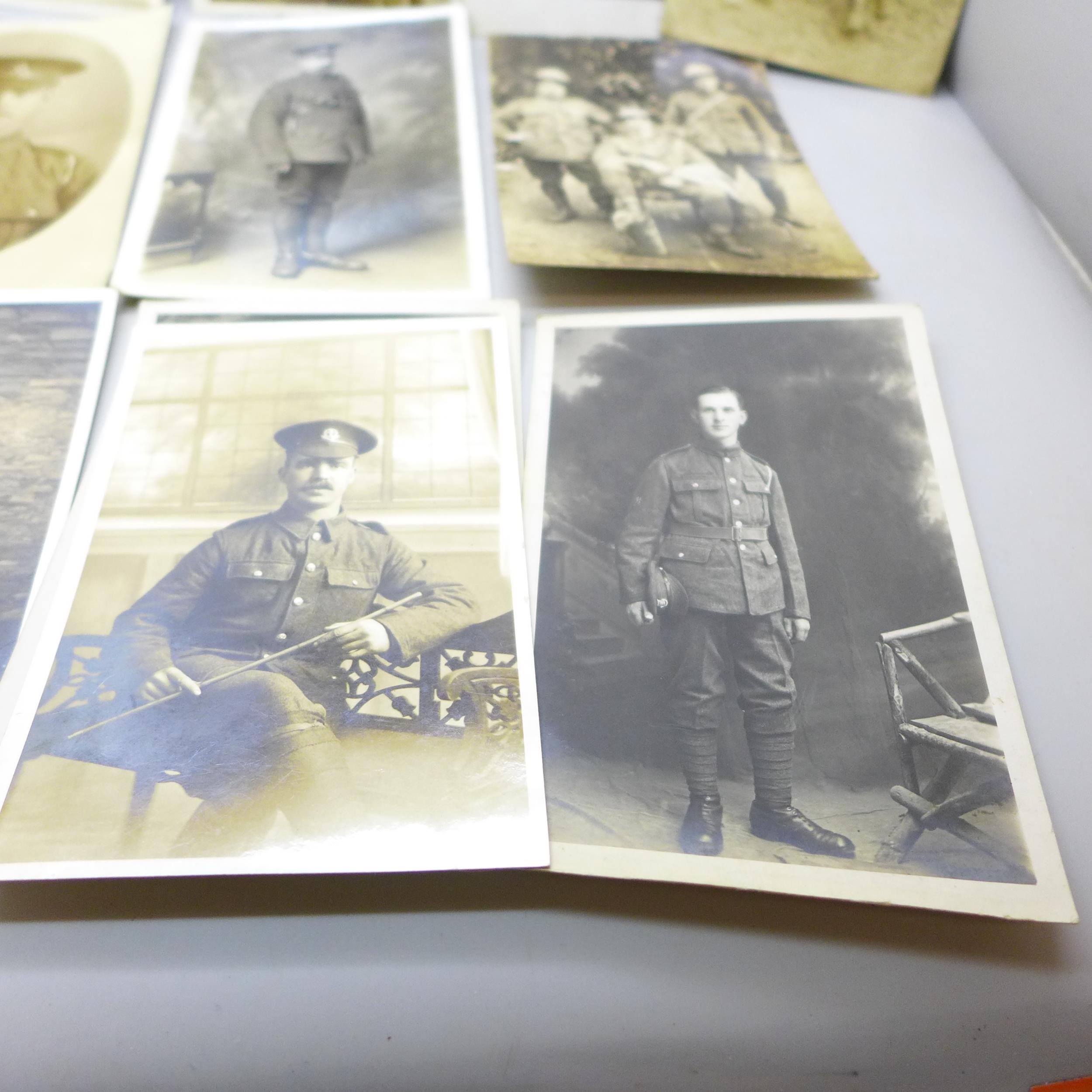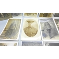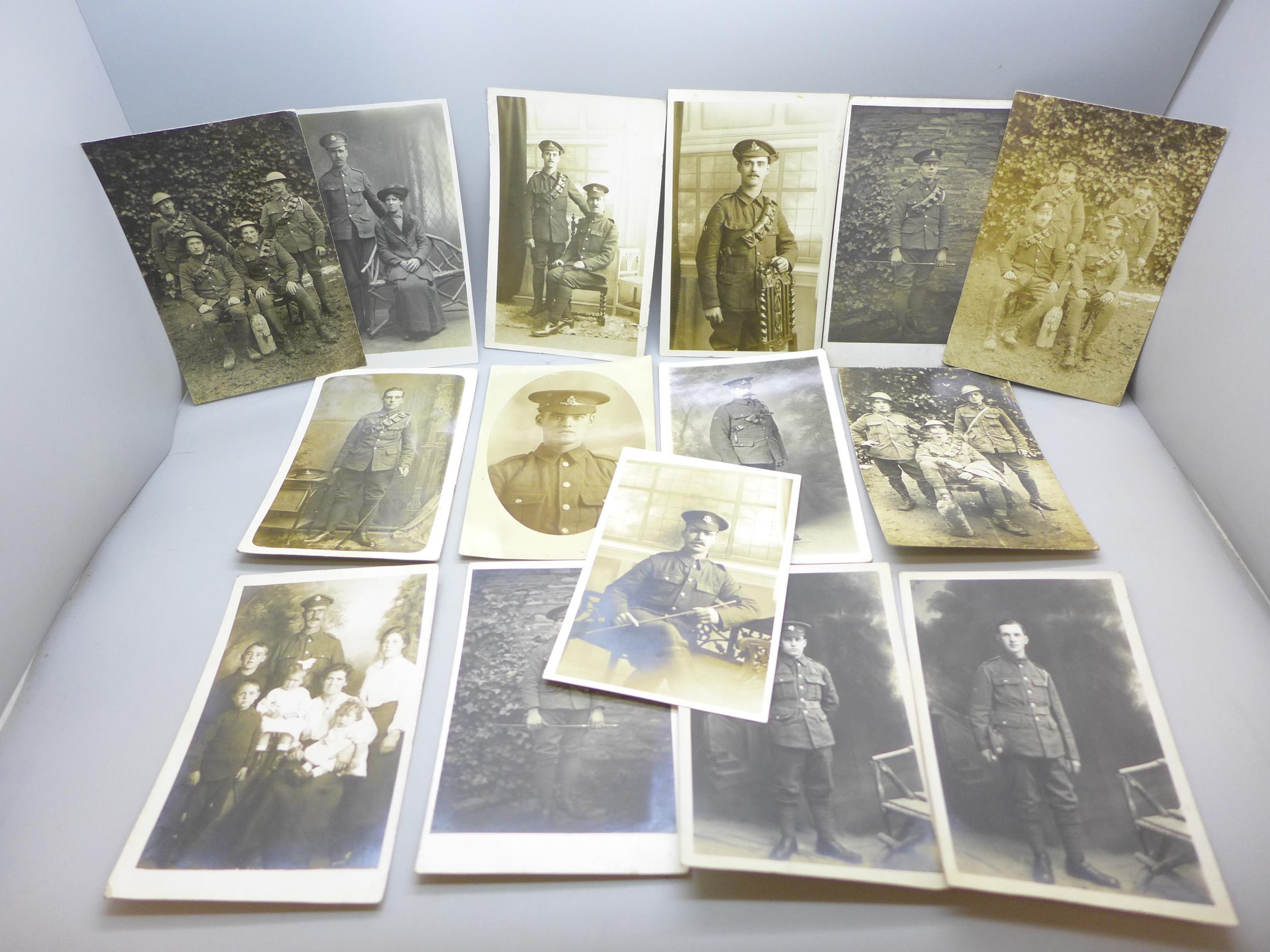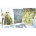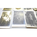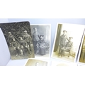 A collection of fifteen early 20th Century photographic postcards, all service men in military uniform, two with family members