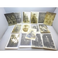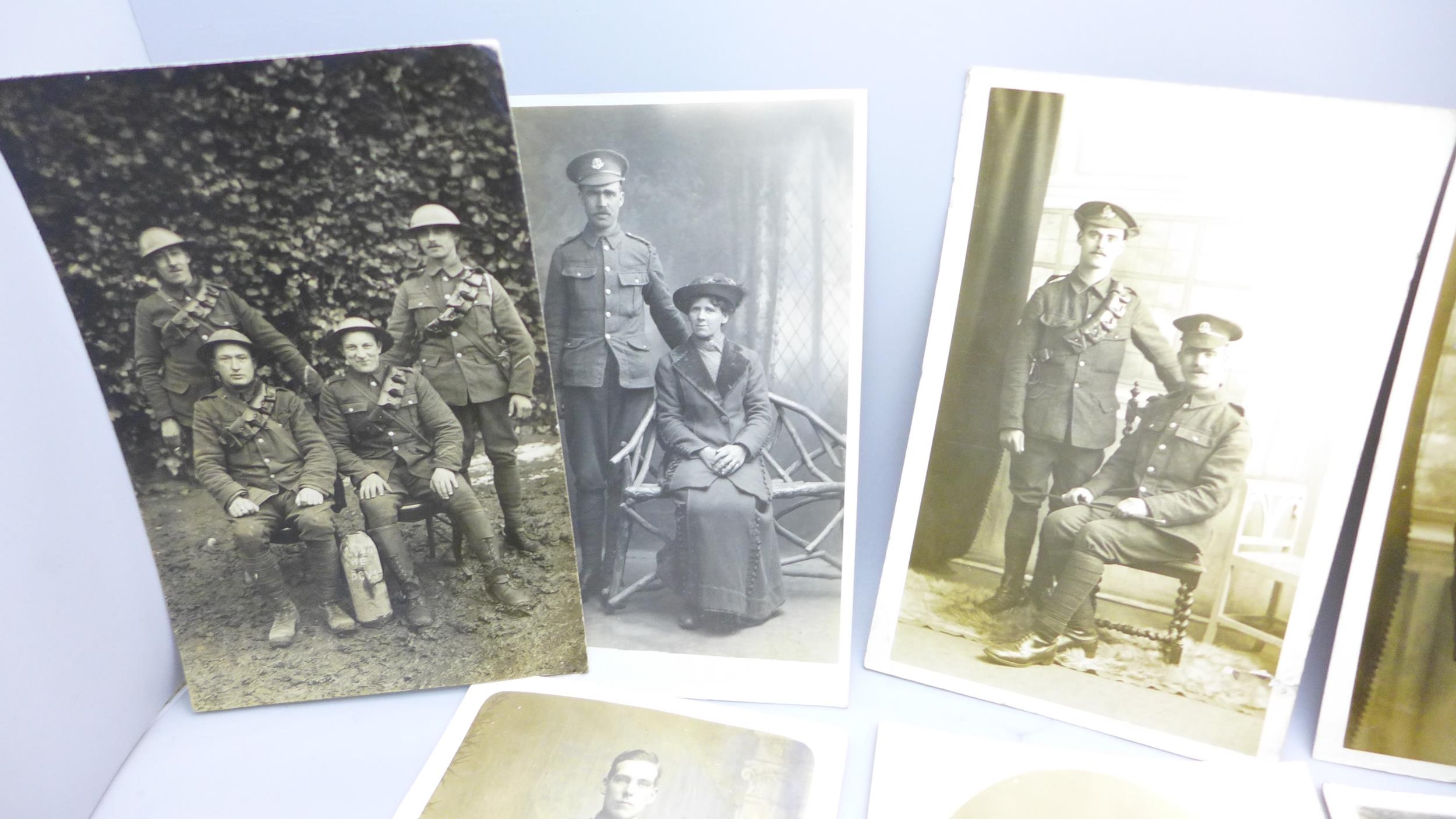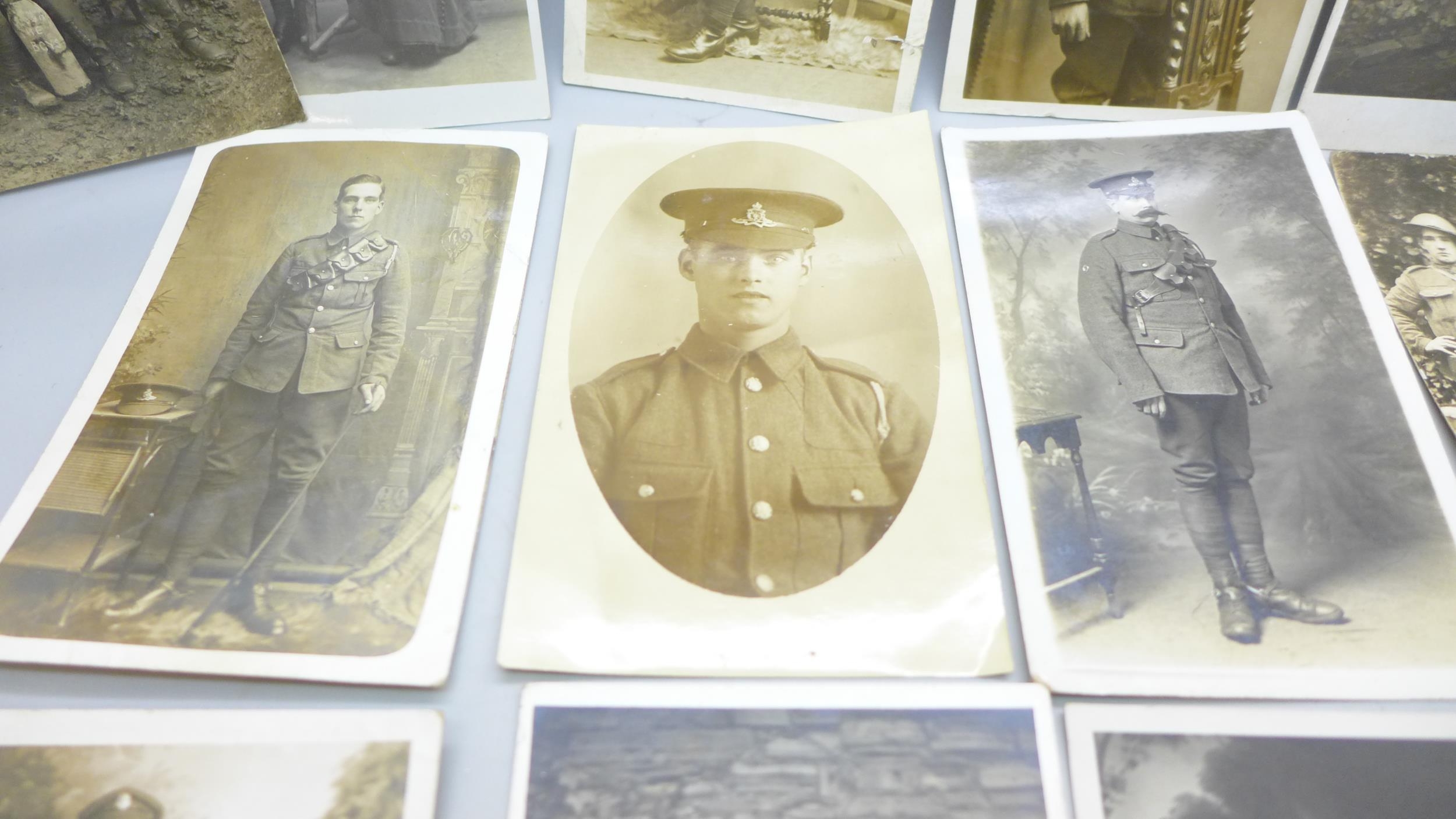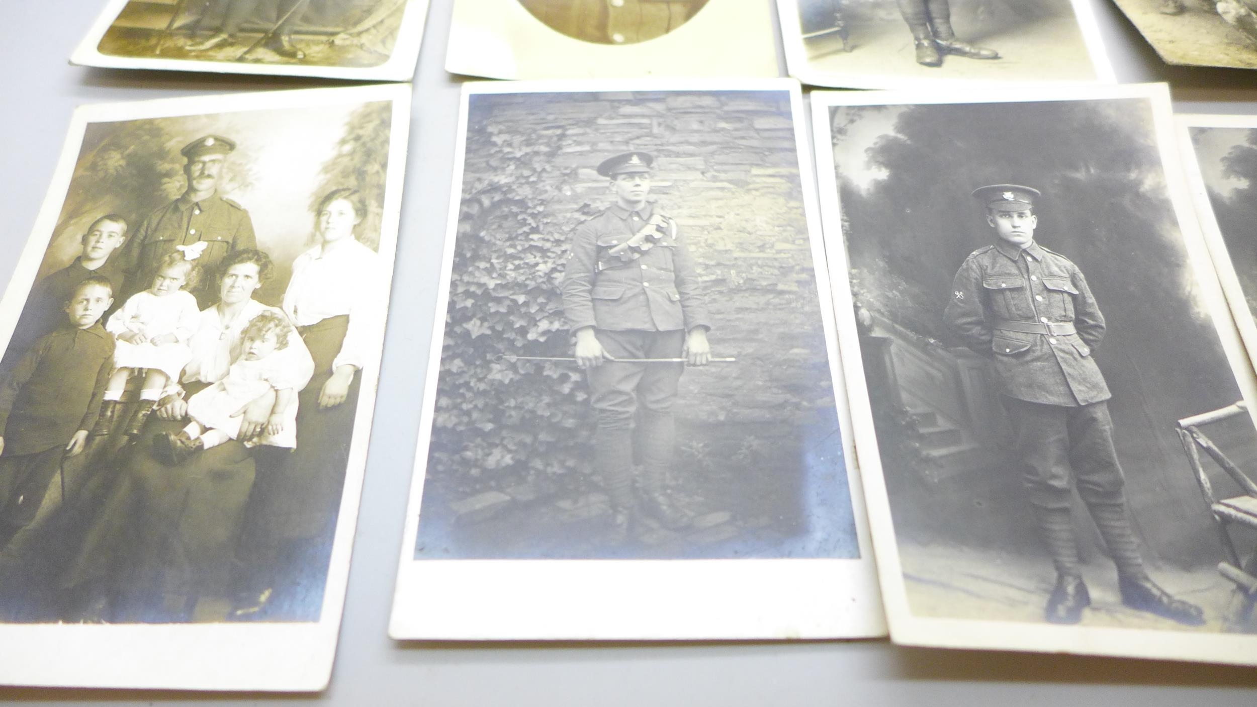 A collection of fifteen early 20th Century photographic postcards, all service men in military uniform, two with family members