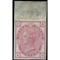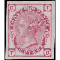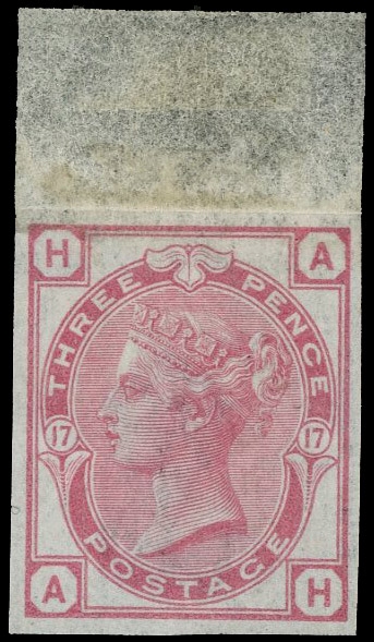 1875 3d Rose Pl.17. Very fine unused imperforate top marginal imprimatur lettered AH. Tiny patch of glue staining at upper left. Scarce one of only 22 possible examples in private hands. SG143. Cat. £2500.