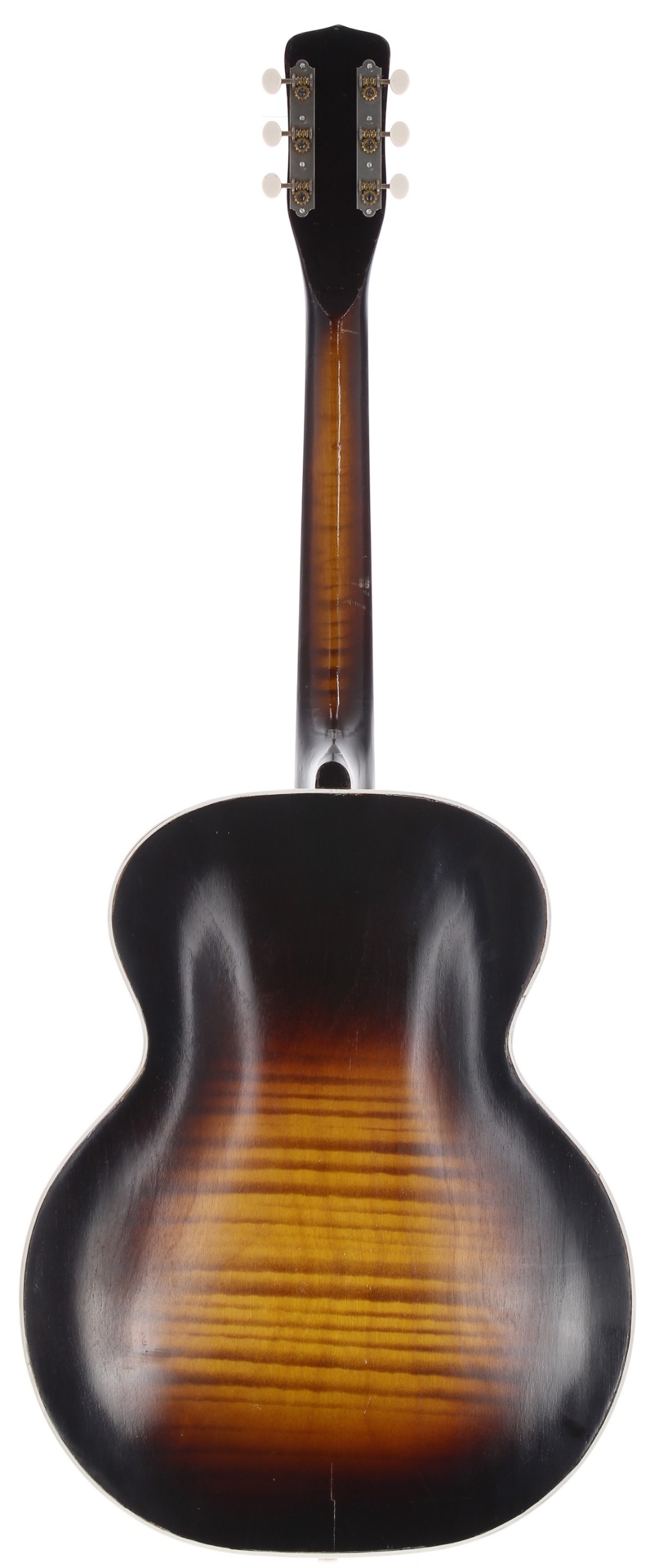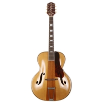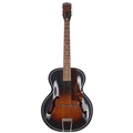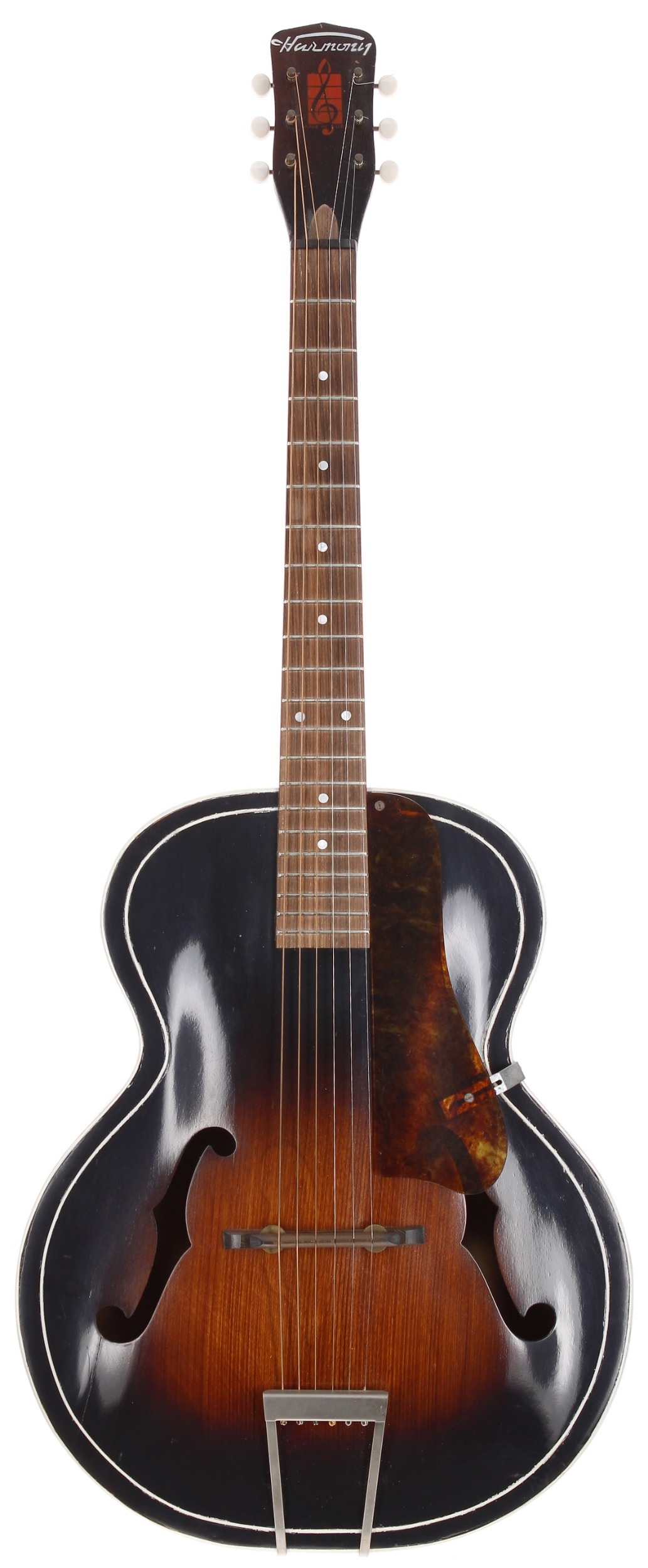 1950s Harmony H1215 archtop guitar, made in USA; Body: sunburst finish, restorations including hairline lacquer repairs, refinishing and edge binding added; Neck: sunburst finish maple, some refinishing; Fretboard: rosewood; Frets: good, refret; Hardware: later tuners; Overall condition: good/restored
