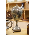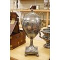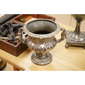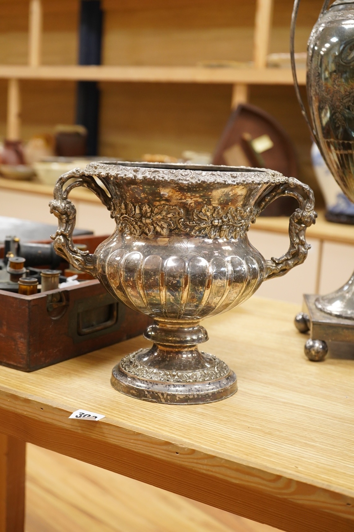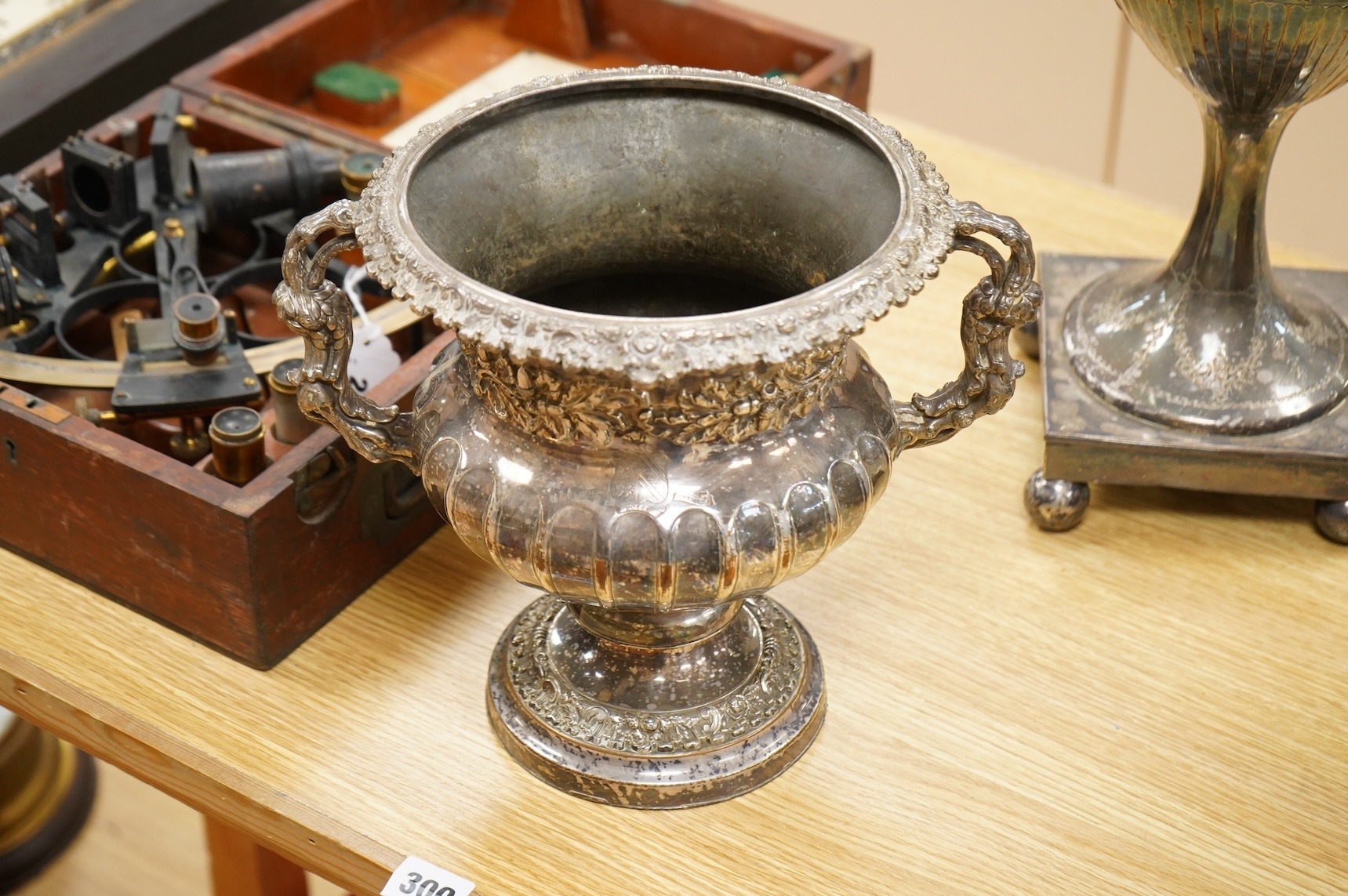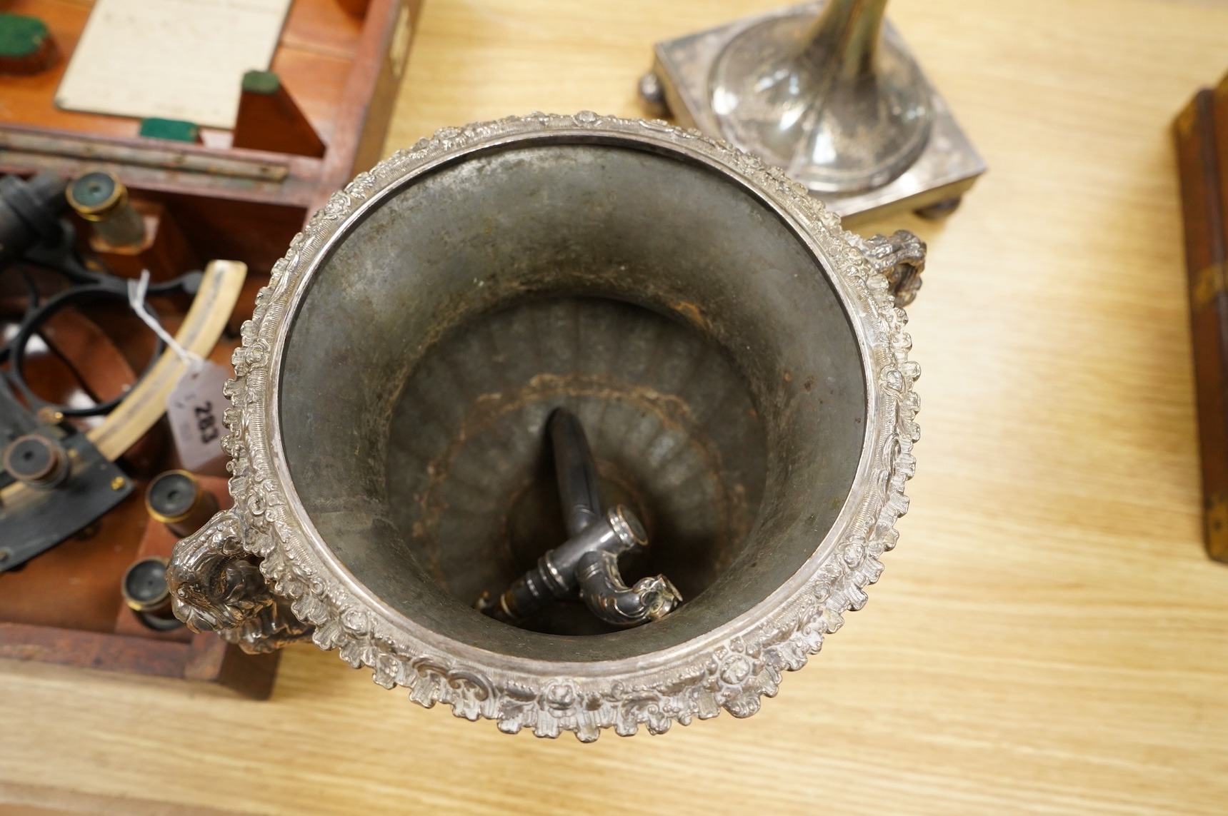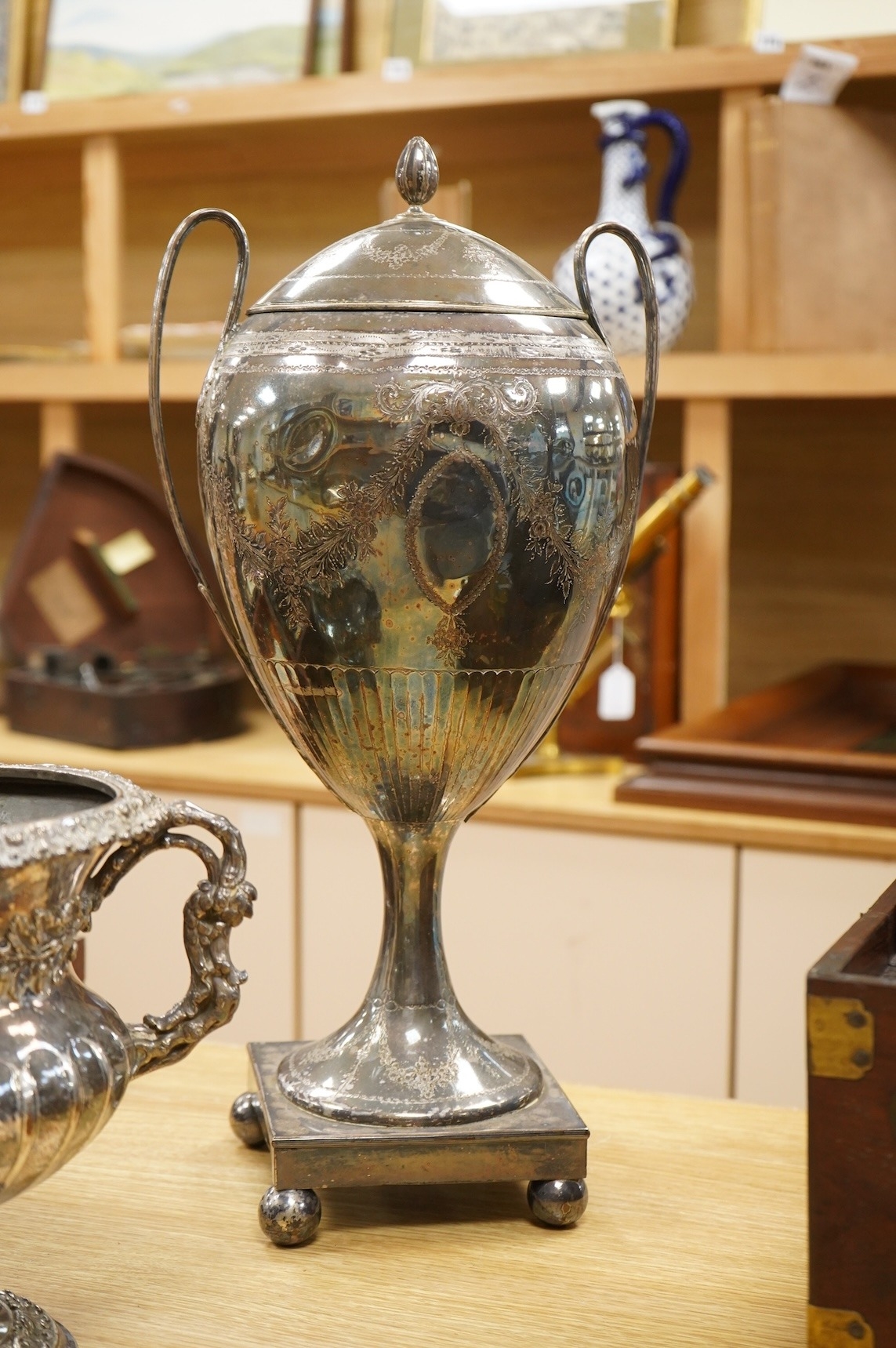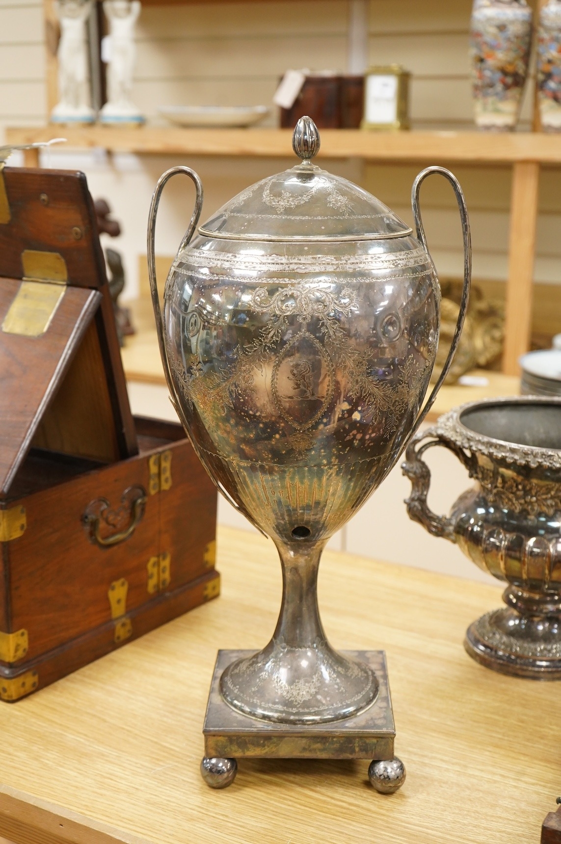 A Victorian silver plated campana wine cooler and a George III silver plated urn (spigot detached), largest 53cm high