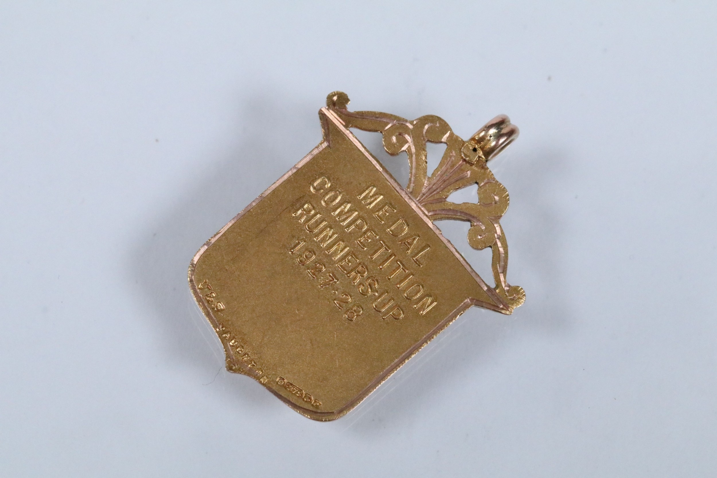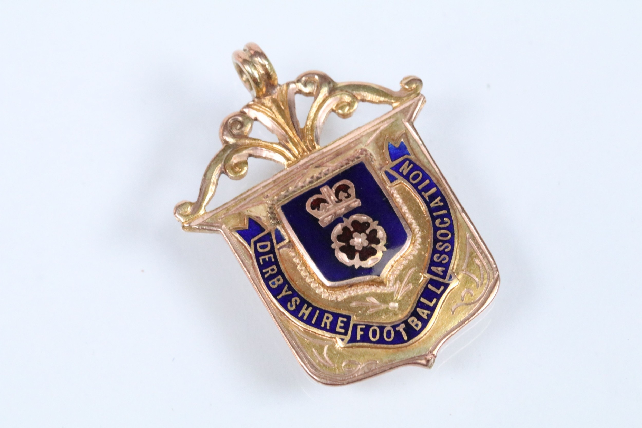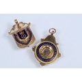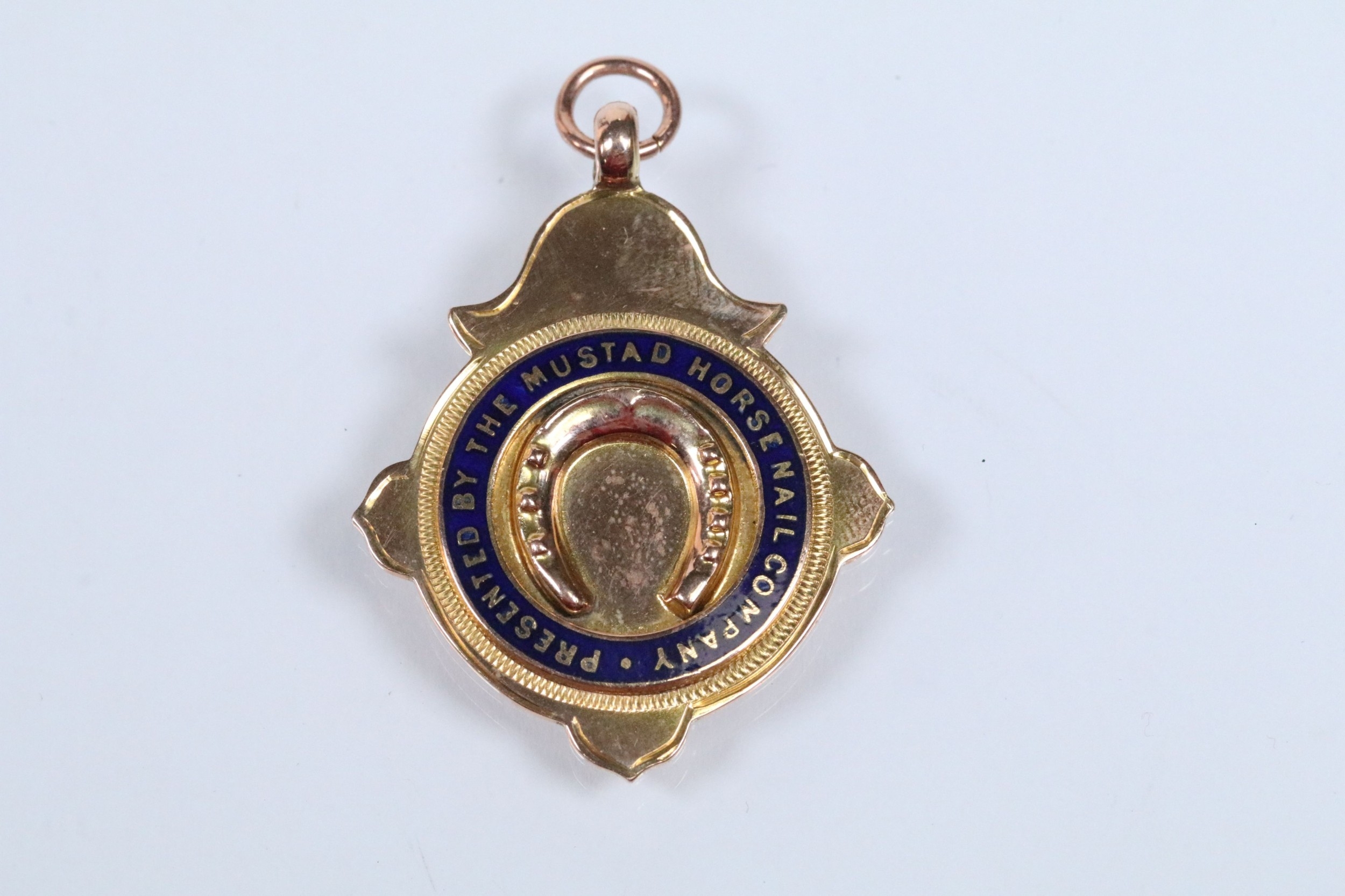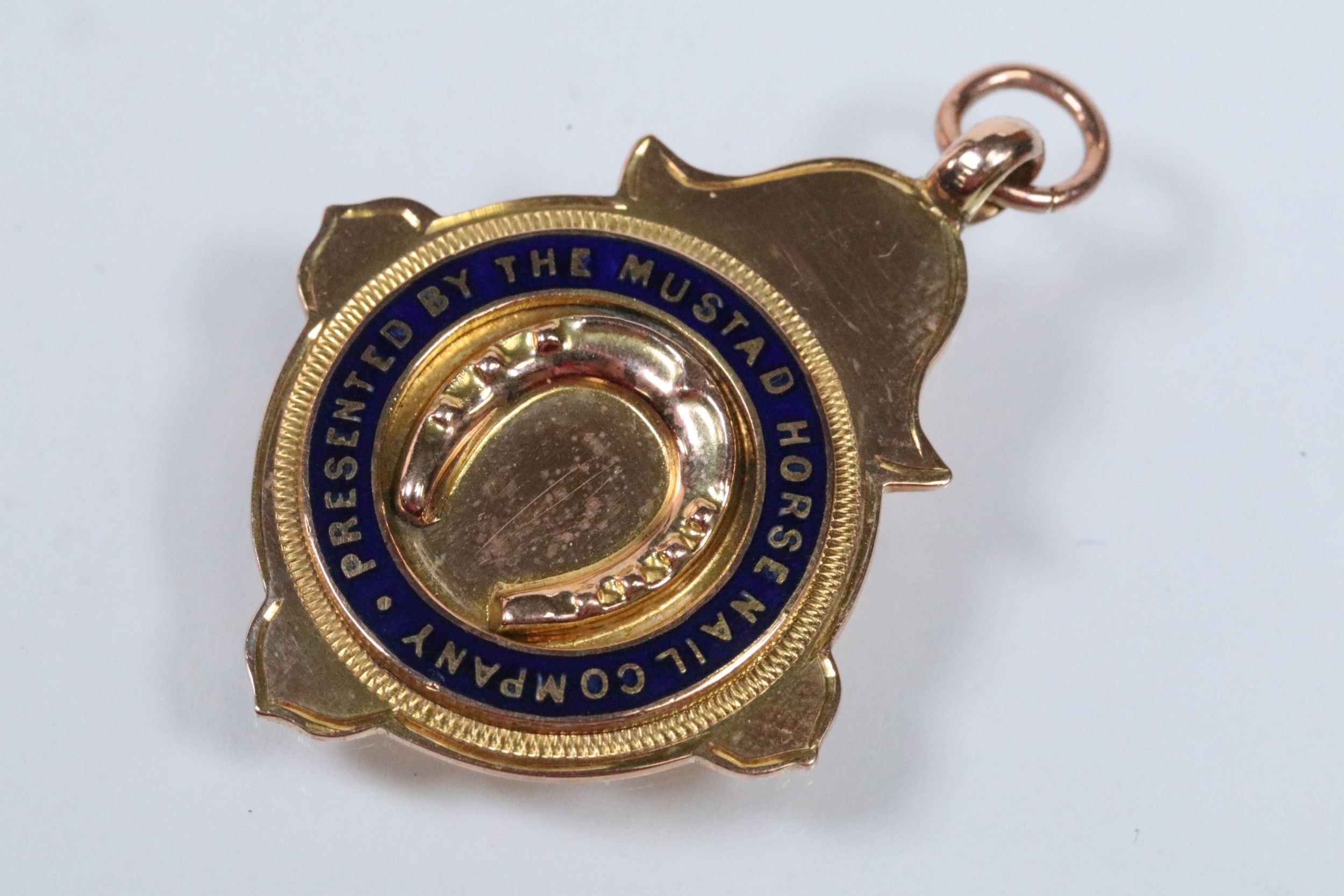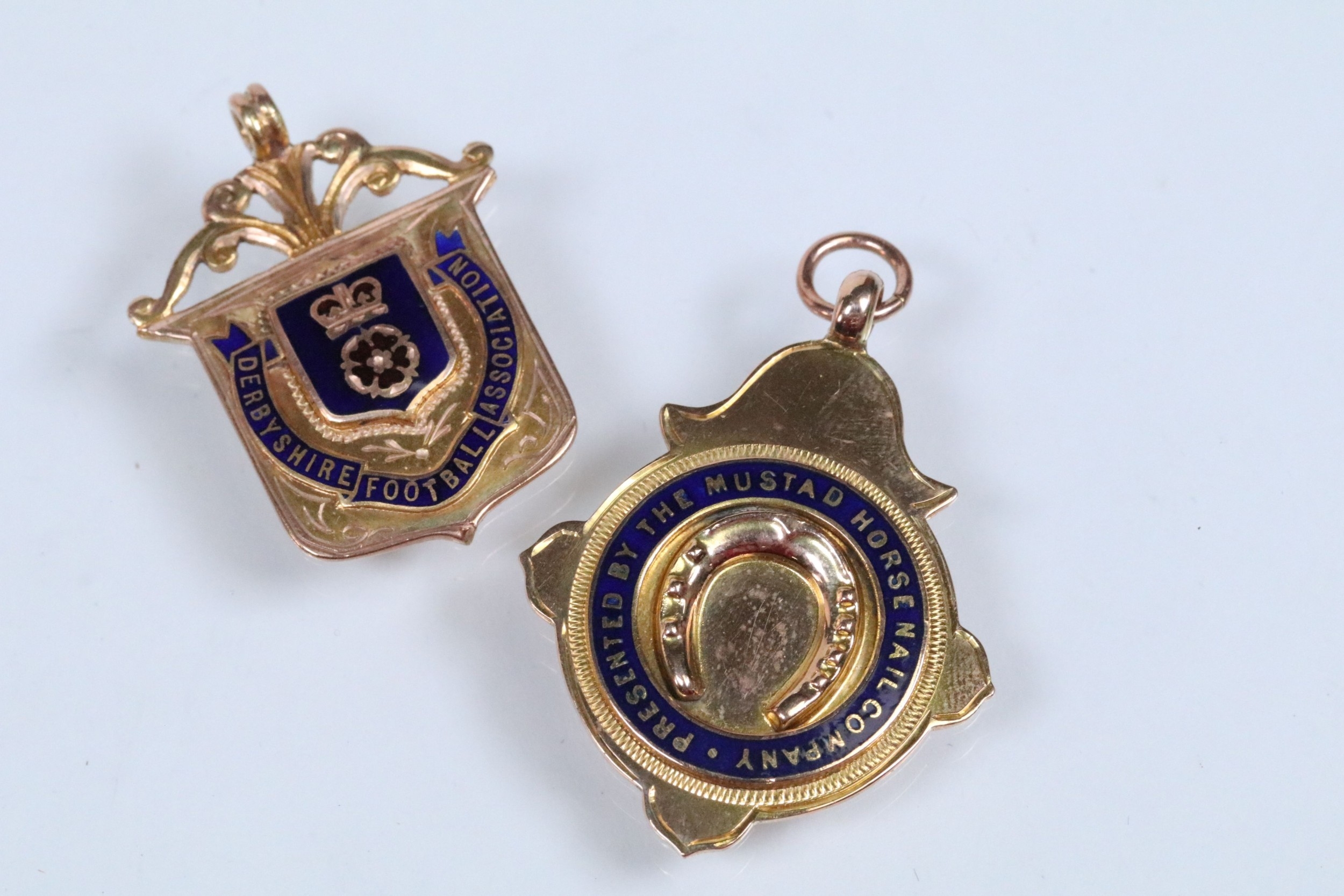 Two 9ct gold and enamel sporting medals to include a Derbyshire Football Association runners up medal dated 1927-28 (hallmarked Birmingham 1927), and a Mustad Horse nail Co. medal (hallmarked Birmingham 1932). Largest measures 4.2cm.