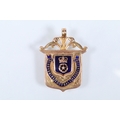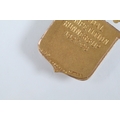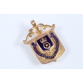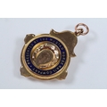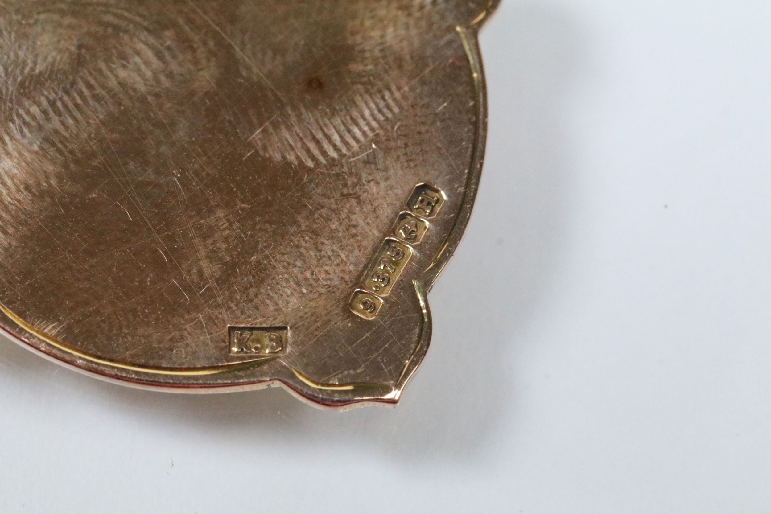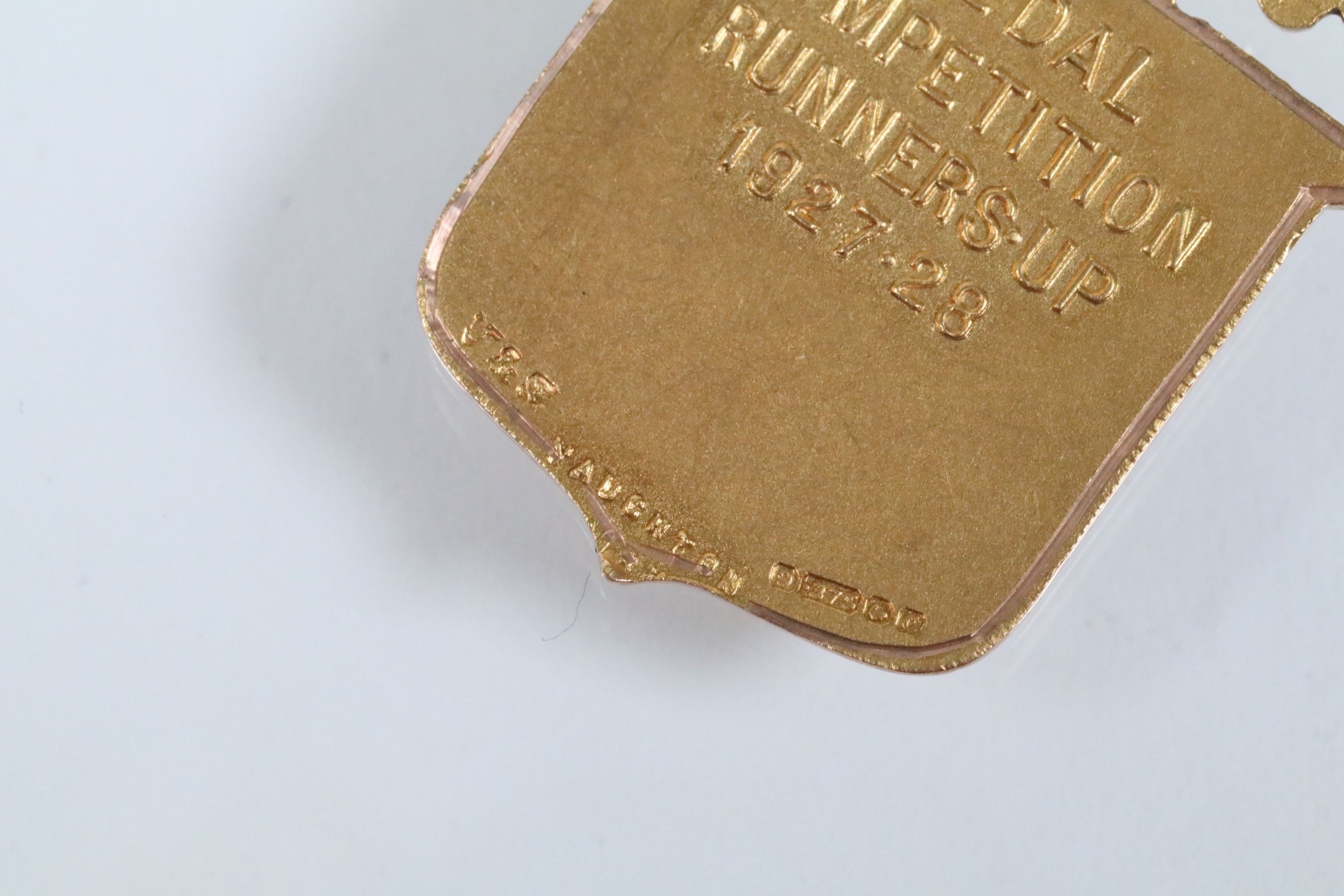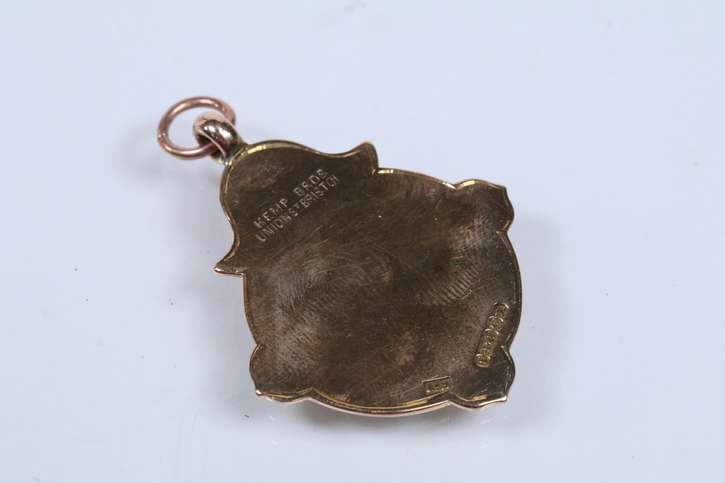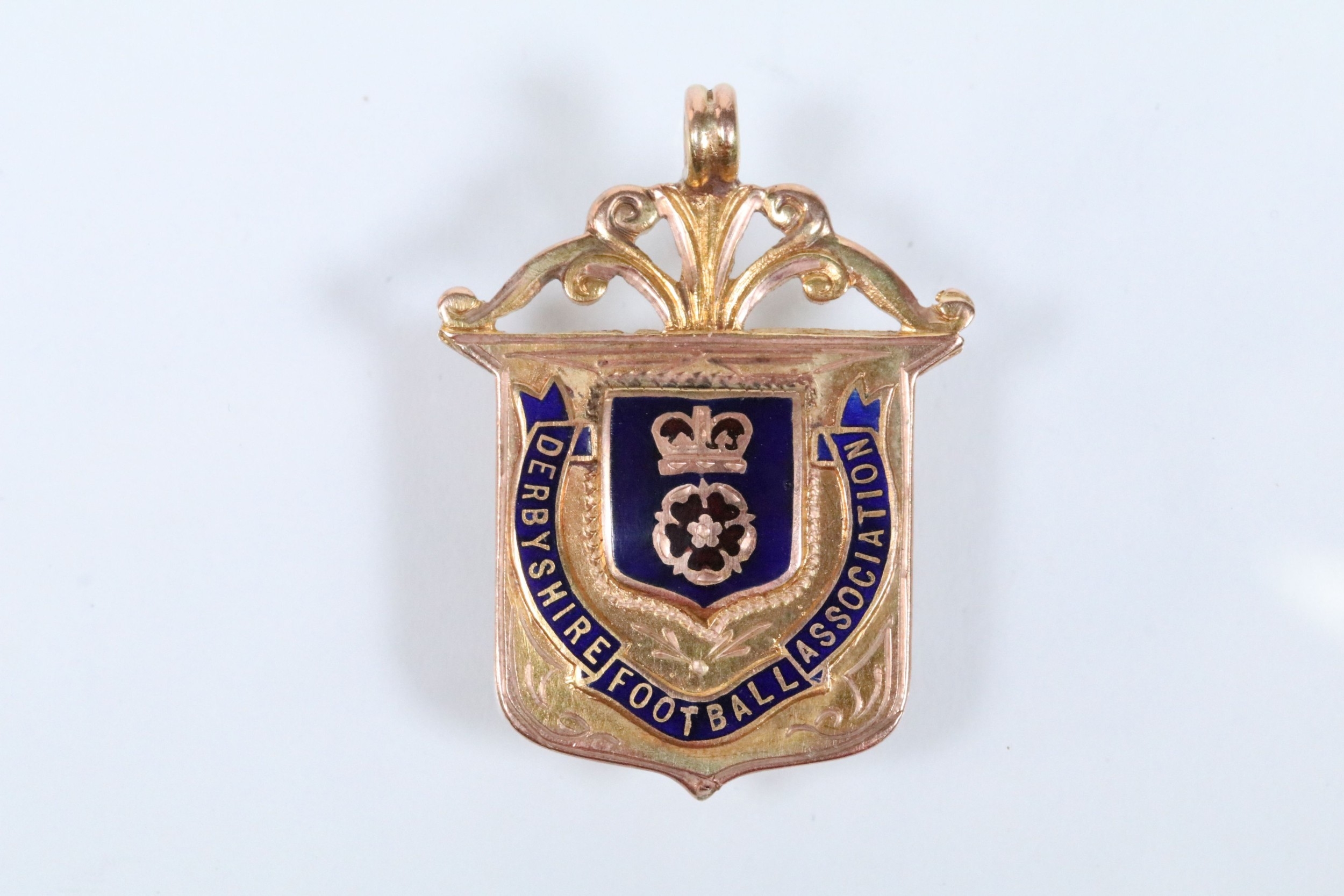 Two 9ct gold and enamel sporting medals to include a Derbyshire Football Association runners up medal dated 1927-28 (hallmarked Birmingham 1927), and a Mustad Horse nail Co. medal (hallmarked Birmingham 1932). Largest measures 4.2cm.
