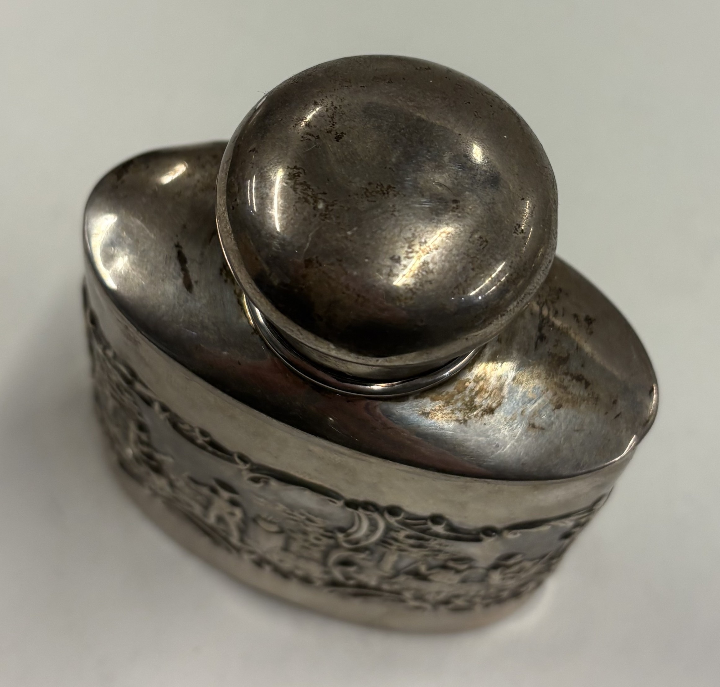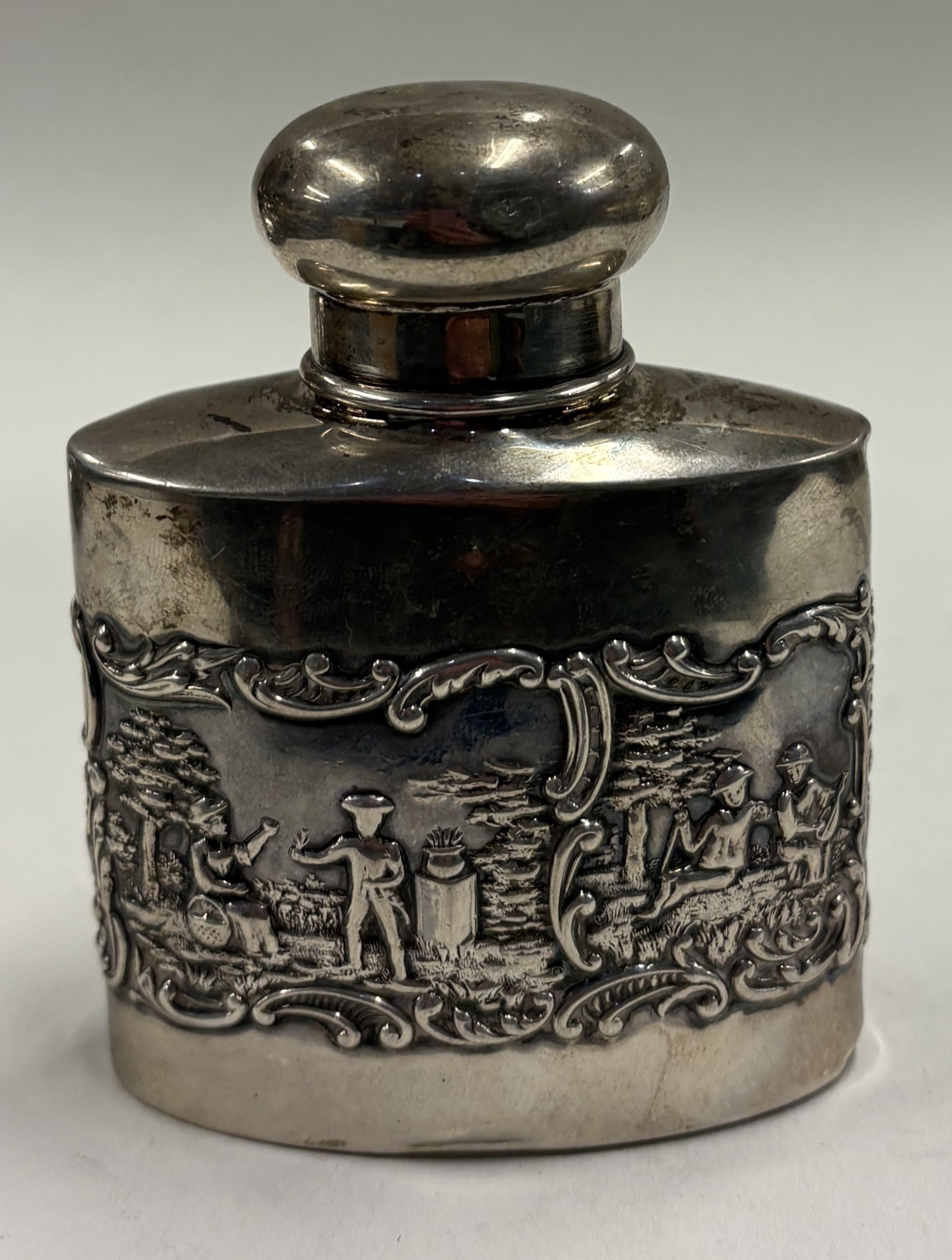 A chased silver tea caddy with embossed decoration. Birmingham 1906. Approx. 75 grams. Est. £150 - £200.