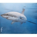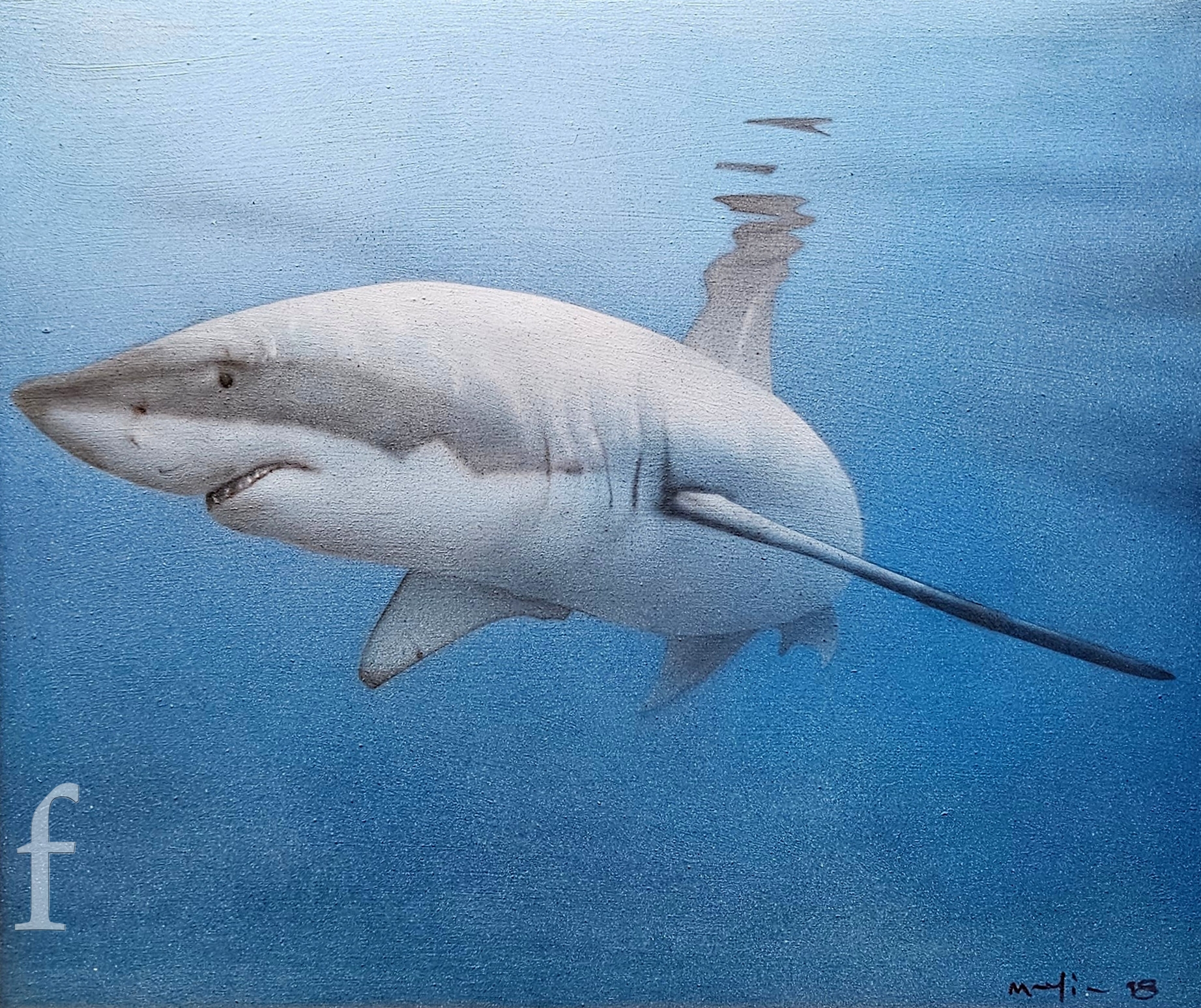 Modern British School - A study of a great white shark, airbrush on canvas, signed indistinctly and dated '18, framed, 54cm x 64cm, frame size 70cm x 79cm.