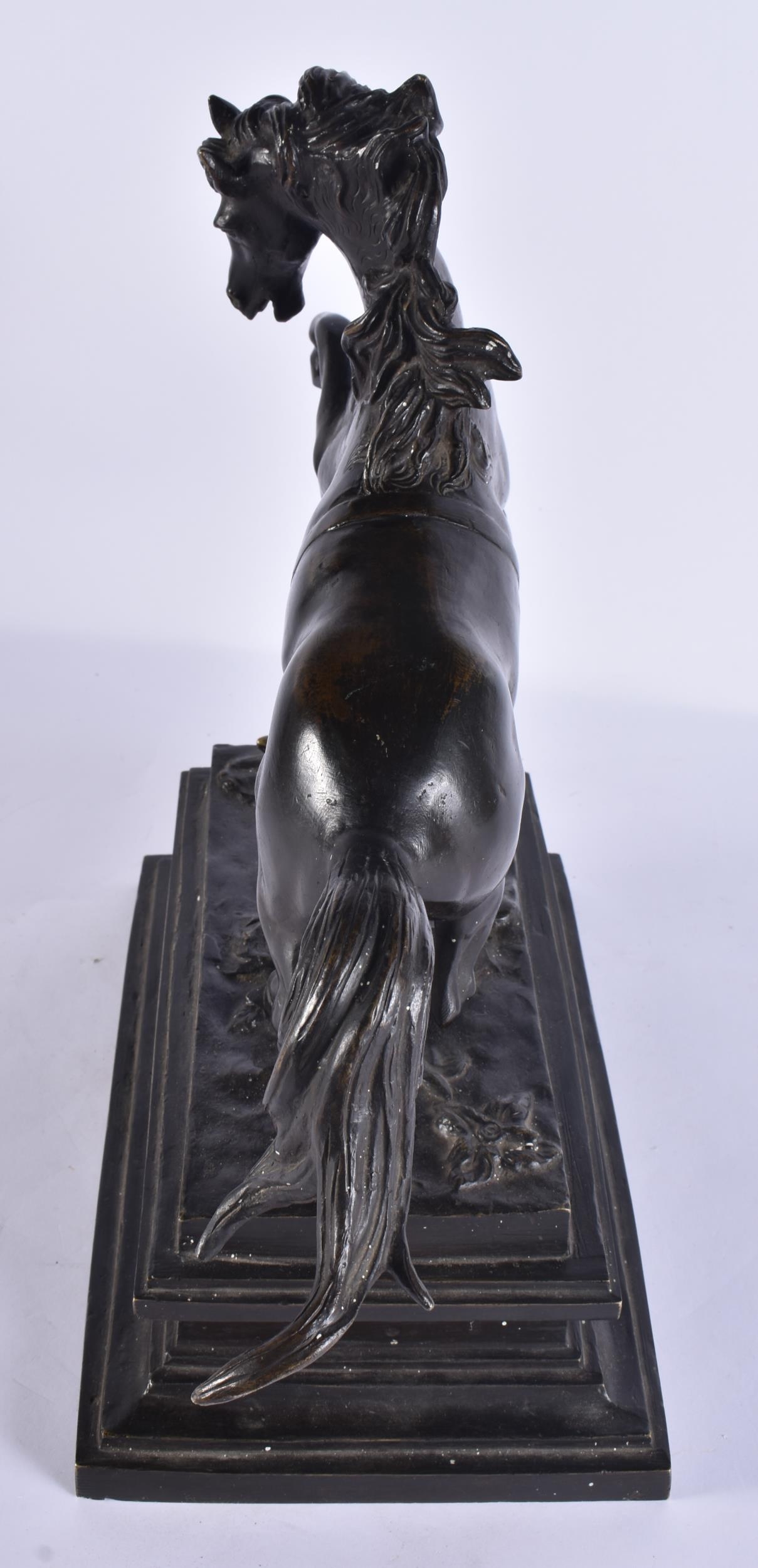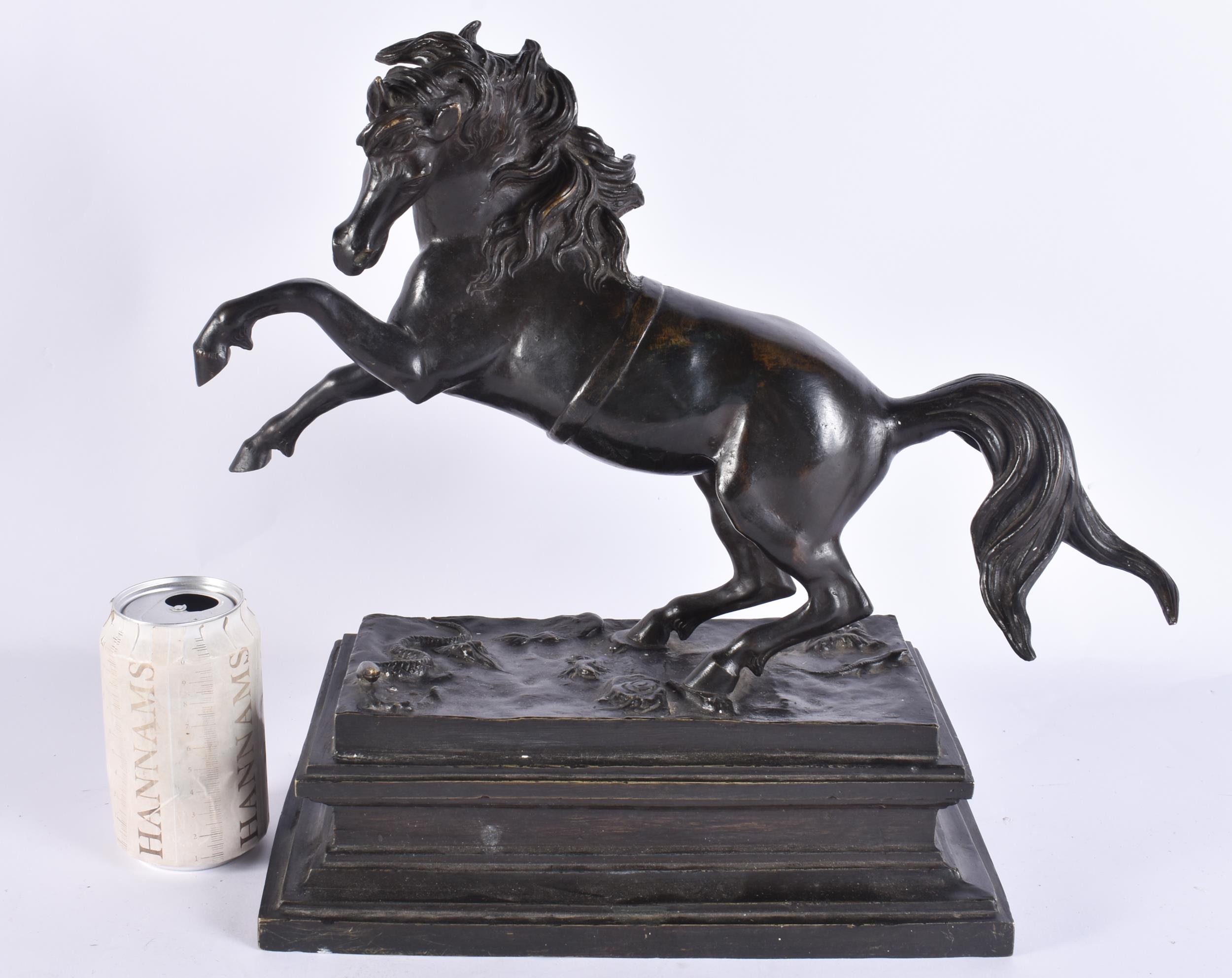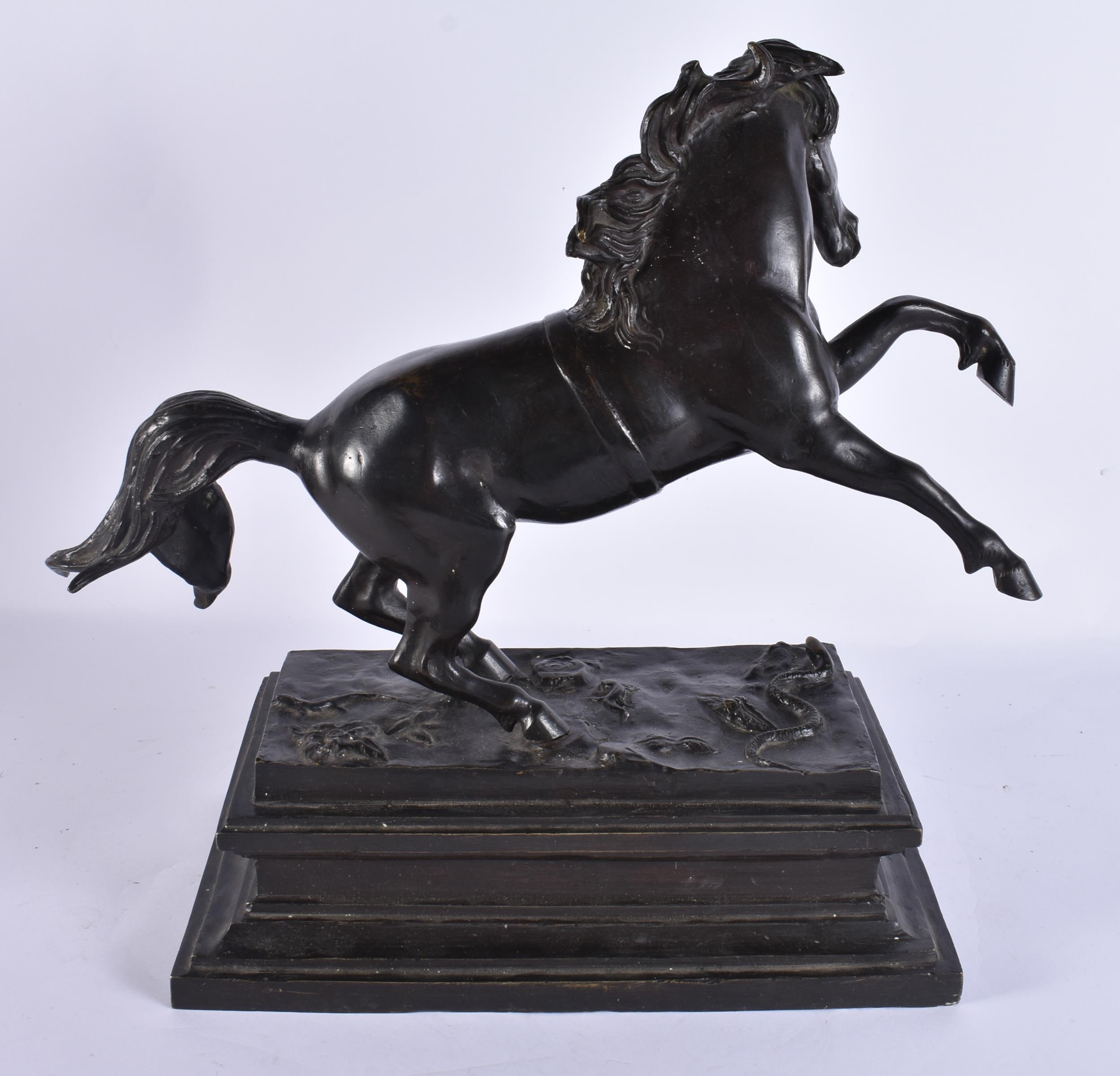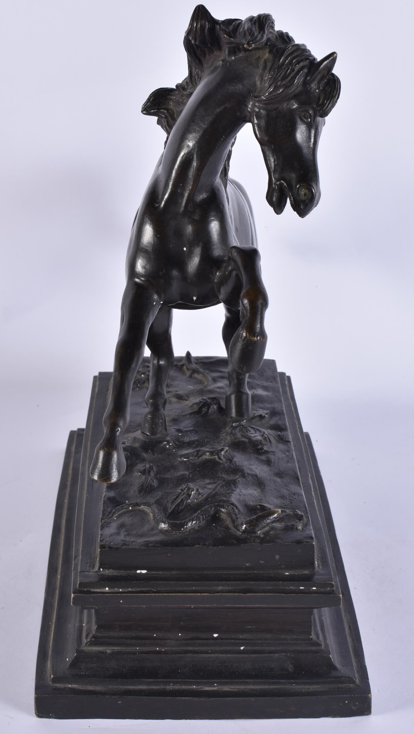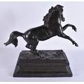 A LARGE 19TH CENTURY EUROPEAN GRAND TOUR BRONZE FIGURE OF A HORSE modelled rearing upon a rectangular base. 35 cm x 35 cm.