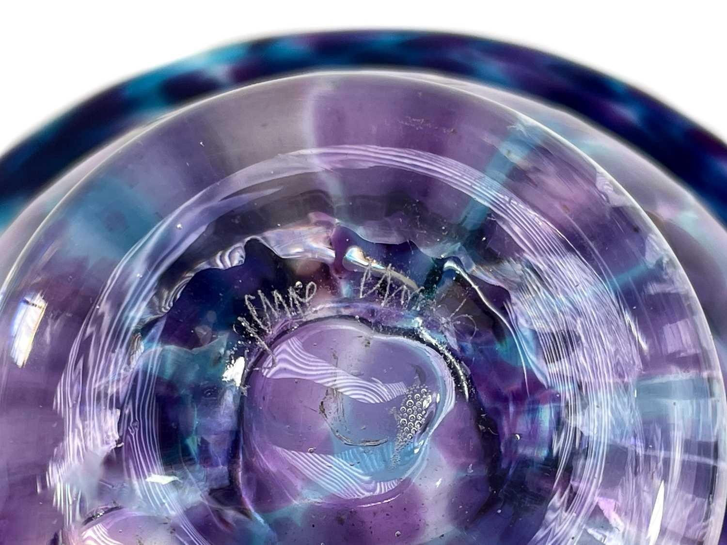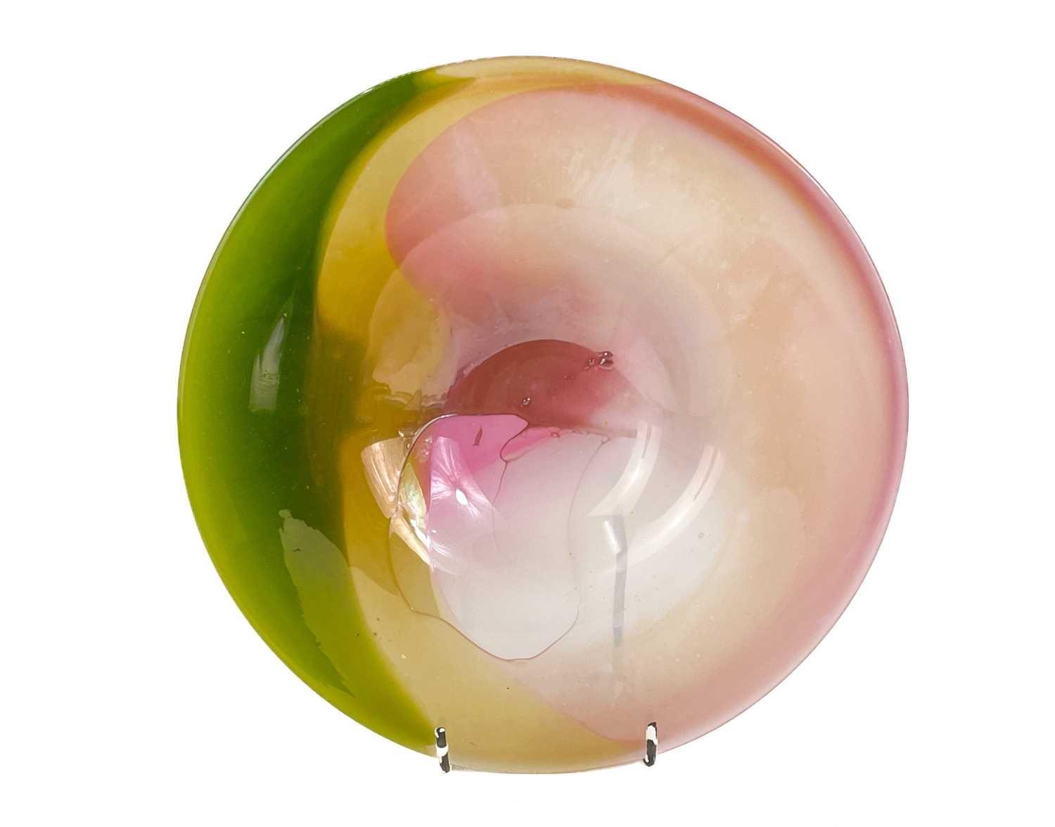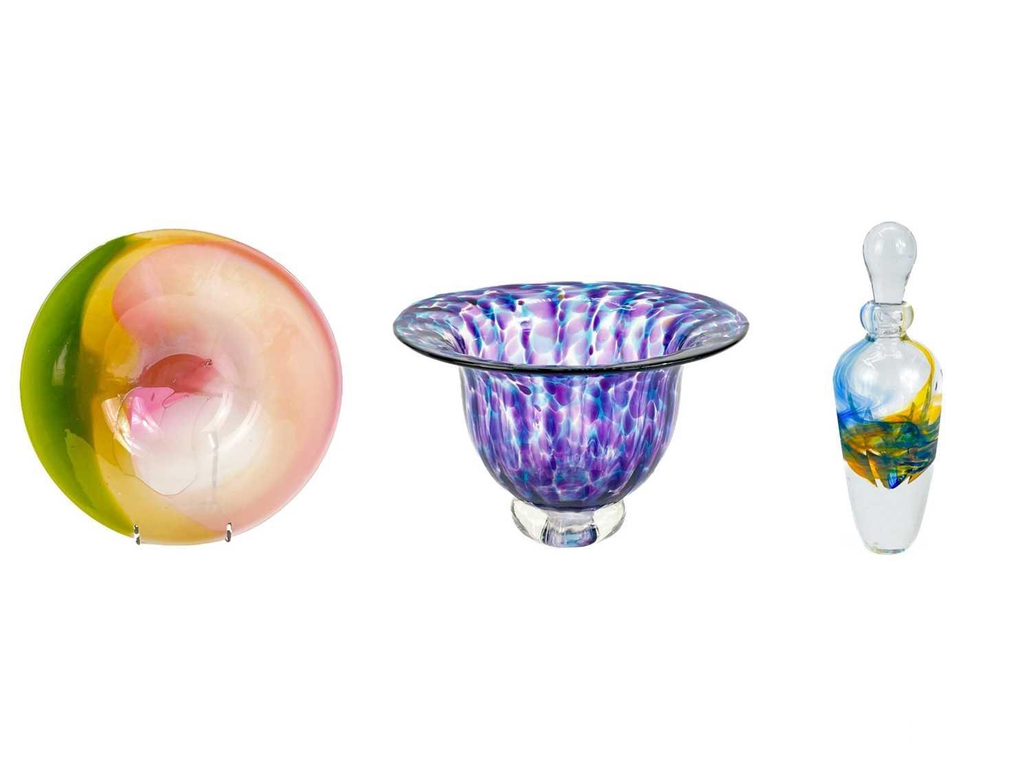 Jane Gilchrist studio glass dish. Signed and dated 75 to base, diameter 23cm together with a studio glass by Jane Charles indistinctly signed to base and a glass scent bottle by Jane Charles. (3) The dish has a few glass imperfections, but no damage. Jane Charles bowl, no damage, height 11cm, diameter 16cm. The scent bottle has a broken stopper, and a noticeable scratch, height of bottle 15cm.
