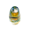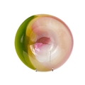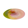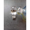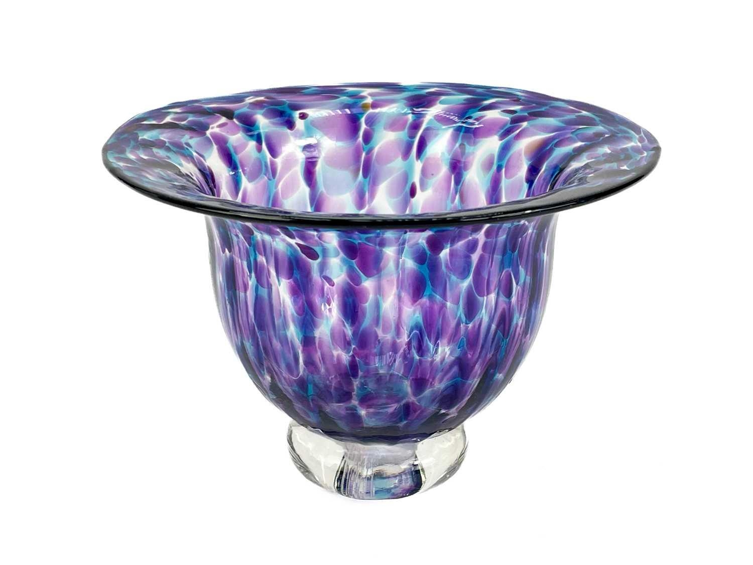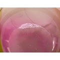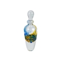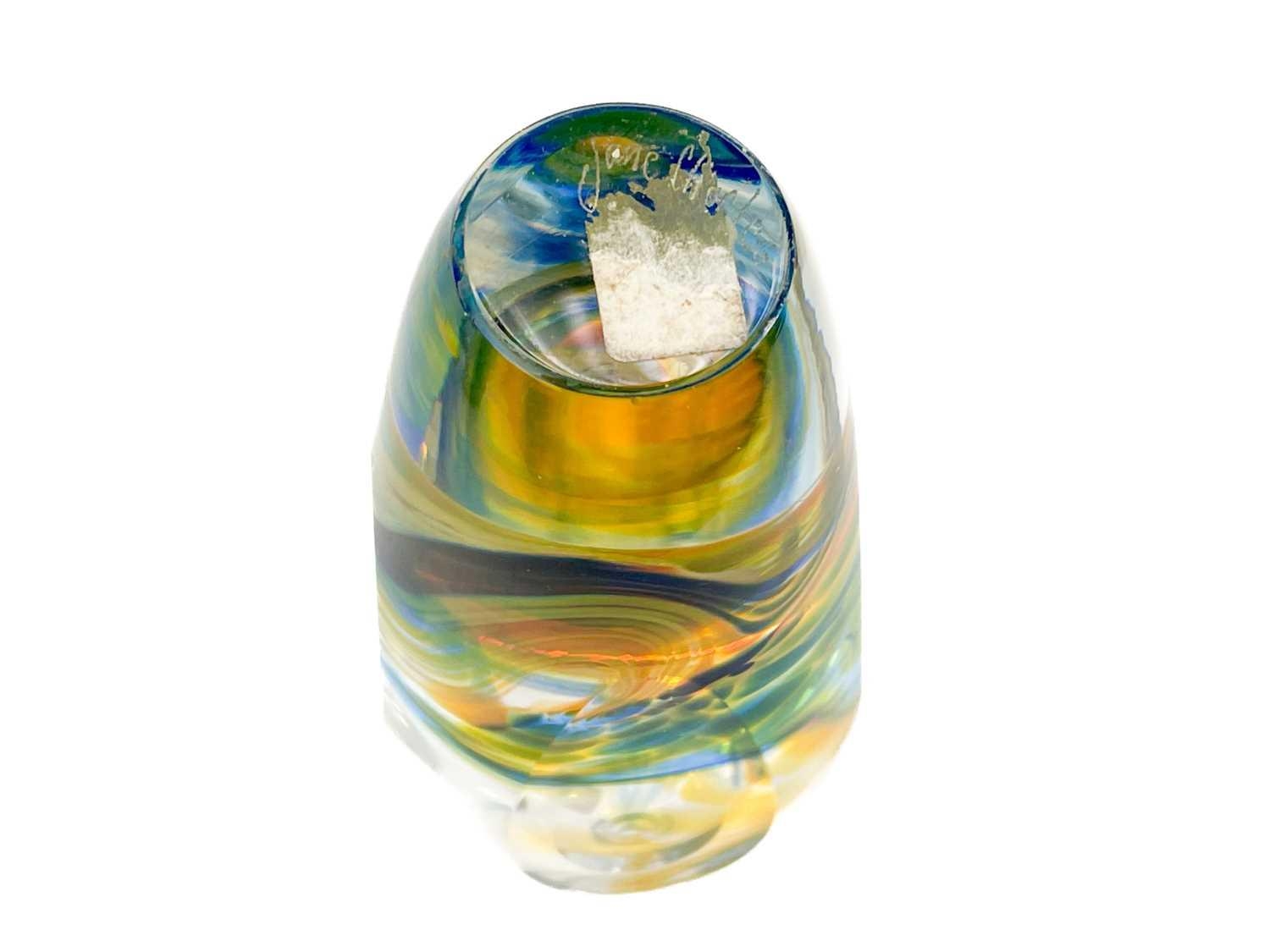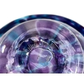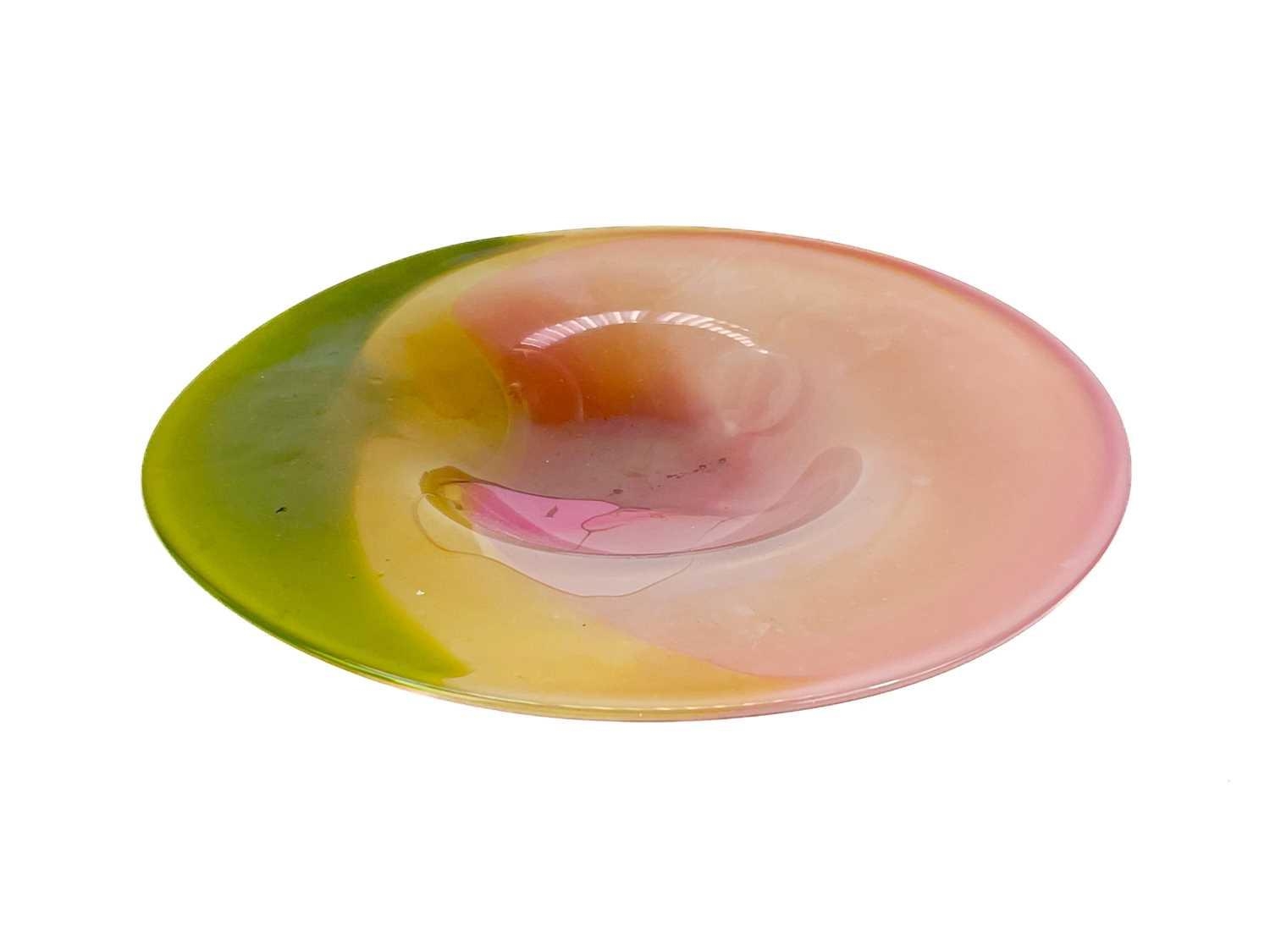 Jane Gilchrist studio glass dish. Signed and dated 75 to base, diameter 23cm together with a studio glass by Jane Charles indistinctly signed to base and a glass scent bottle by Jane Charles. (3) The dish has a few glass imperfections, but no damage. Jane Charles bowl, no damage, height 11cm, diameter 16cm. The scent bottle has a broken stopper, and a noticeable scratch, height of bottle 15cm.