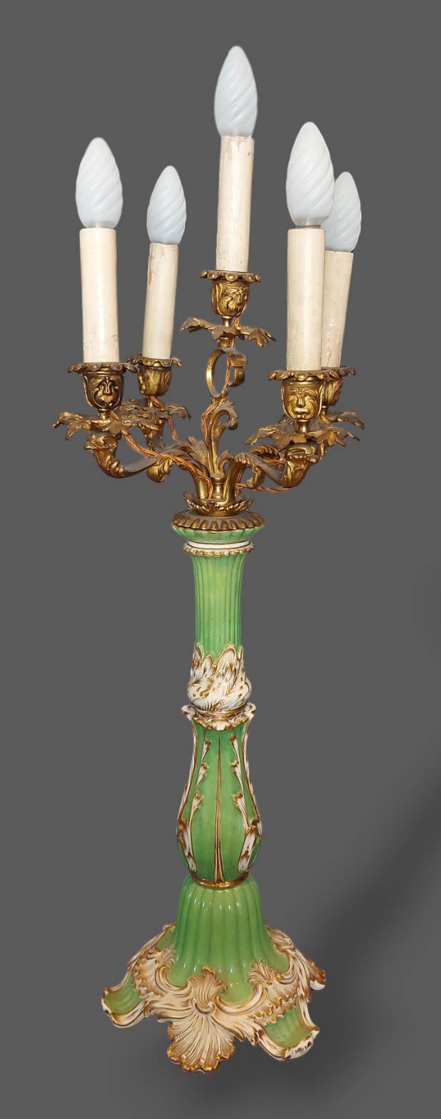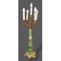 A 19th Century French Ormolu and porcelain five branch candelabrum of scroll form, the green and gilded column with shaped scroll base, 79cms tall