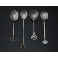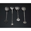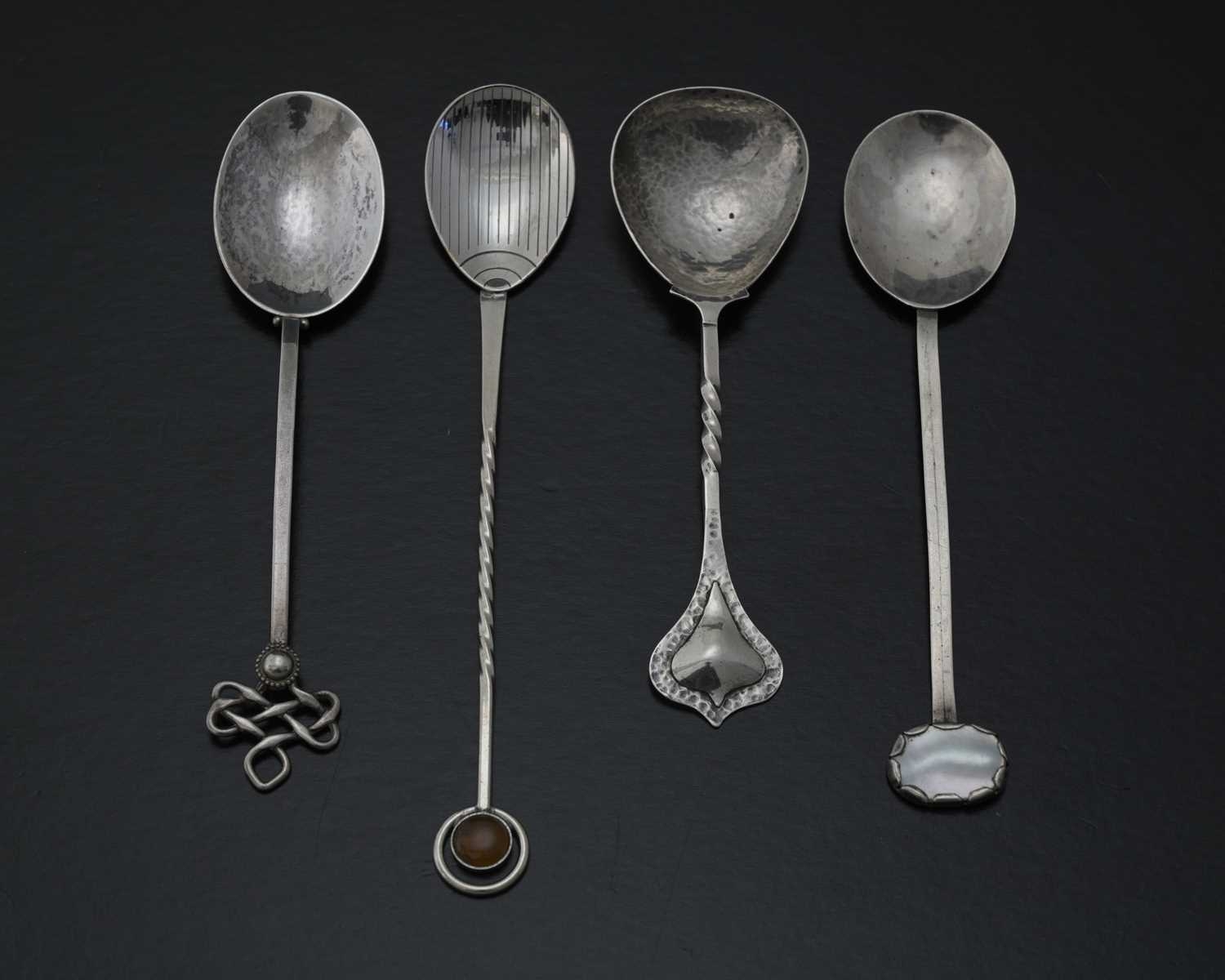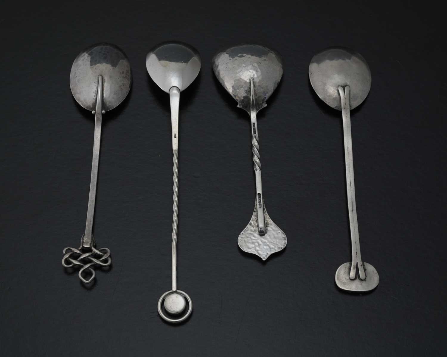 Four early twentieth-century Arts and Crafts style spoons, to include one marked 'SARGISON' 'SILVER', with a planished bowl and twisted stem, length 12.7cm, the others apparently unmarked, combined weight 76g/2.44ozt all-in approx (4)
