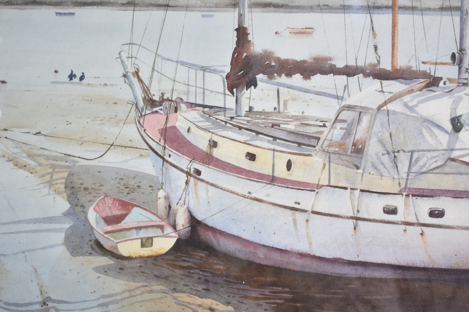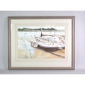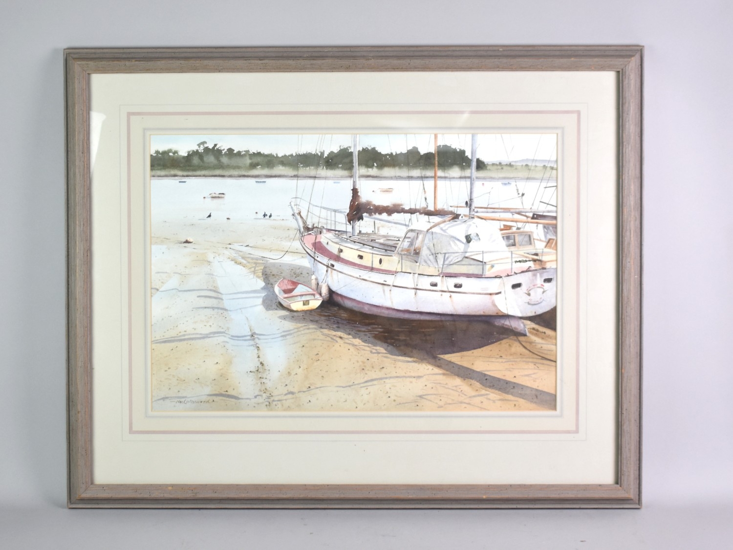 A Framed Neil Westwood Watercolour of Sailing Yacht and Tender at Low Tide, 52x35cms