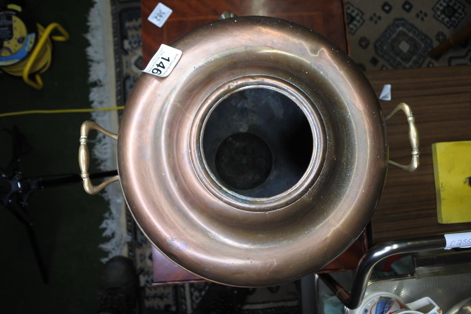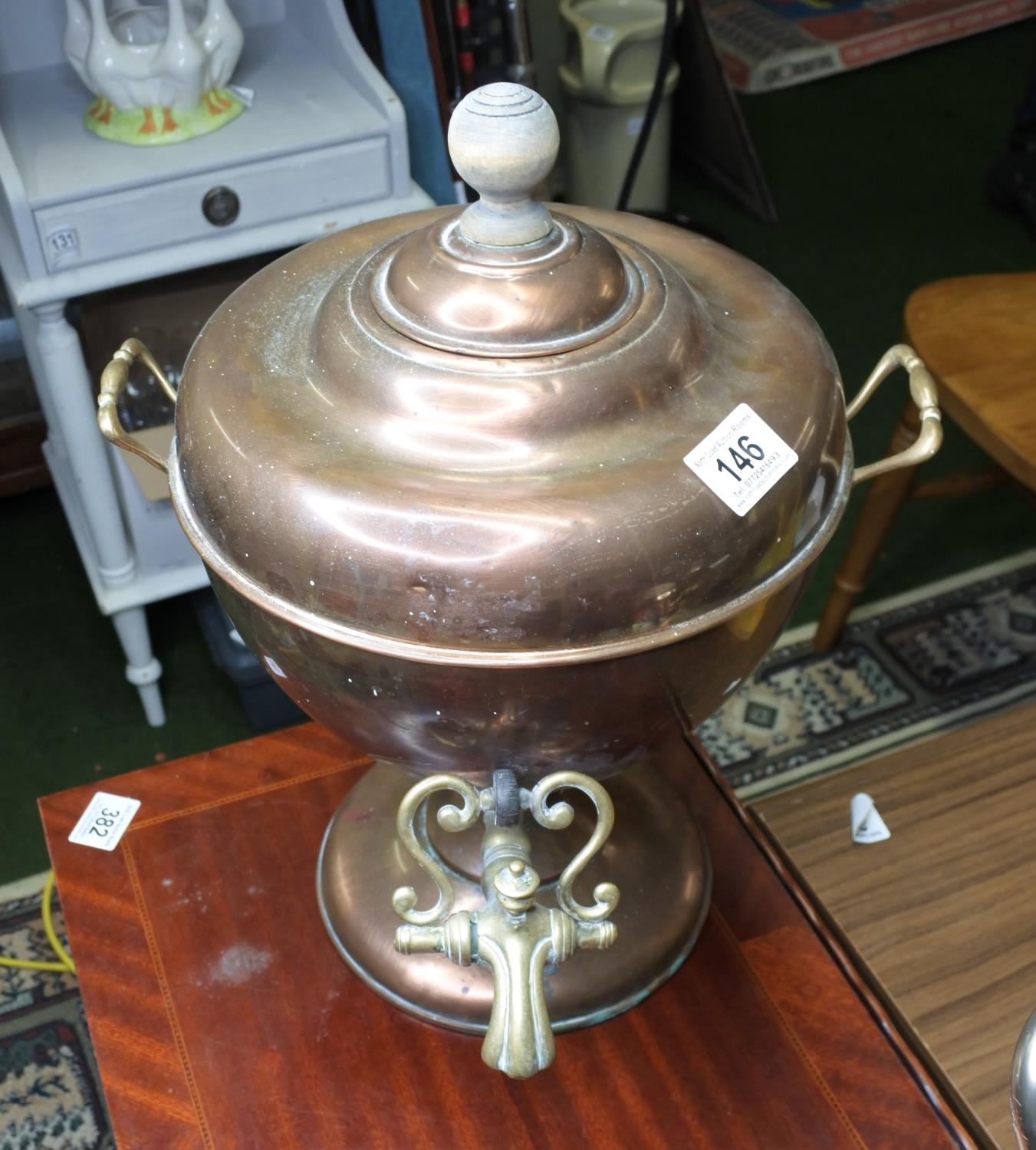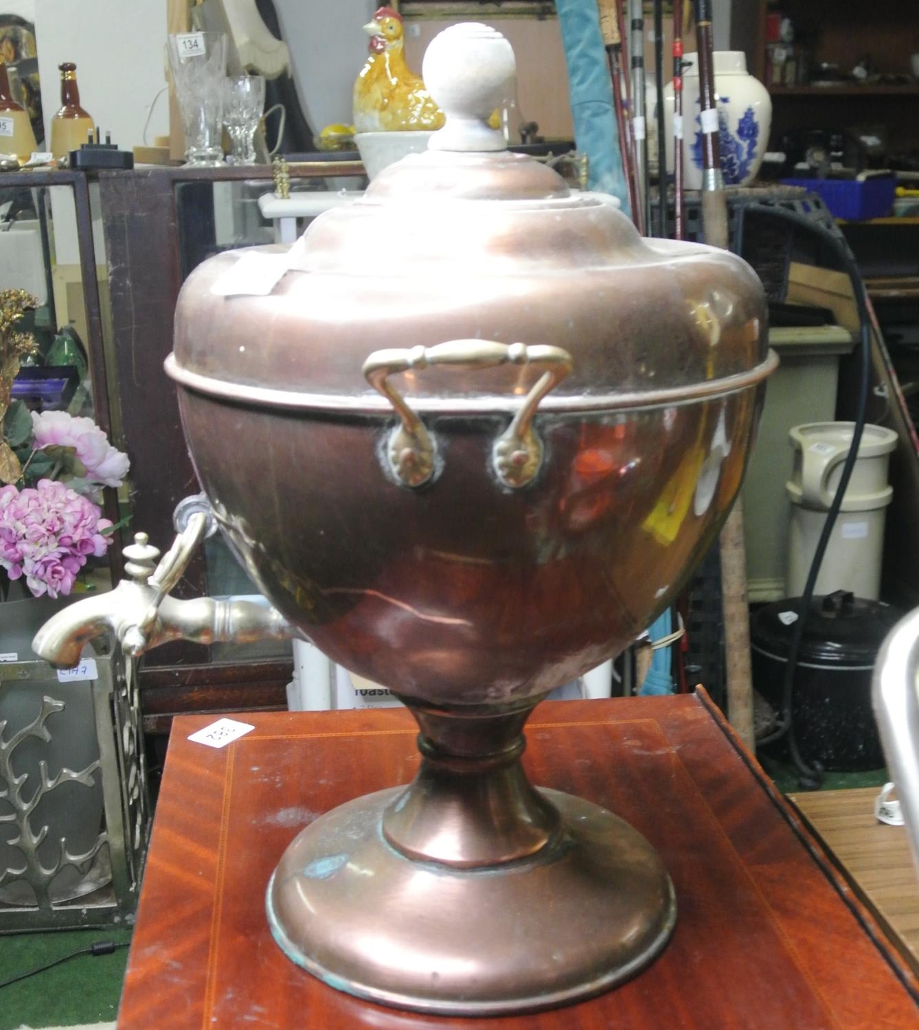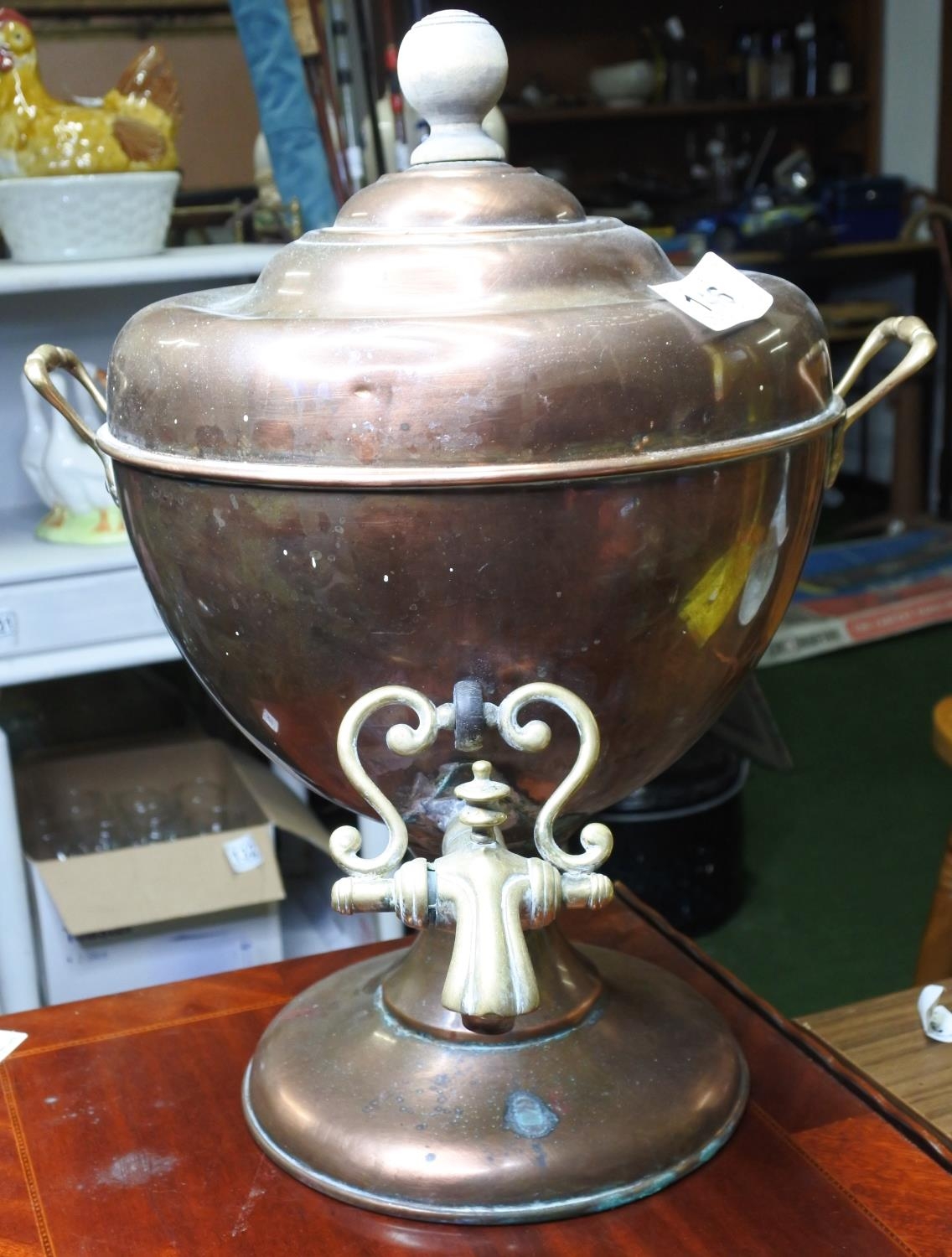 An antique / vintage copper and brass samovar / drinks dispenser.
