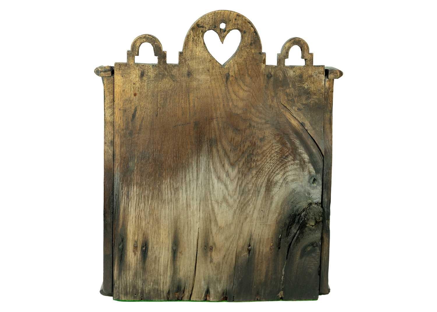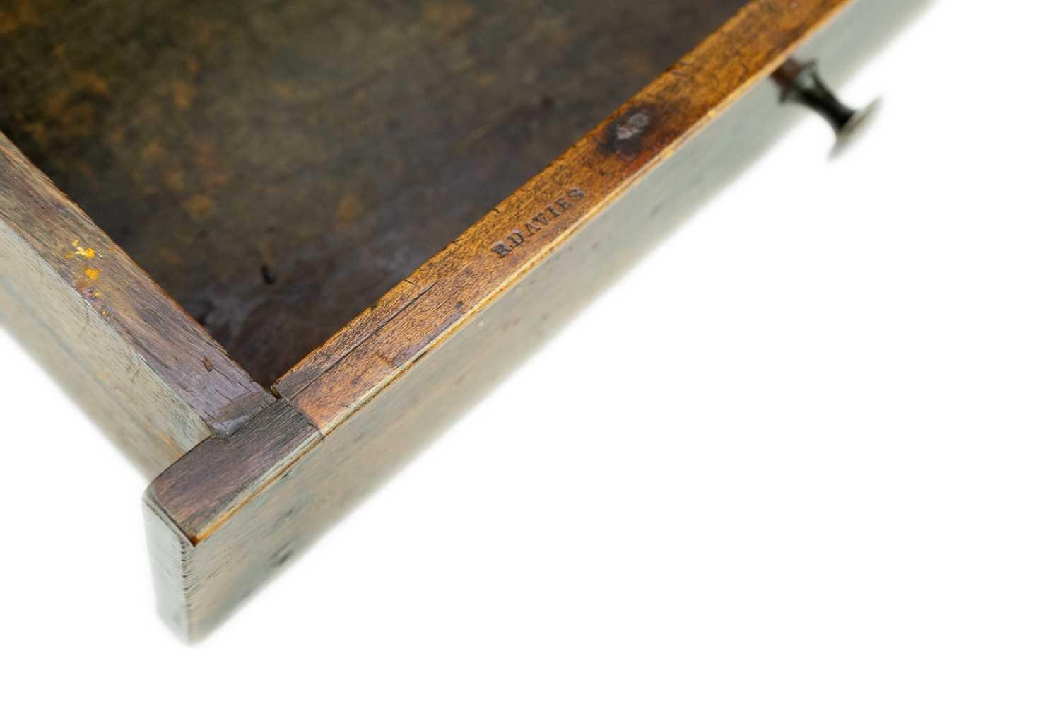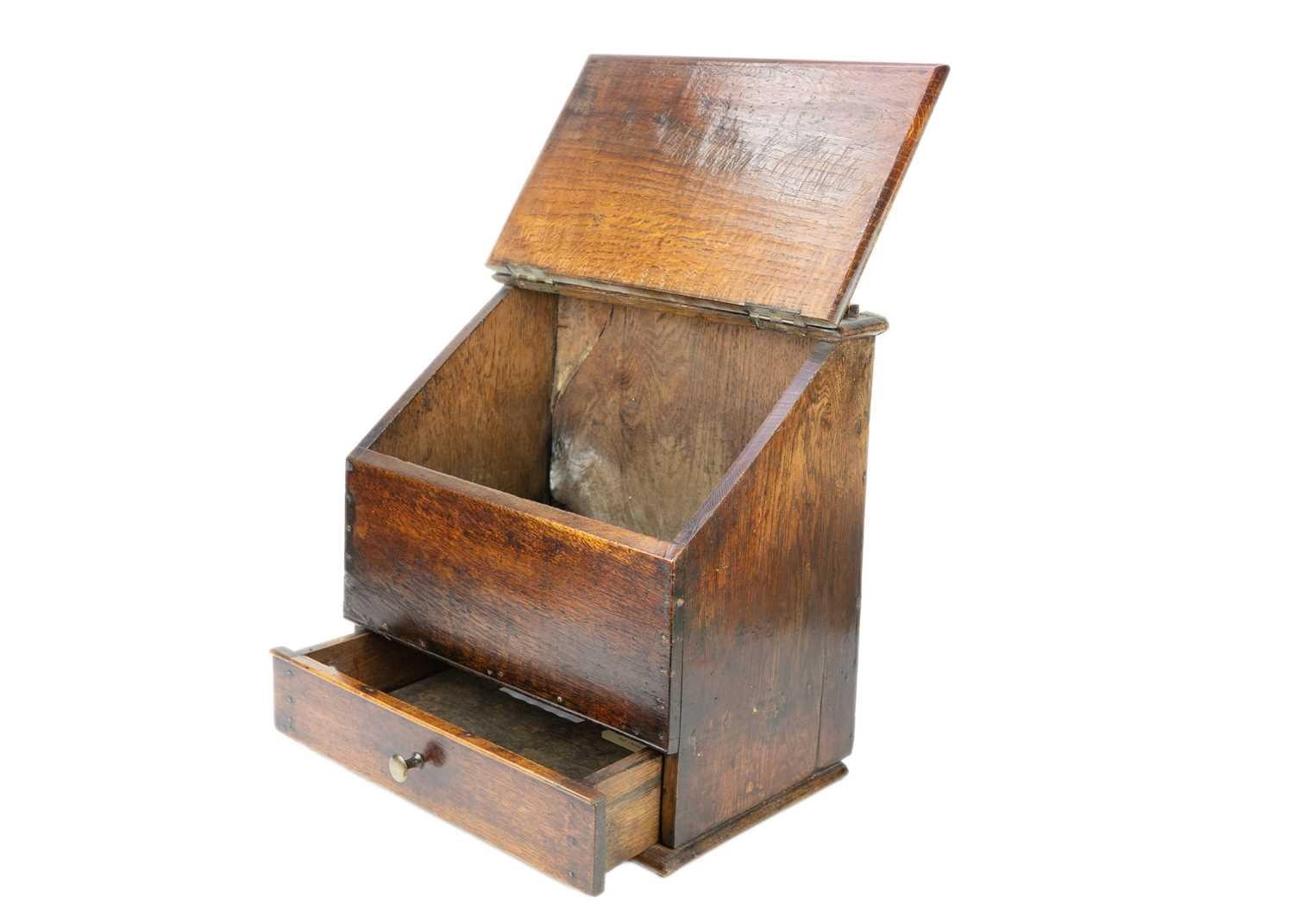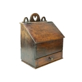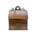 A late 18th century oak deed box. With carved gallery above a hinged slope front over a single drawer, stamped D D and R Davies, height 47cm width 38cm depth 23.5cm.