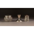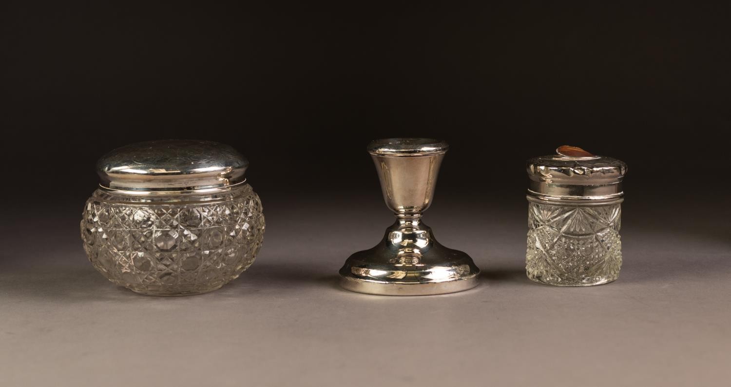 CUT GLASS POWDER BOWL WITH FOLIATE SCROLL CHASED PULL-OFF COVER, marks rubbed, together with a SIMILAR SMELLING SALTS BOTTLE WITH TORTOISESHELL INLAID DISC TO THE ELECTROPLATED COVER, and a WEIGHTED SILVER CANDLE HOLDER BY A.L. DAVENPORT, Birmingham 1960, (3)