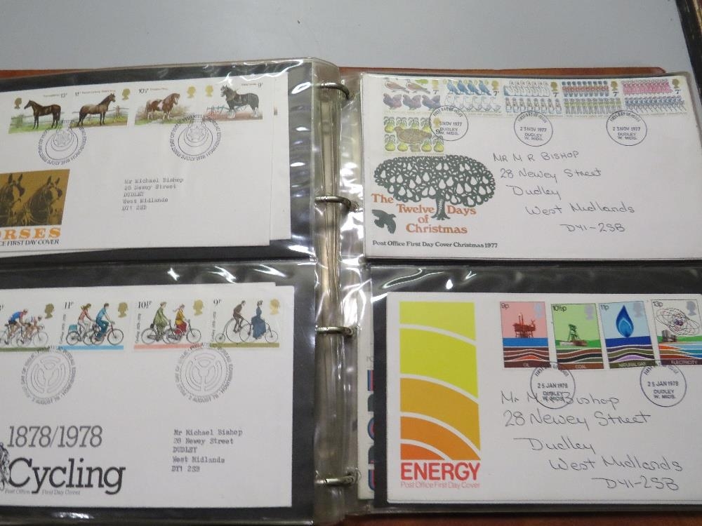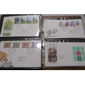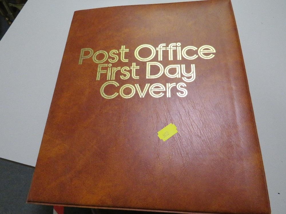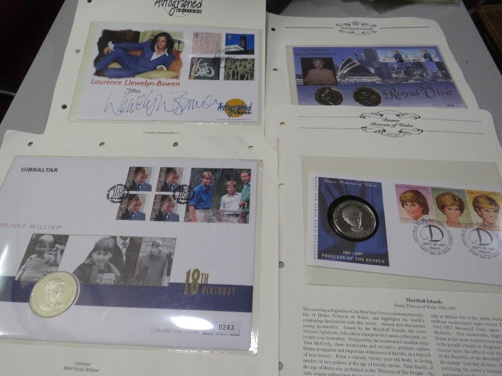 AN ALBUM OF POST OFFICE FIRST DAY COVERS, TOGETHER WITH THREE COMMEMORATIVE COINS AND STAMPS FIRST DAY COVERS AND AN AUTOGRAPHED EDITION (APPROX 55)