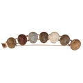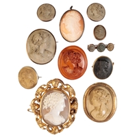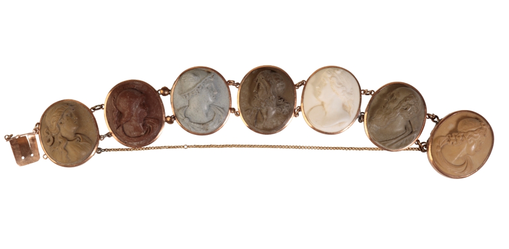 A LAVA STONE BRACELET, seven various cameos, set in unmarked yellow metal, double chain linked with a concealed clasp, and attached safety chain