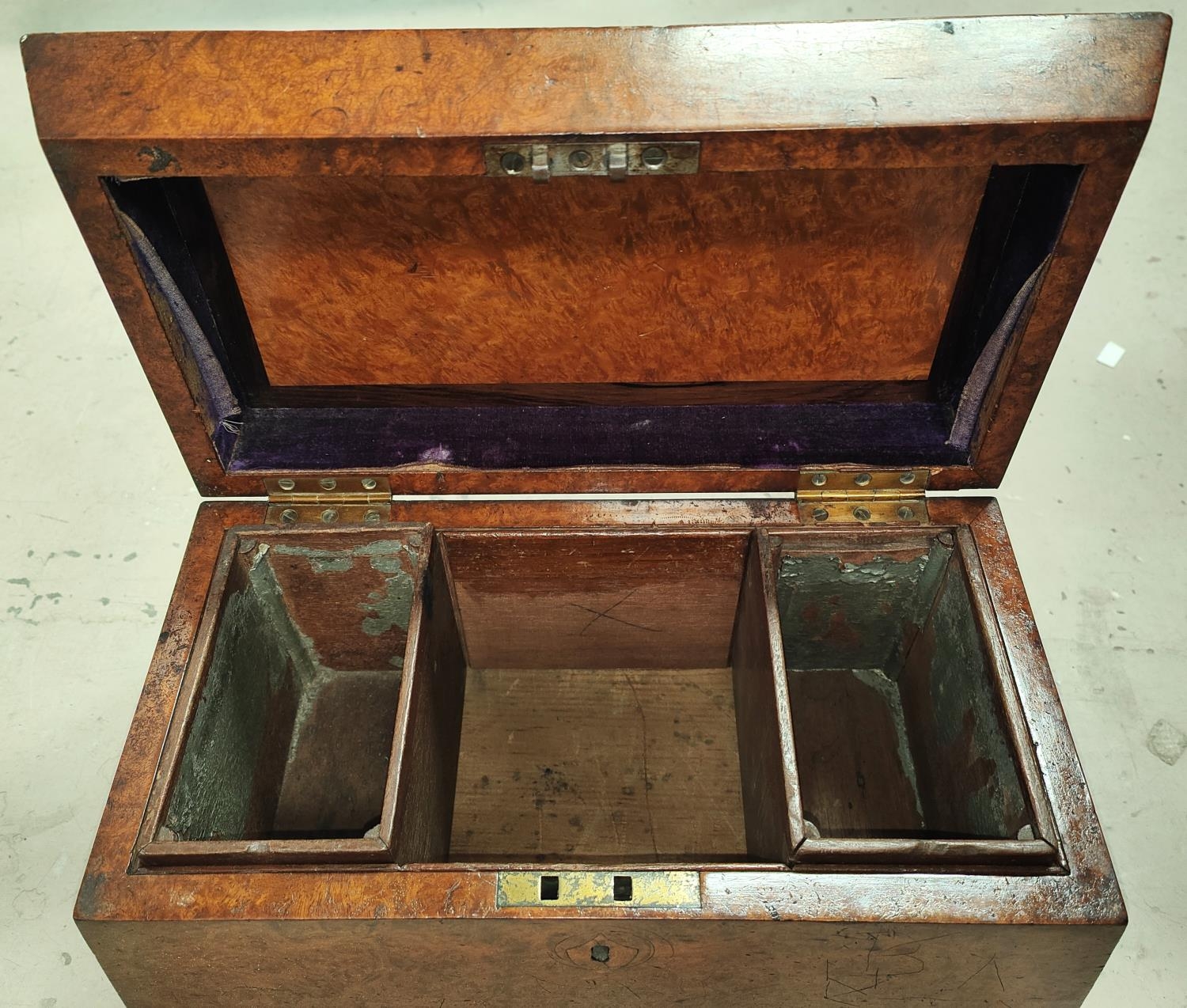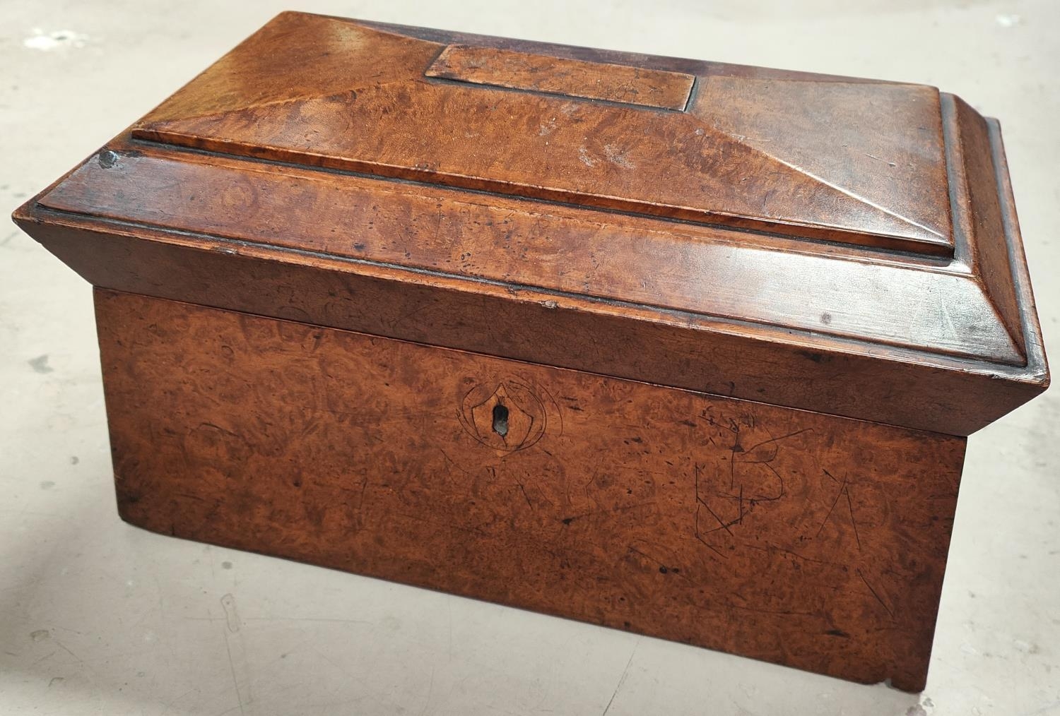 A large Birds Eye Maple tea caddy with three interior compartments.