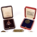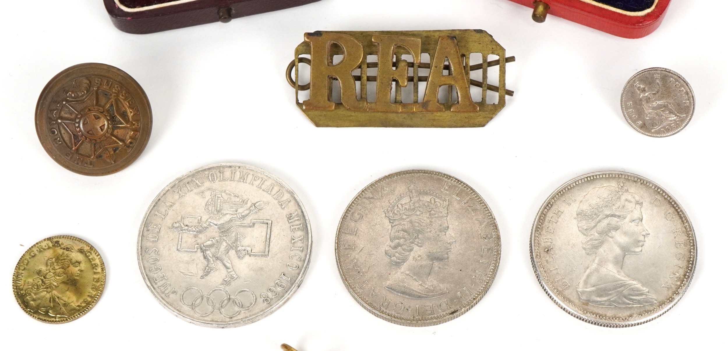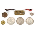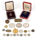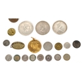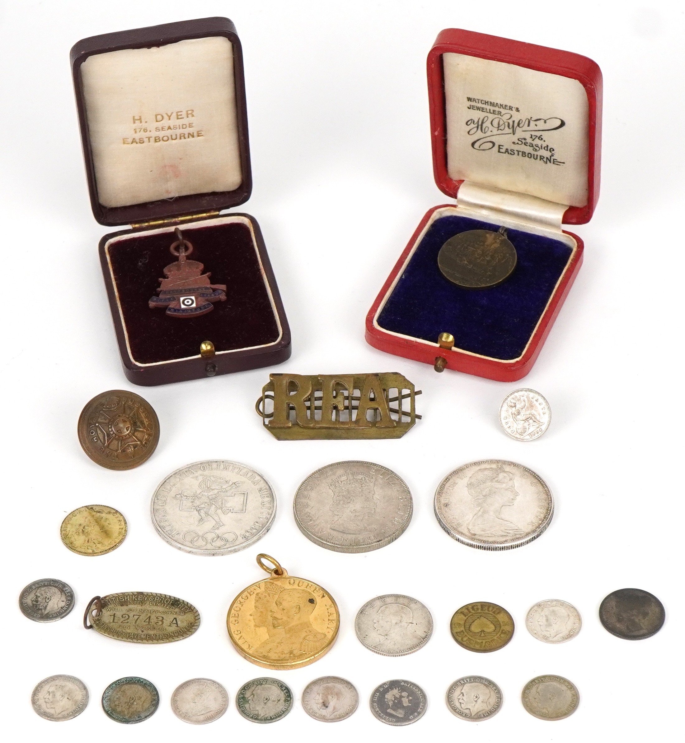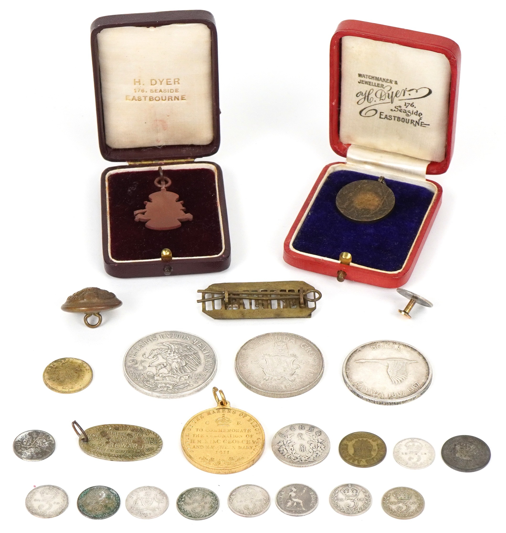 A collection of antique and later world coins and medallions, some silver, including Chinese coins, an Eastbourne Rifle League jewel and a Canadian dollar.