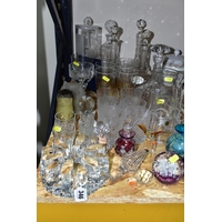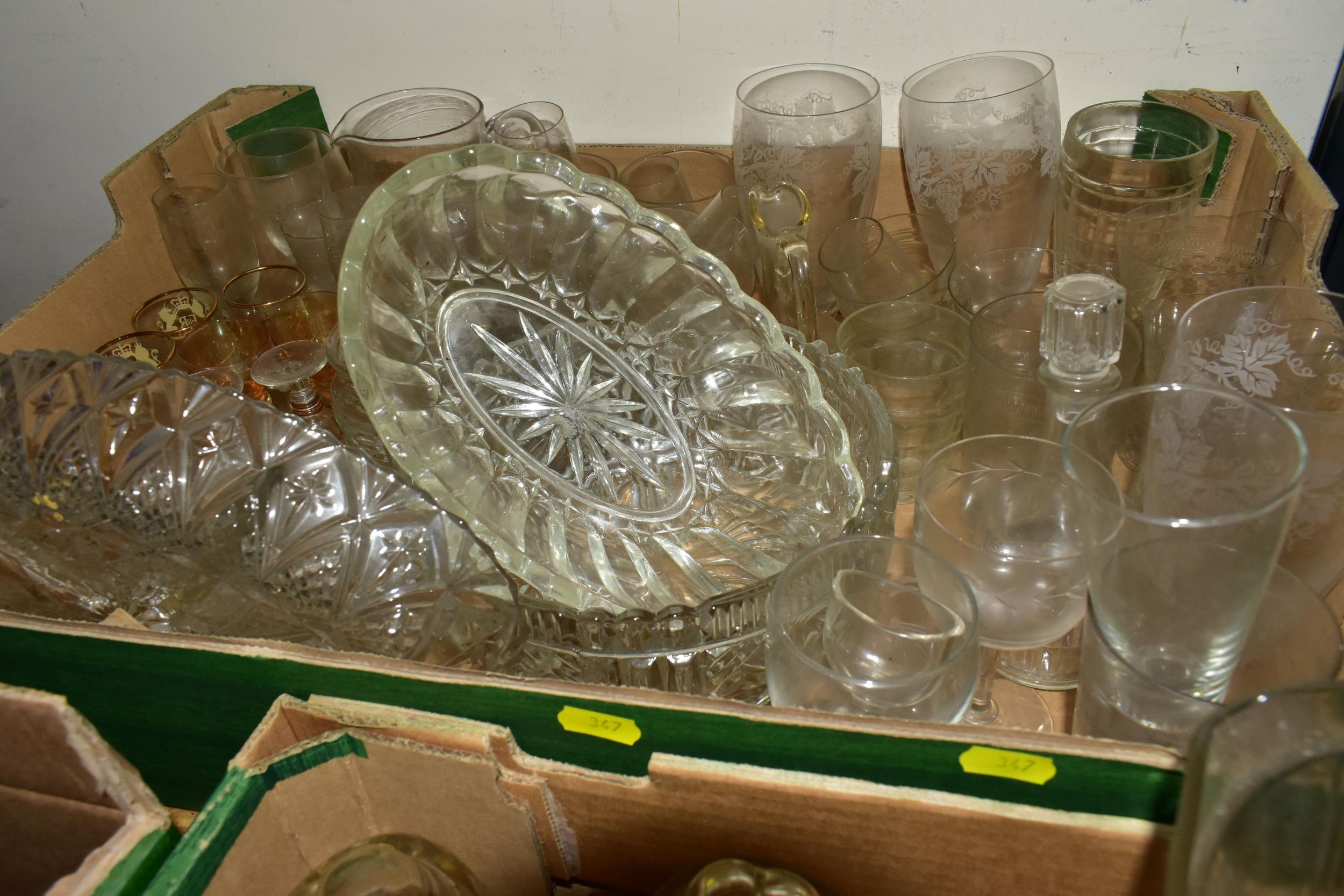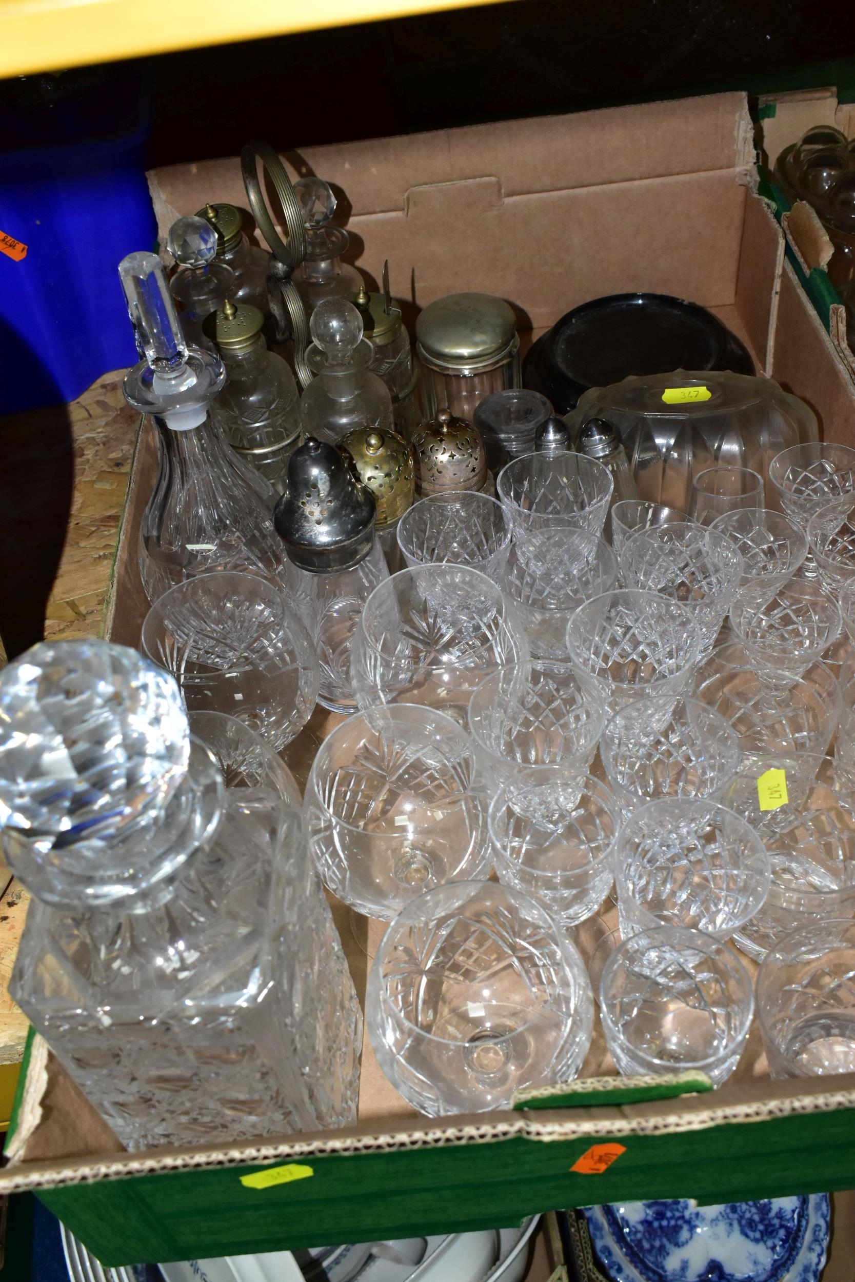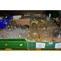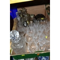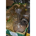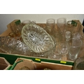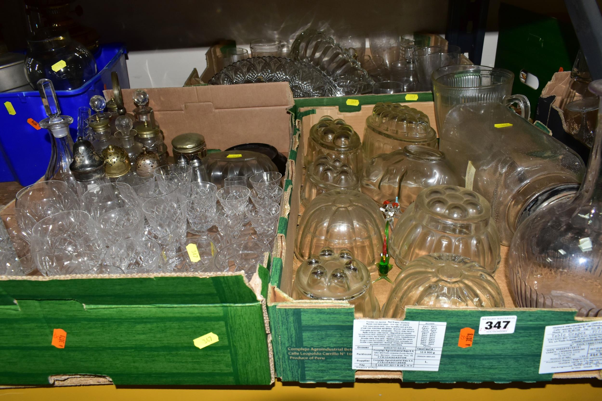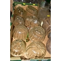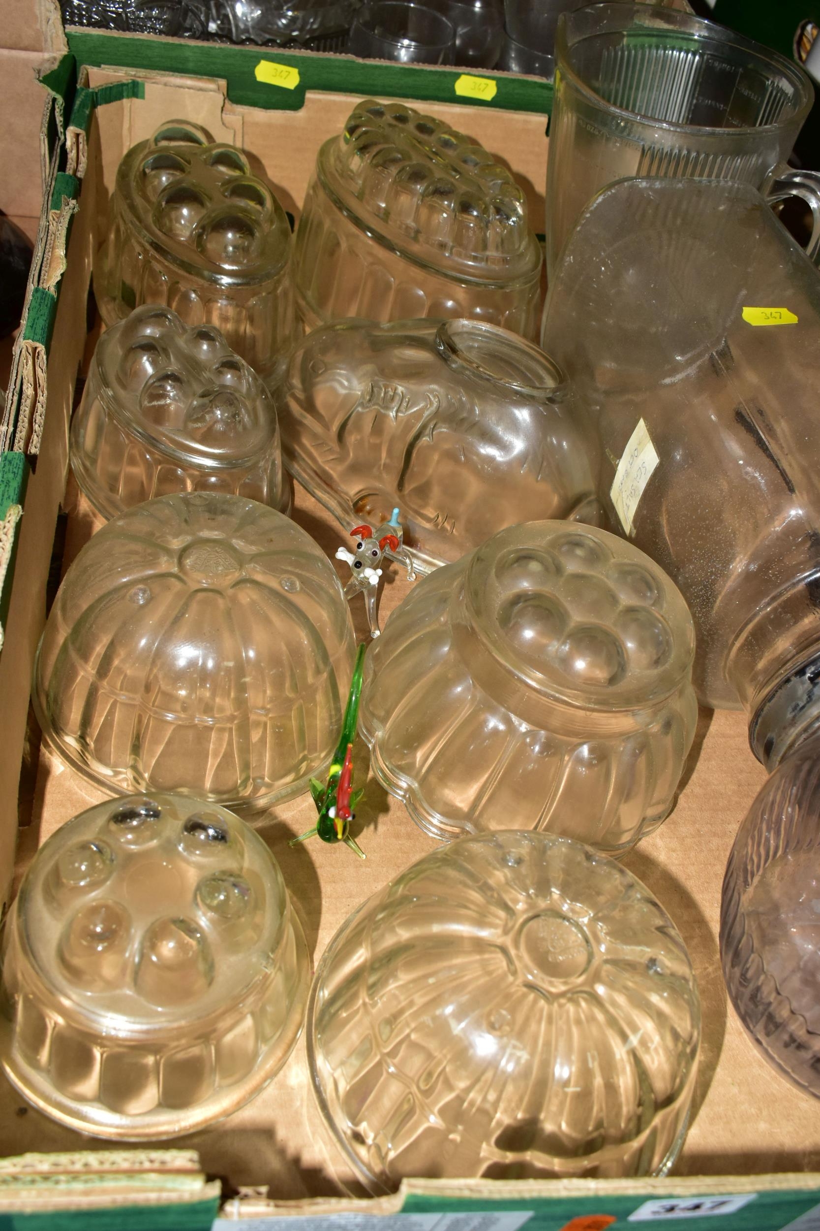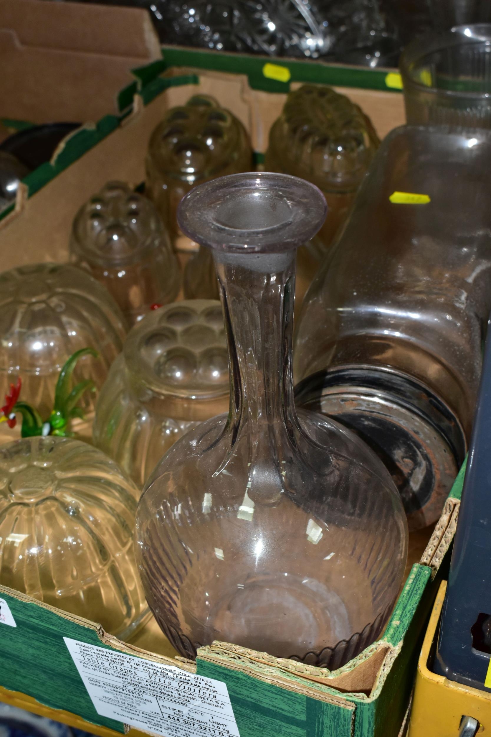 THREE BOXES OF GLASSWARES, to include nine clear glass jelly moulds, pressed glass fruit bowls, a lamp work cockerel and dog, a square cut crystal decanter, three cut glass sugar sifters, a cut glass cruet set, whisky tumblers, wine glasses, etc. (s.d) (3 boxes)